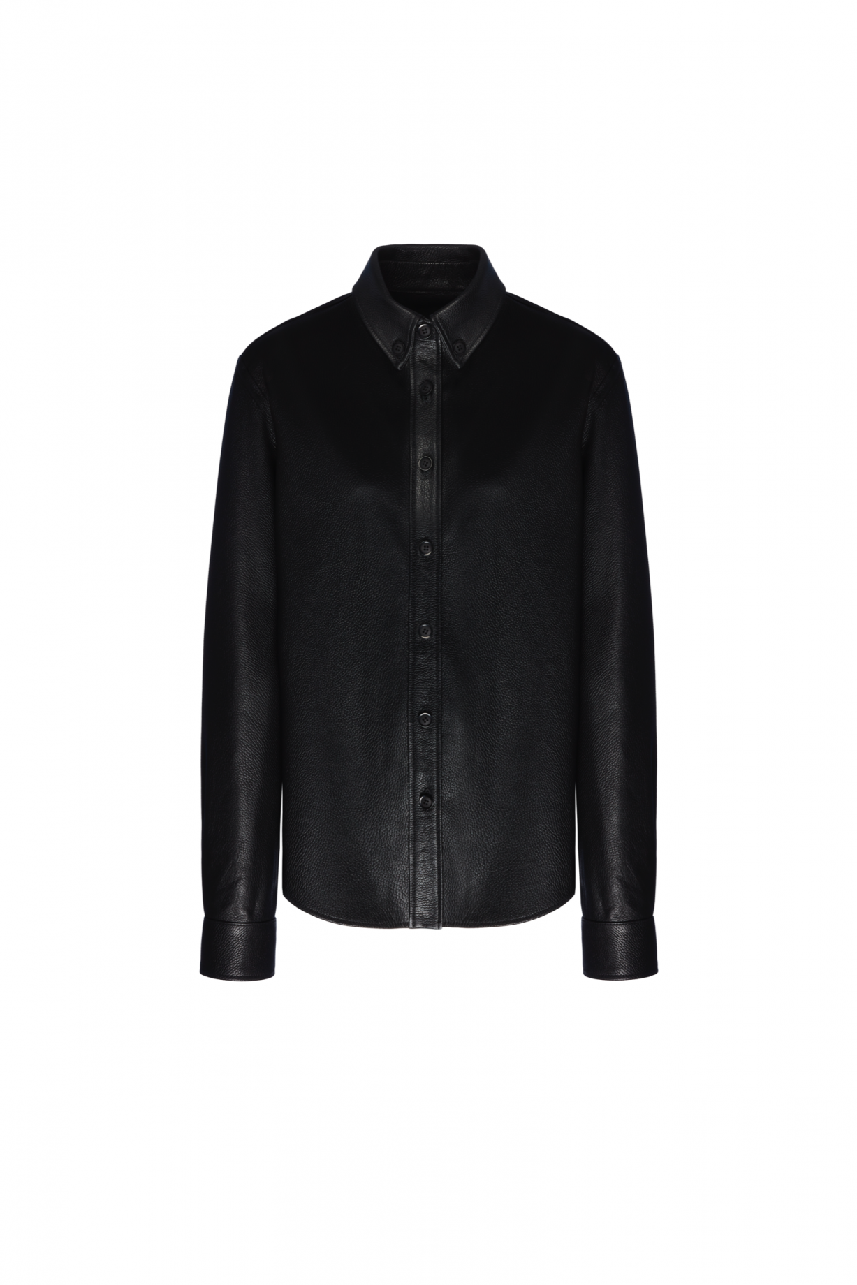 Кожаная куртка-рубашка черного цвета. Для пошива изделия использовали плотную, зернистую,матовую кожу с фактурной поверхностью. Модель «oversize” кроя с отложным воротником.Состав: 100% натуральная кожа