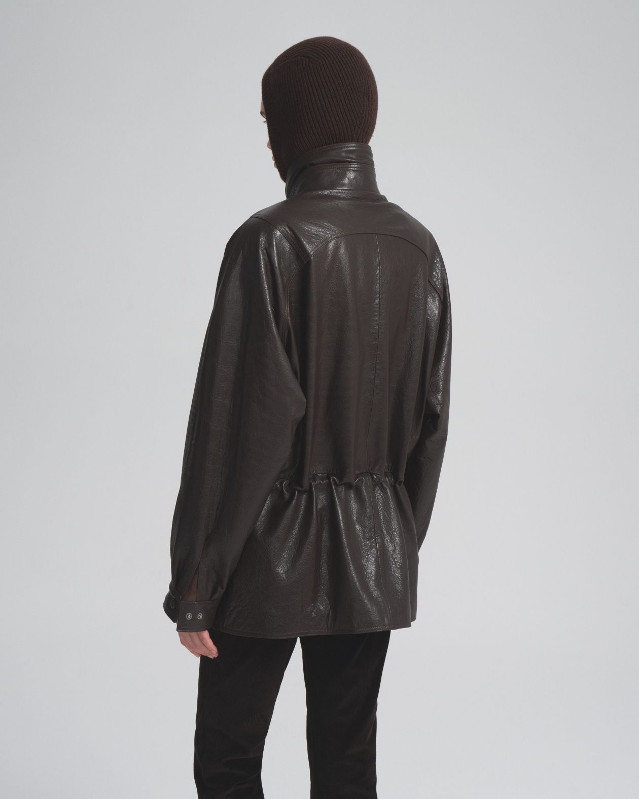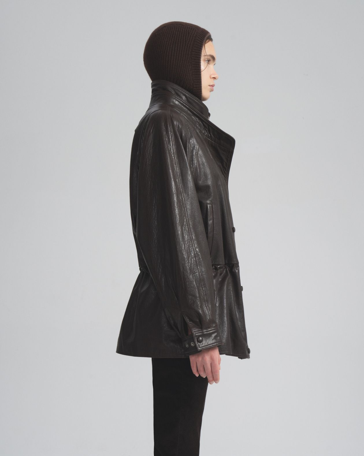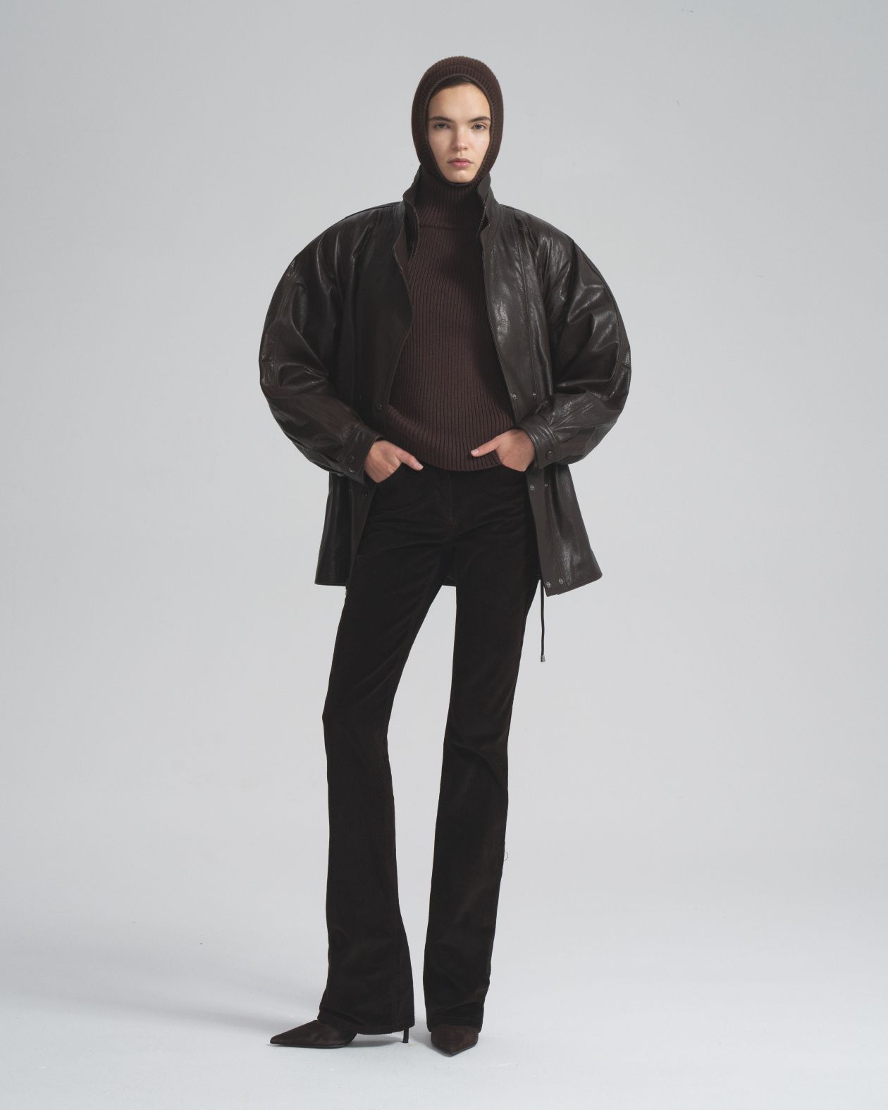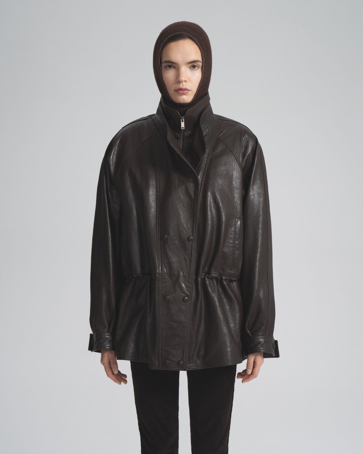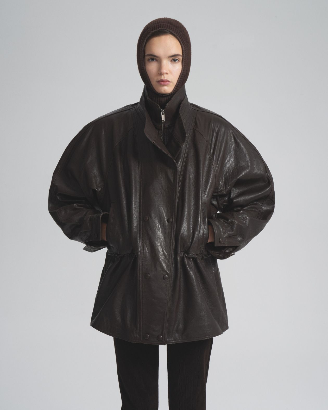 Объемный жакет ручной работы из мягкой винтажной кожи премиального качества с акцентными плечами, рукав-реглан и заниженной талией в стиле 80-х. Двойной воротник, обтянутые кожей пуговицы и широкие рукава дополняют характерный крой.Состав: 100% натуральная кожа