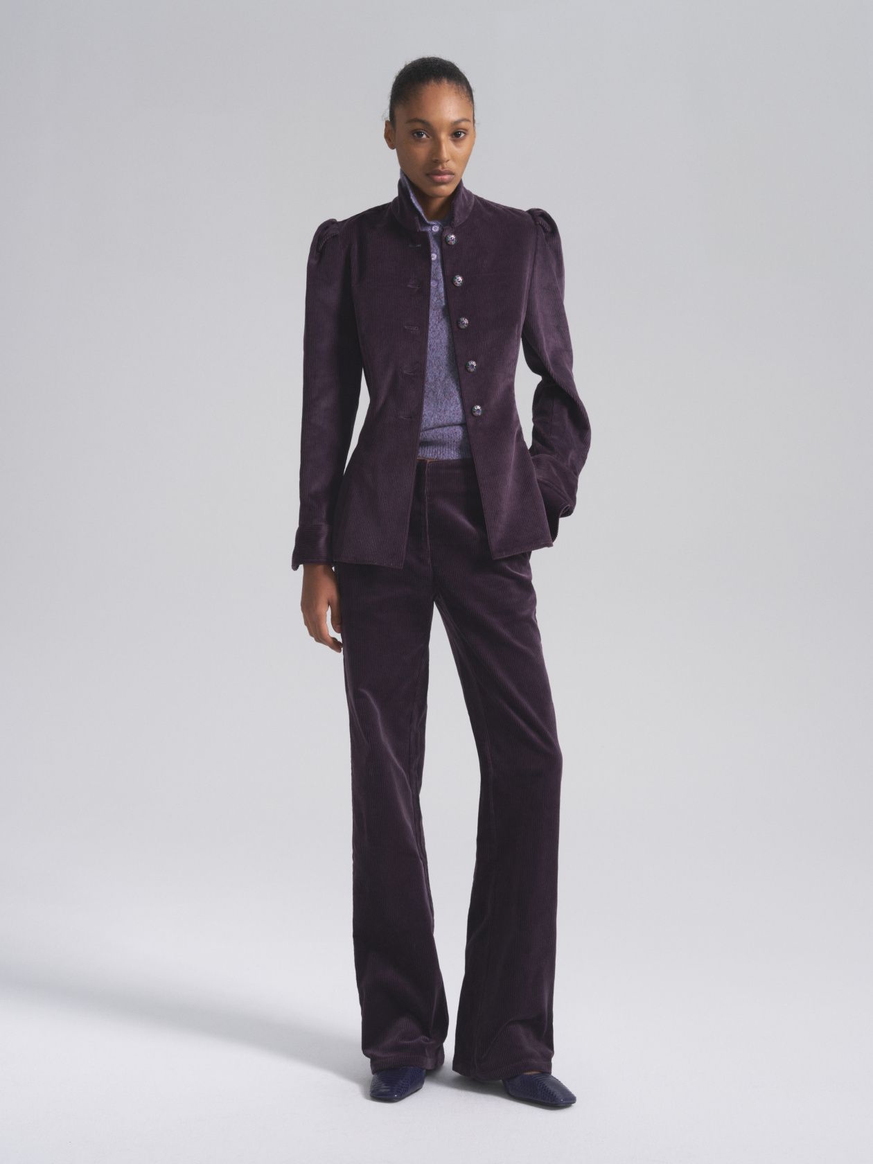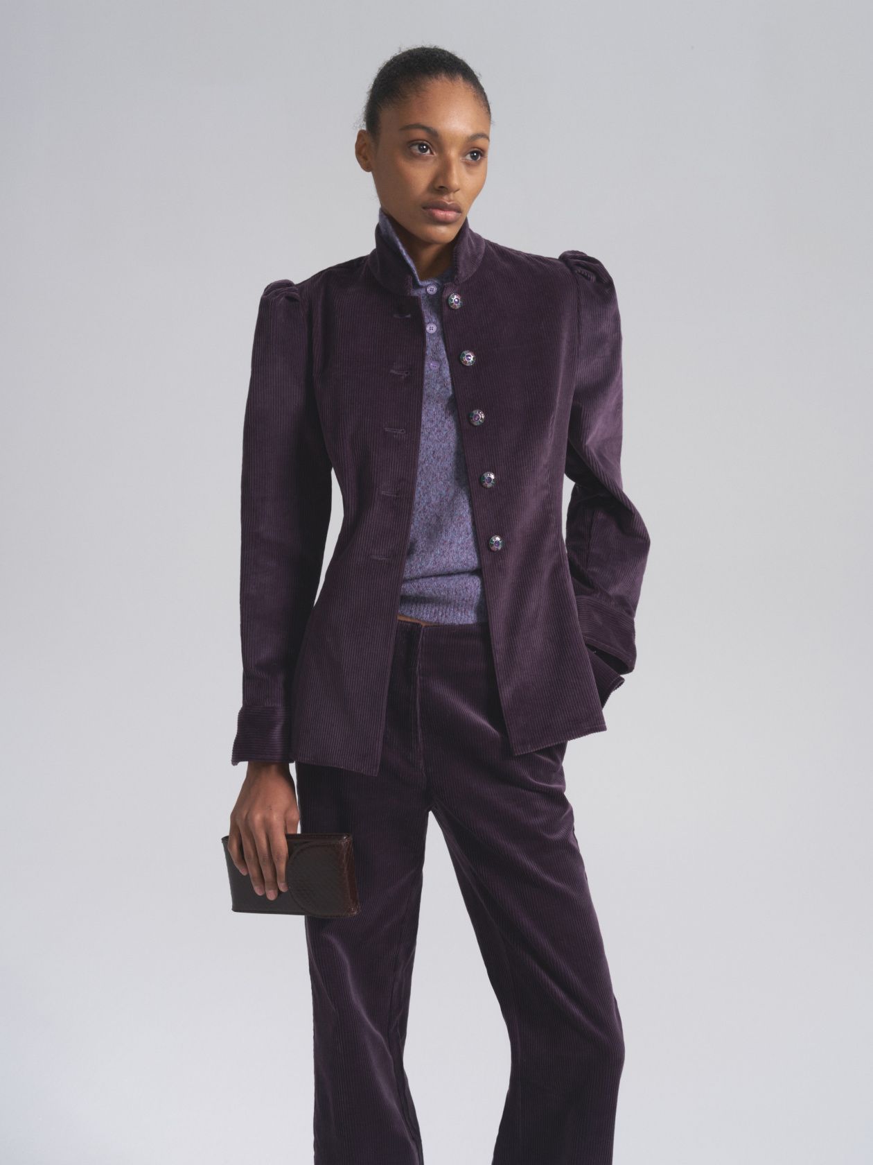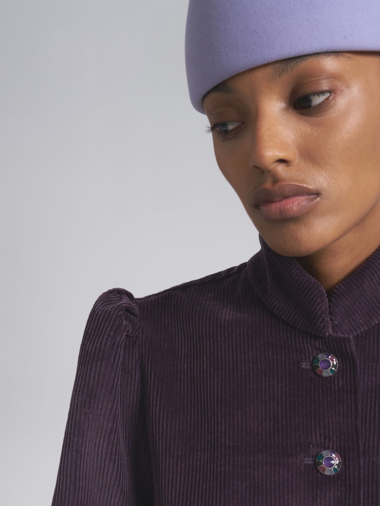 Вельветовый жакет с воротником-стойкой и винтажными пуговицами ручной работы. Приталенный крой подчеркивает изгиб талии и визуально стройнит. Витражные пуговицы становятся ювелирным акцентом образа и придают жакету винтажный шарм.
