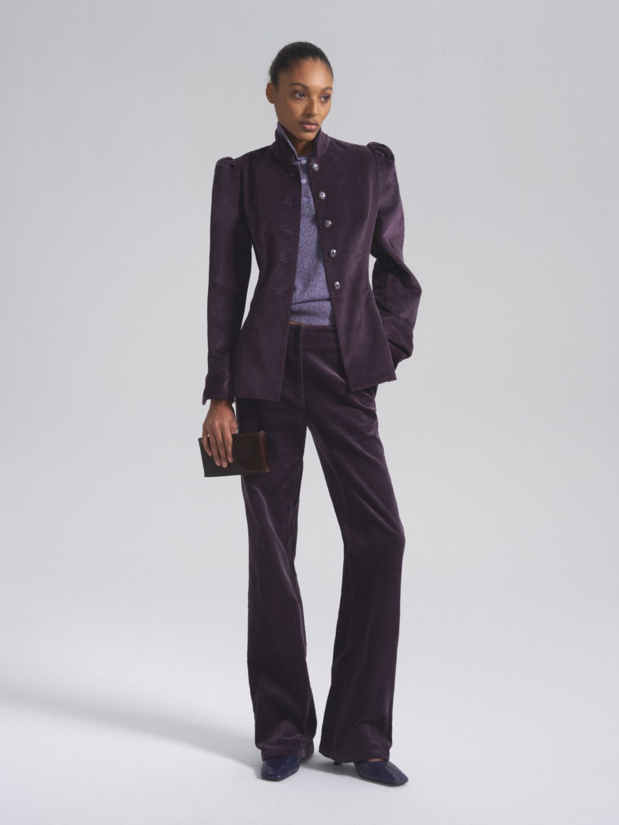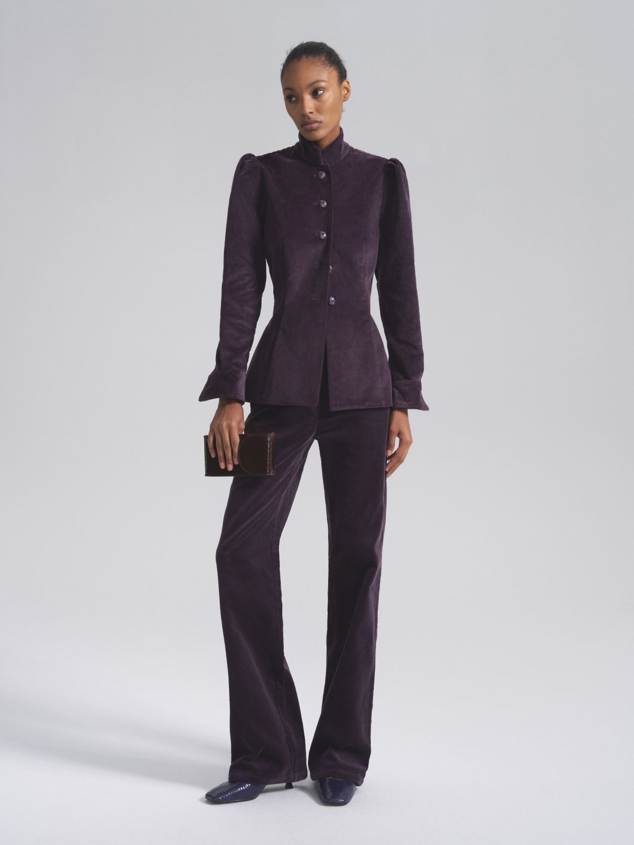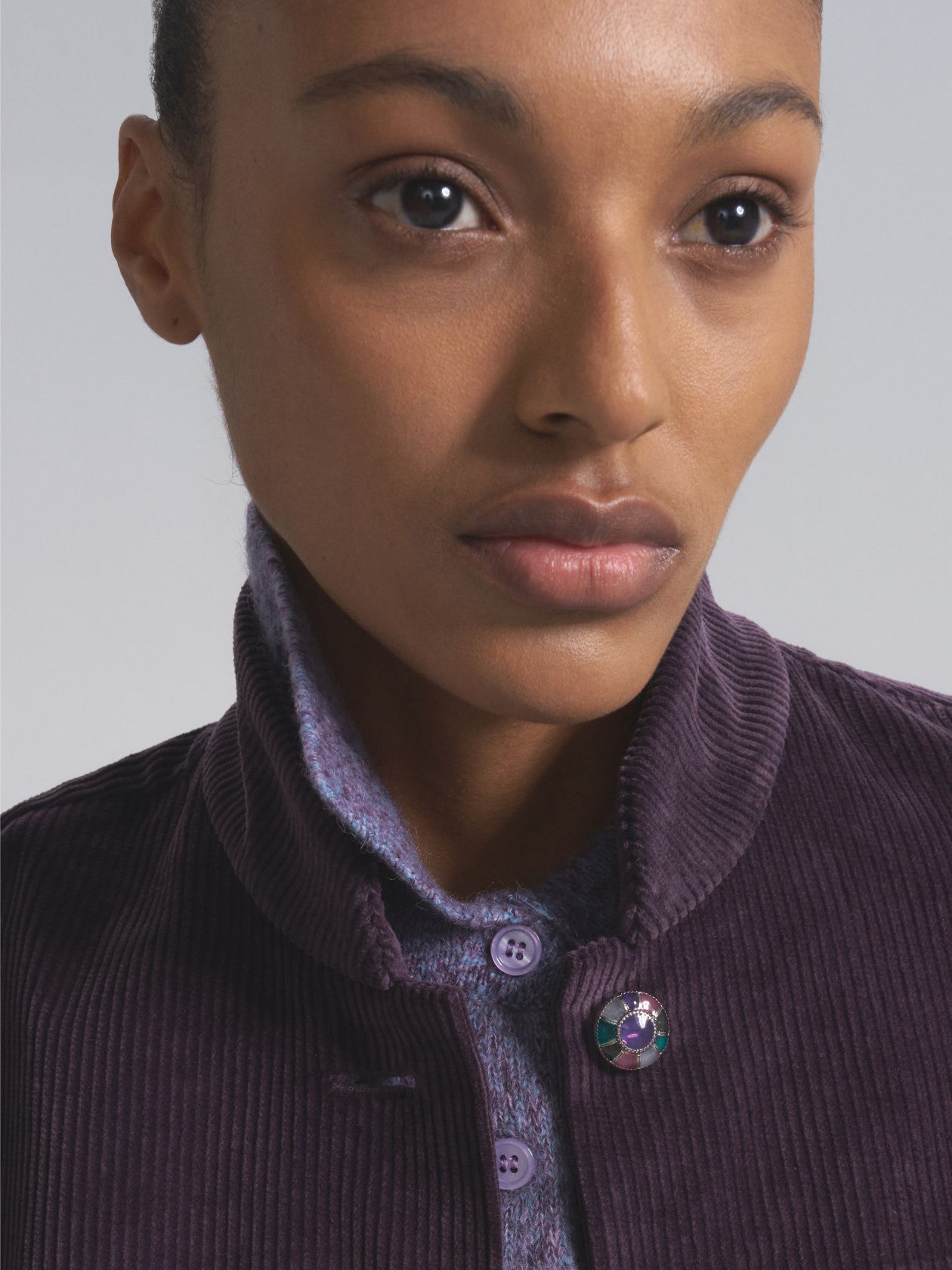 Вельветовый жакет с воротником-стойкой и винтажными пуговицами ручной работы. Приталенный крой подчеркивает изгиб талии и визуально стройнит. Витражные пуговицы становятся ювелирным акцентом образа и придают жакету винтажный шарм.