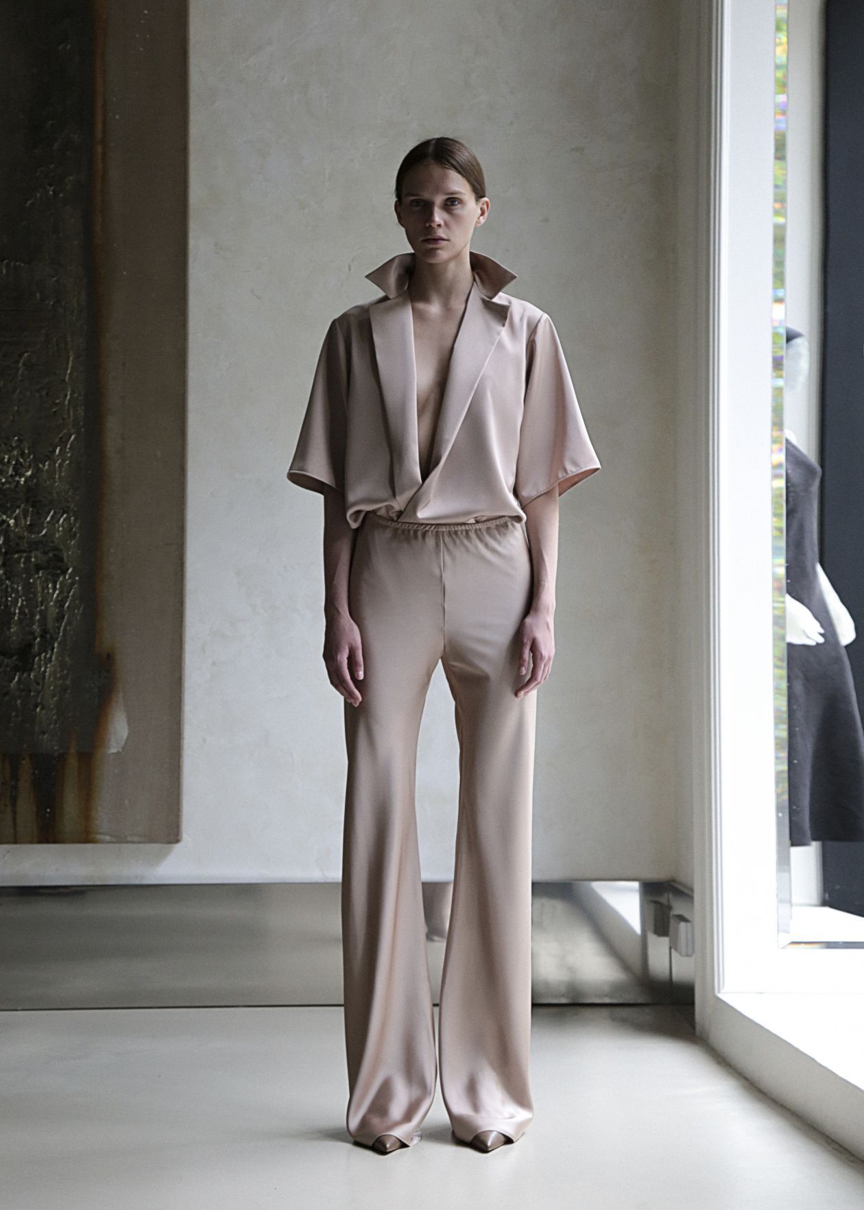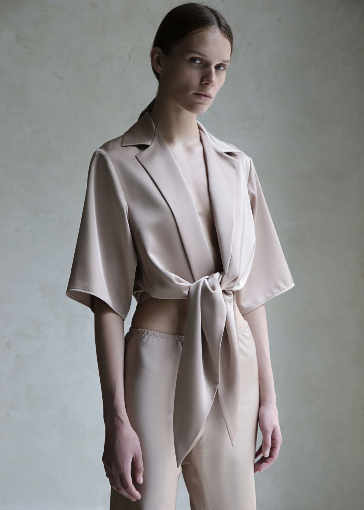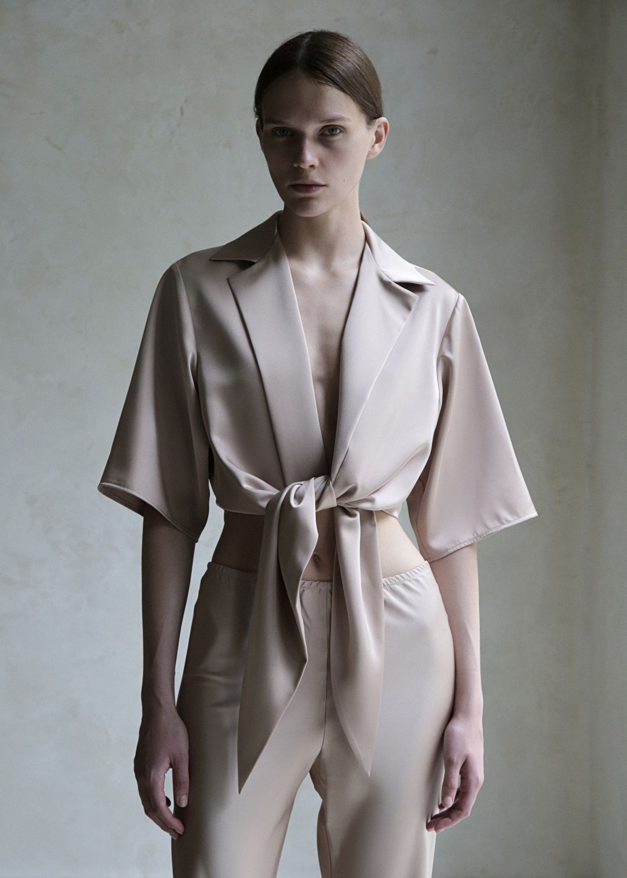 Blouse made of natural silk with a turn-down collar, wide sleeves, and an elongated front edge, allowing for various styling options.