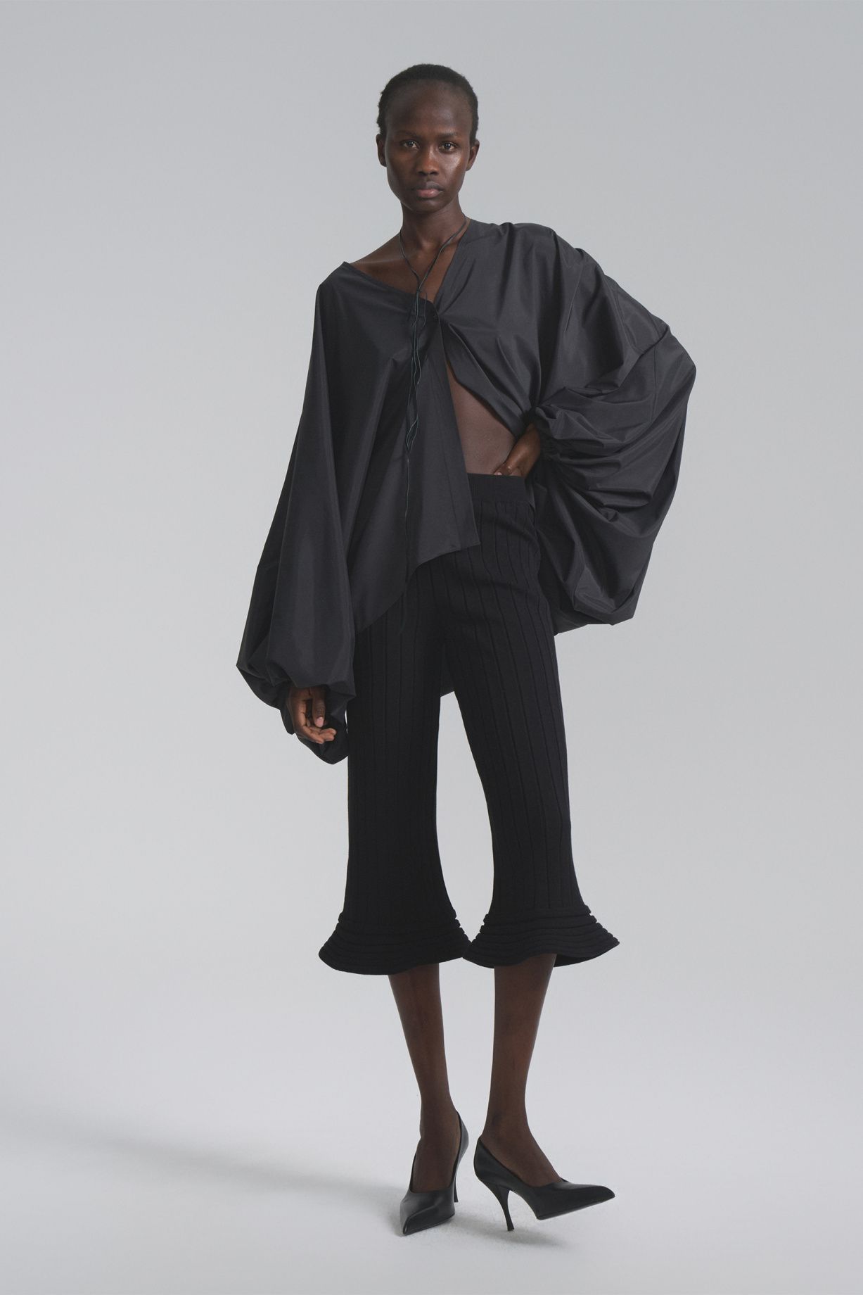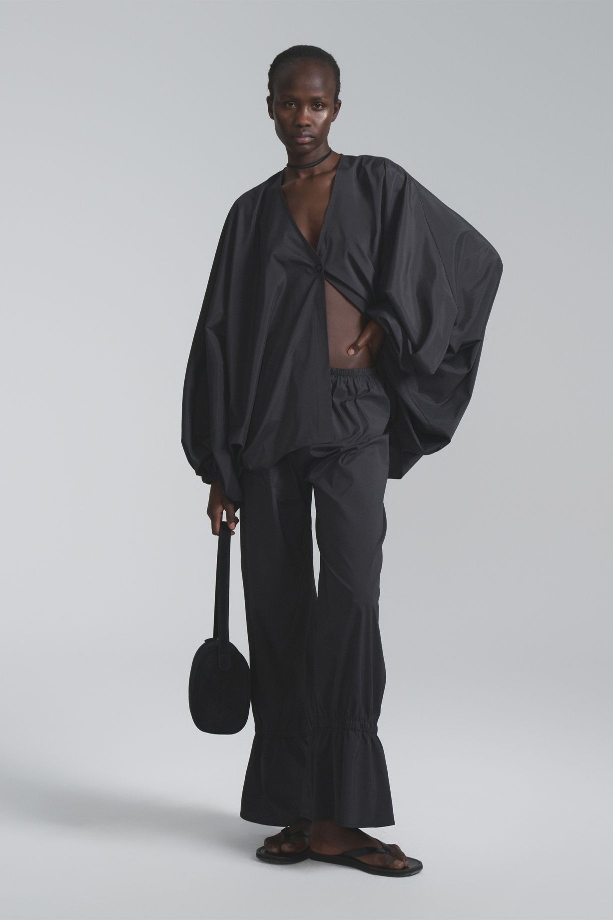 A loose-fitting blouse made of light and airy fabric, with a one-button closure and V-neckline. The sleeves are voluminous and have an elastic band at the bottom.| Size | Chest girth (cm) | Waist circumference | Hip girth |