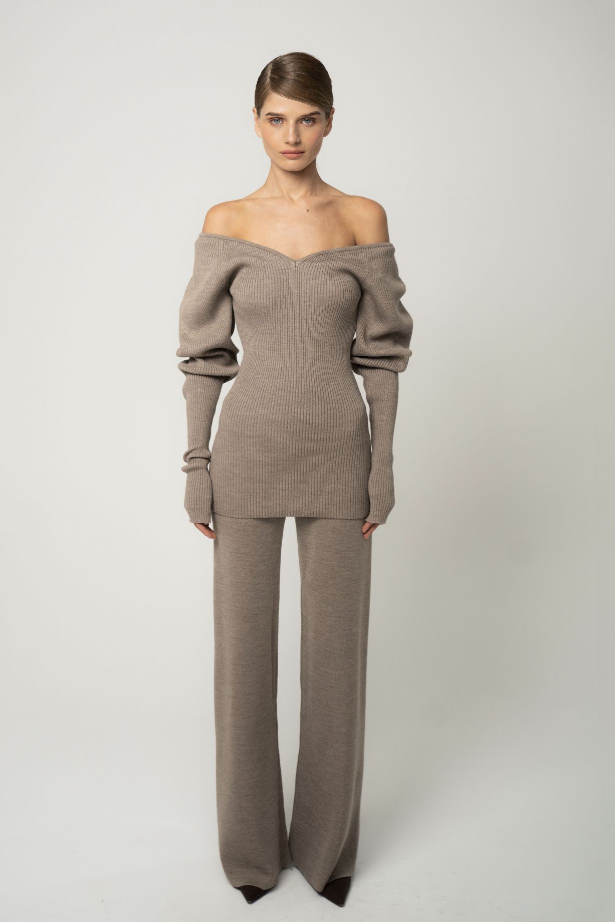 Seamless knitted trousers with a loose fit made of Australian merino wool with a wide comfortable belt.Composition: 60% Australian merino wool, 40% viscose