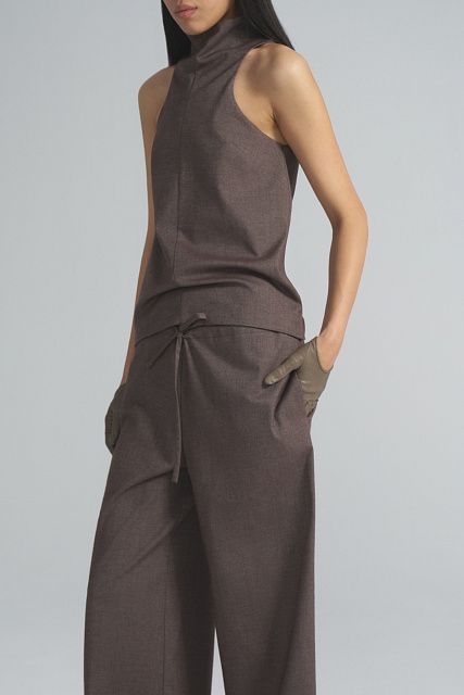 Loose comfortable trousers with a drawstring, which give the model a more strict look. They are made of breathable fabric with the addition of wool — dense, pleasant to the skin and practical to use.Composition: 75% viscose, 22% wool, 3% elastane