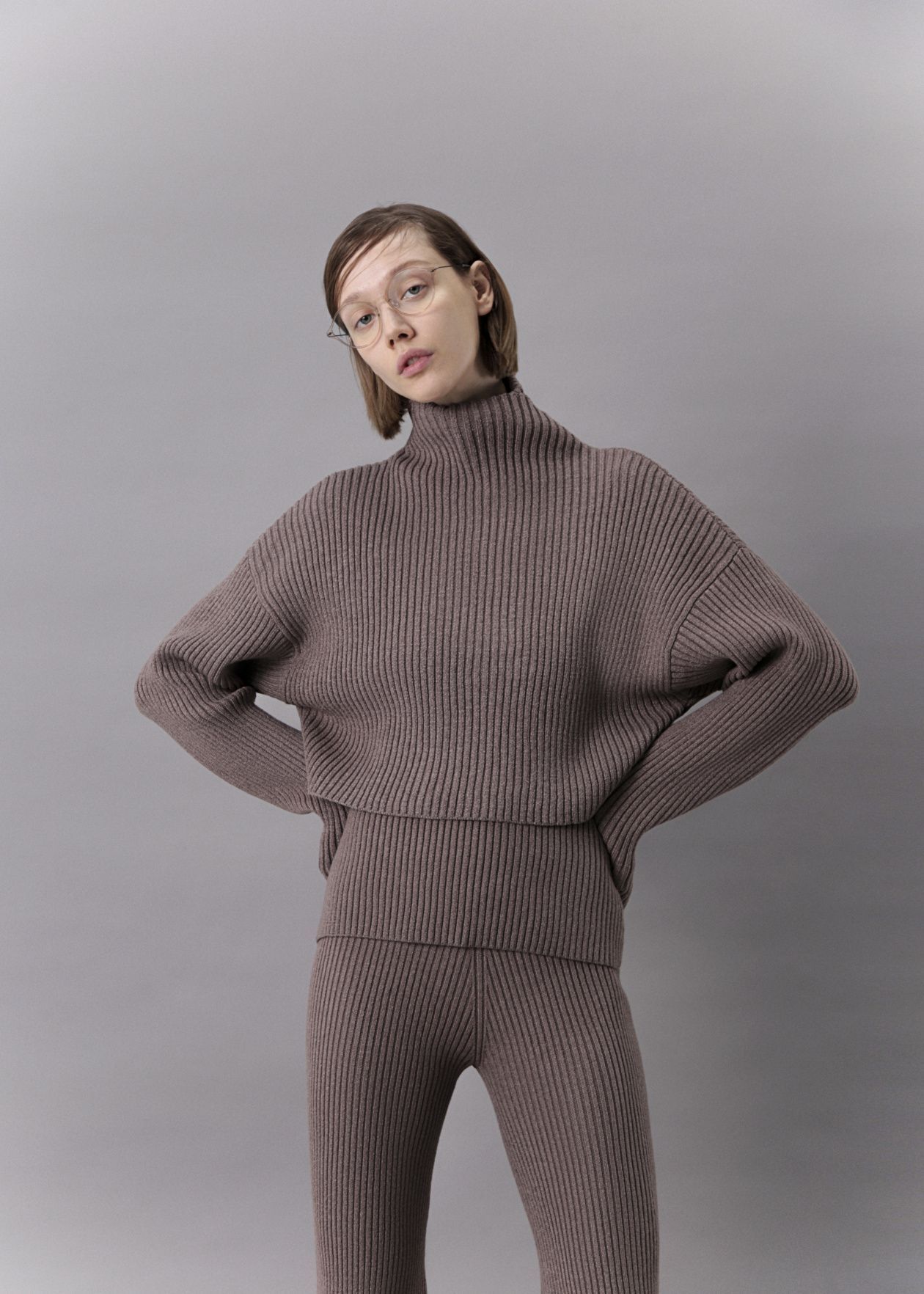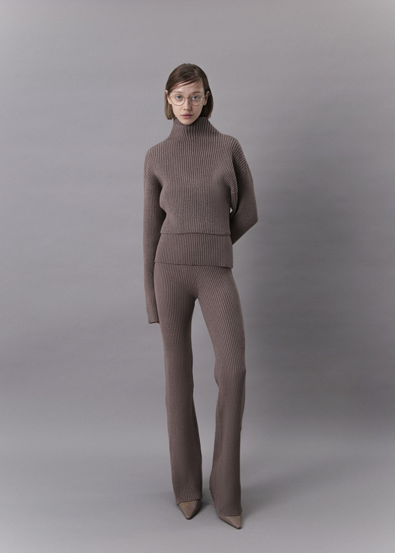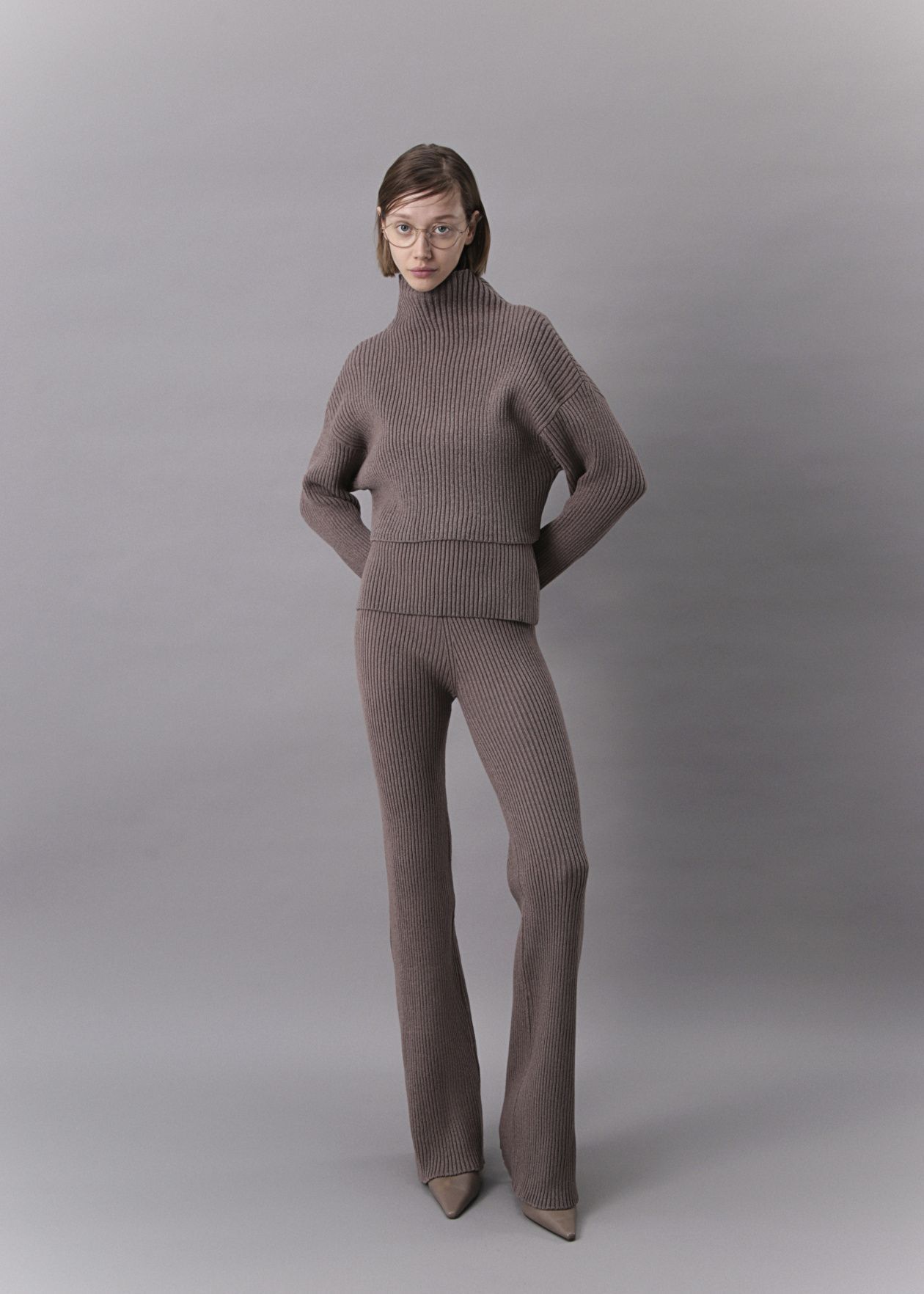 Knitted trousers with an addition of Australian merino wool in the composition. They have a high-rise, a wide belt, are tight-fitting, and flare at the bottom. They go well with dresses.Composition: 80% viscose, 20% wool