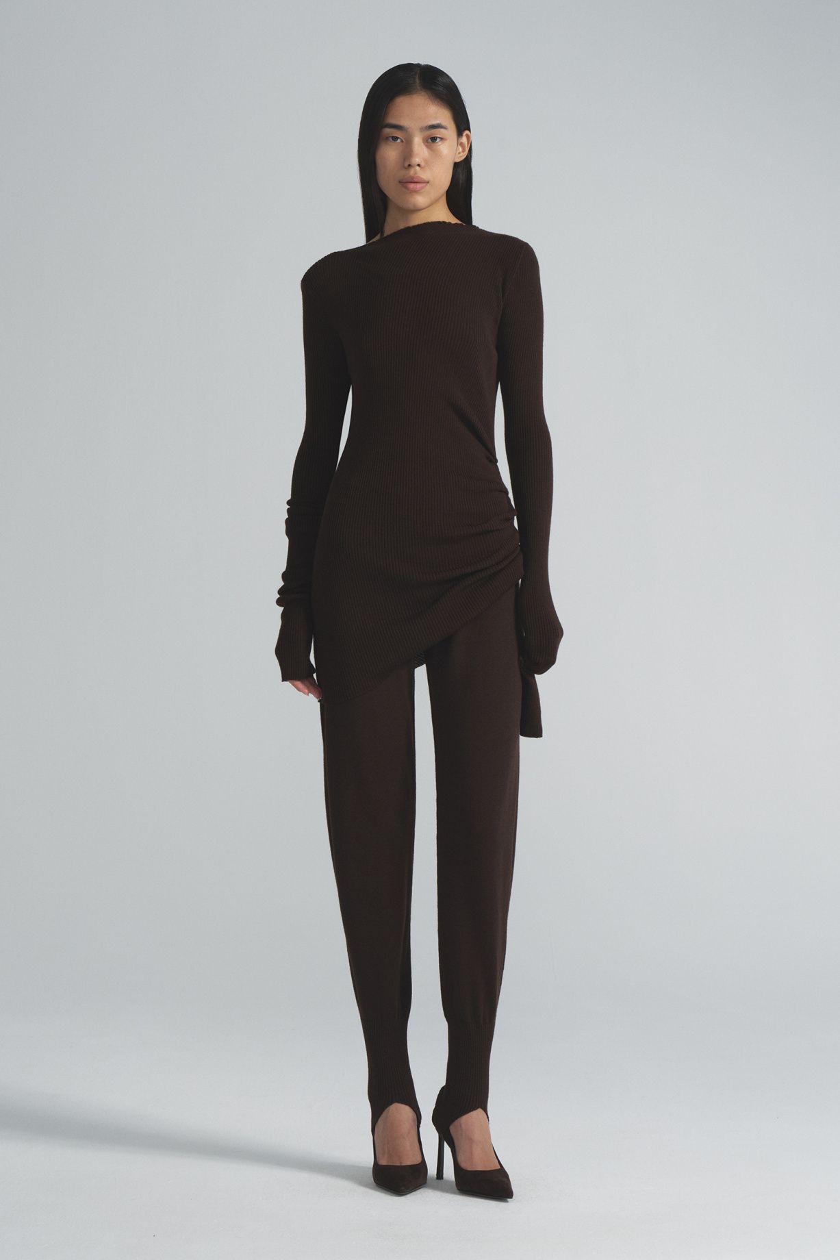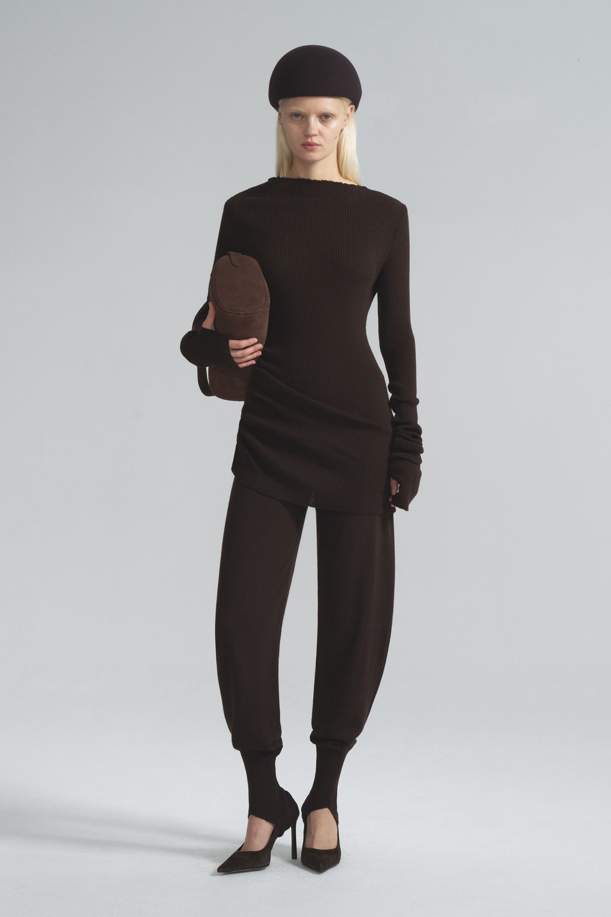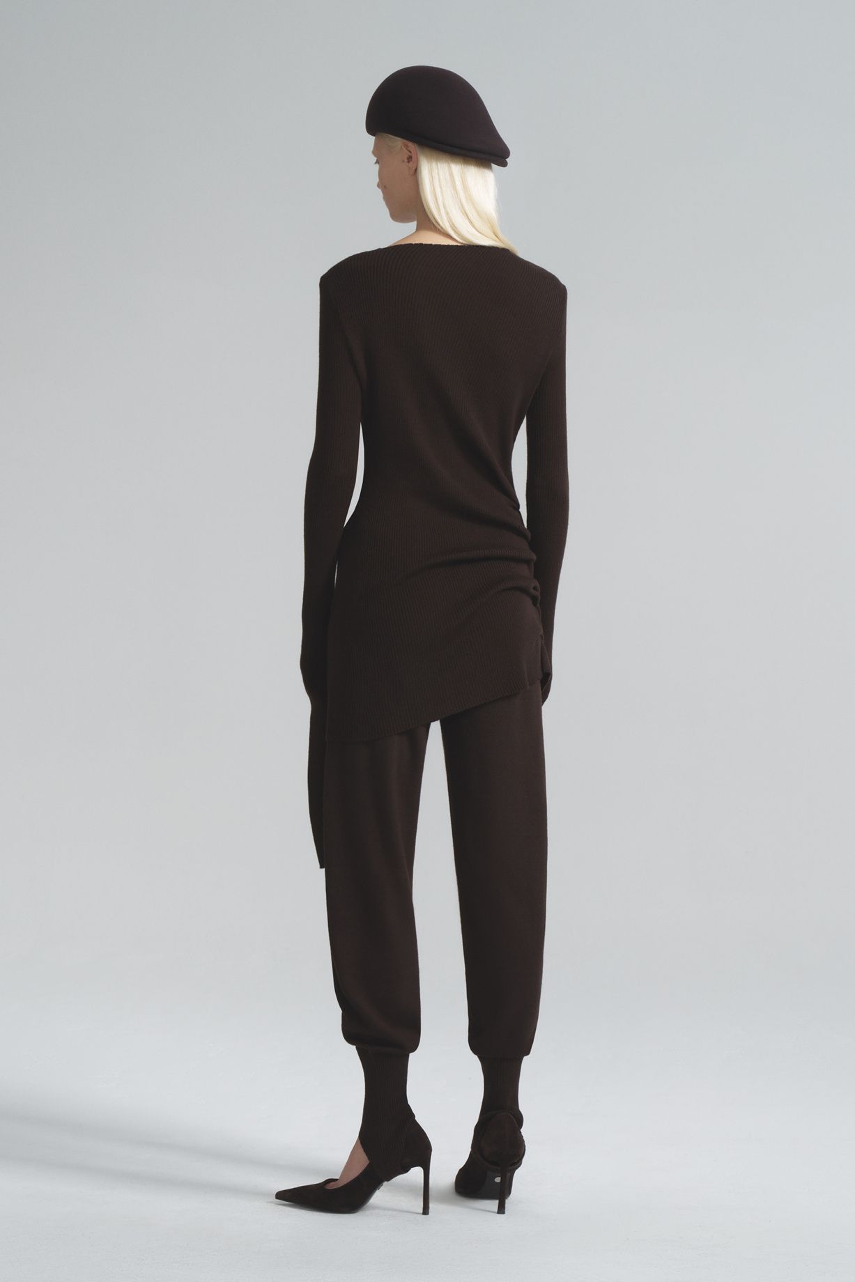 Seamless knitted trousers made from Australian merino wool, with a wide elastic waistband and a loose fit that is narrowed down by strips.