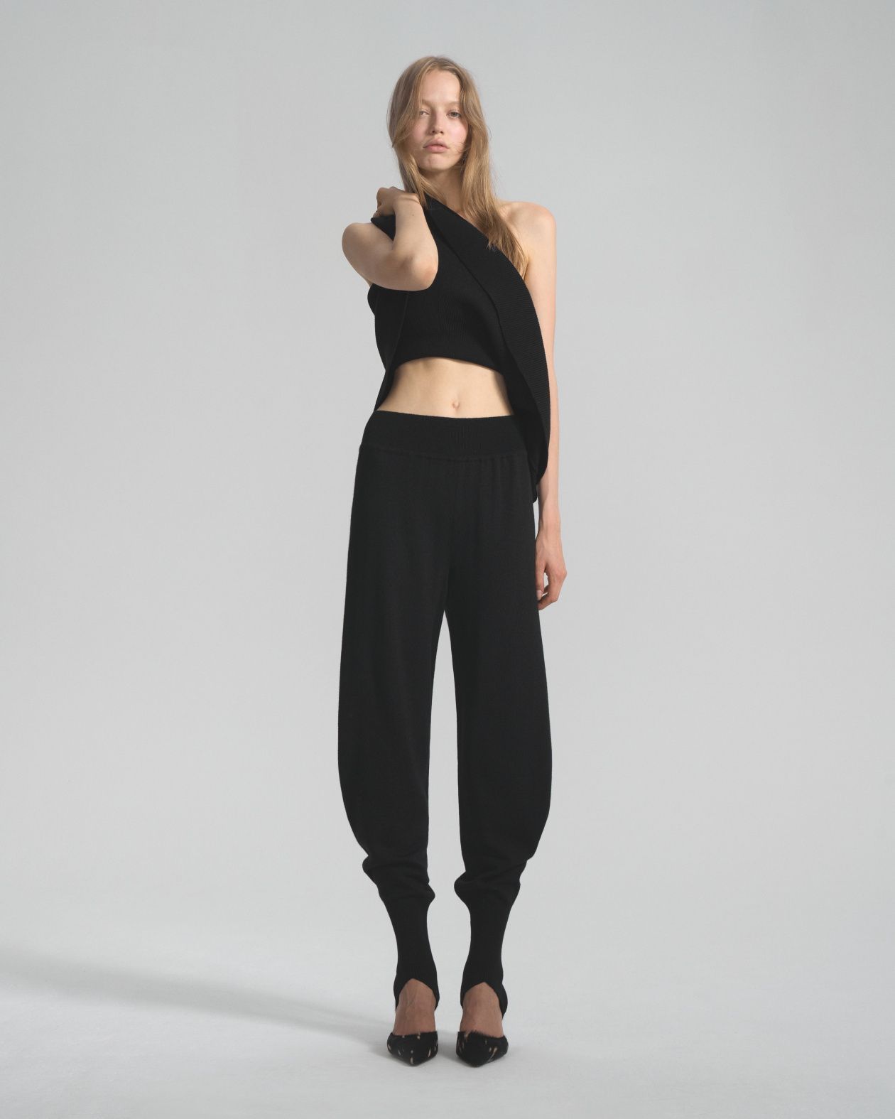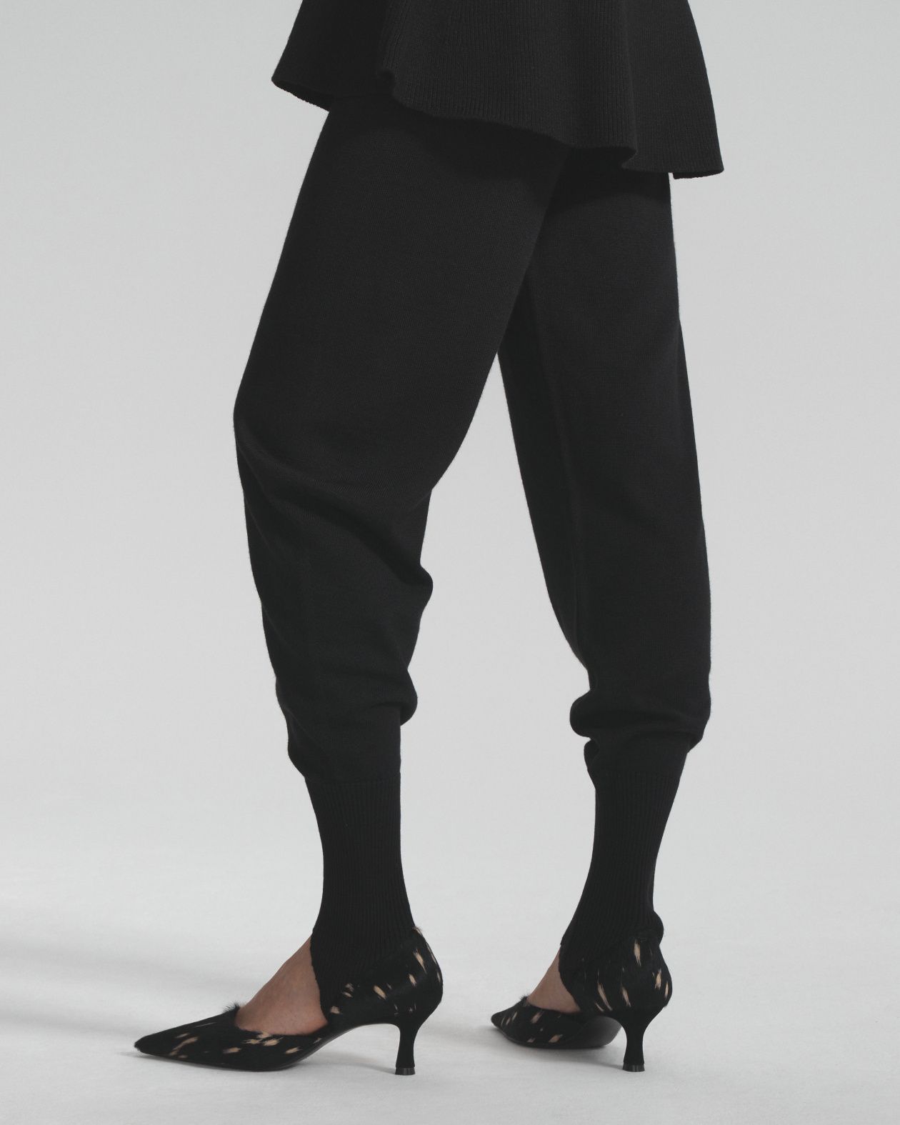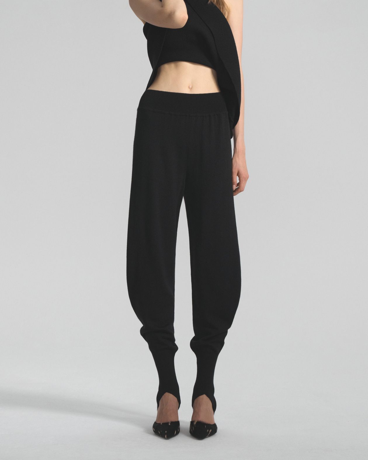 Seamless knitted trousers made from Australian merino wool, with a wide elastic waistband and a loose fit that is narrowed down by strips.