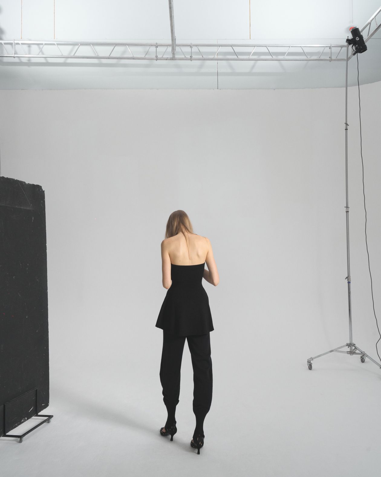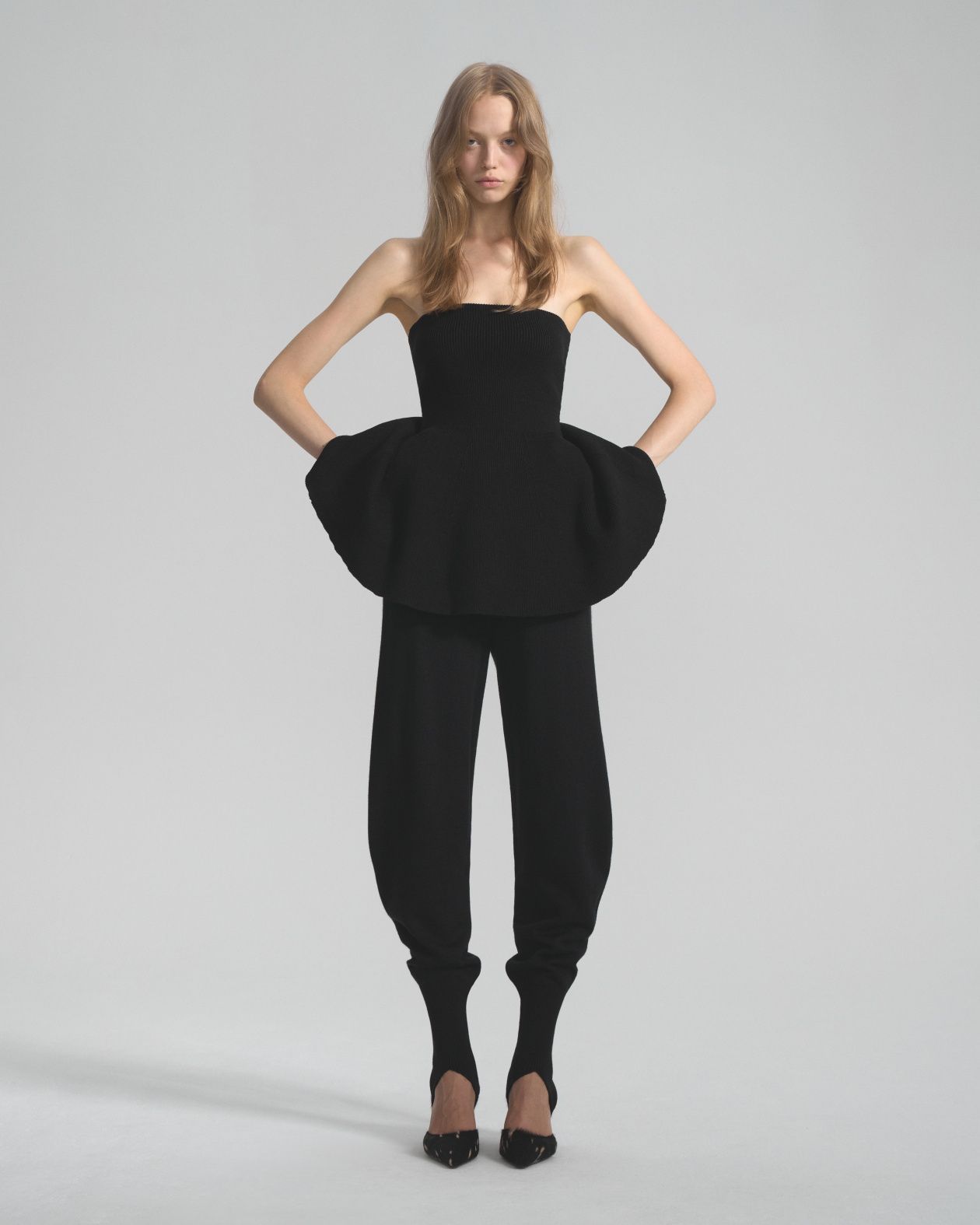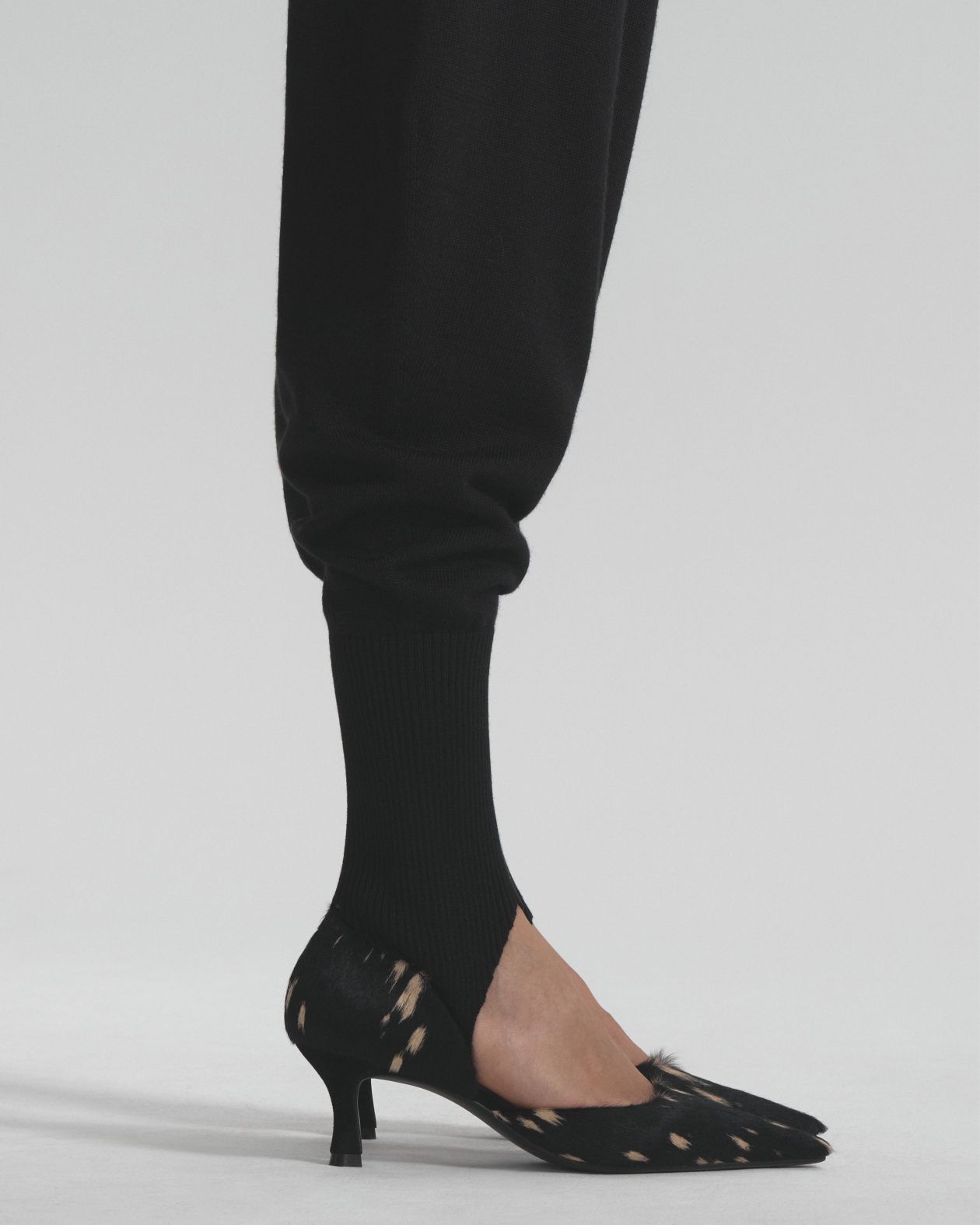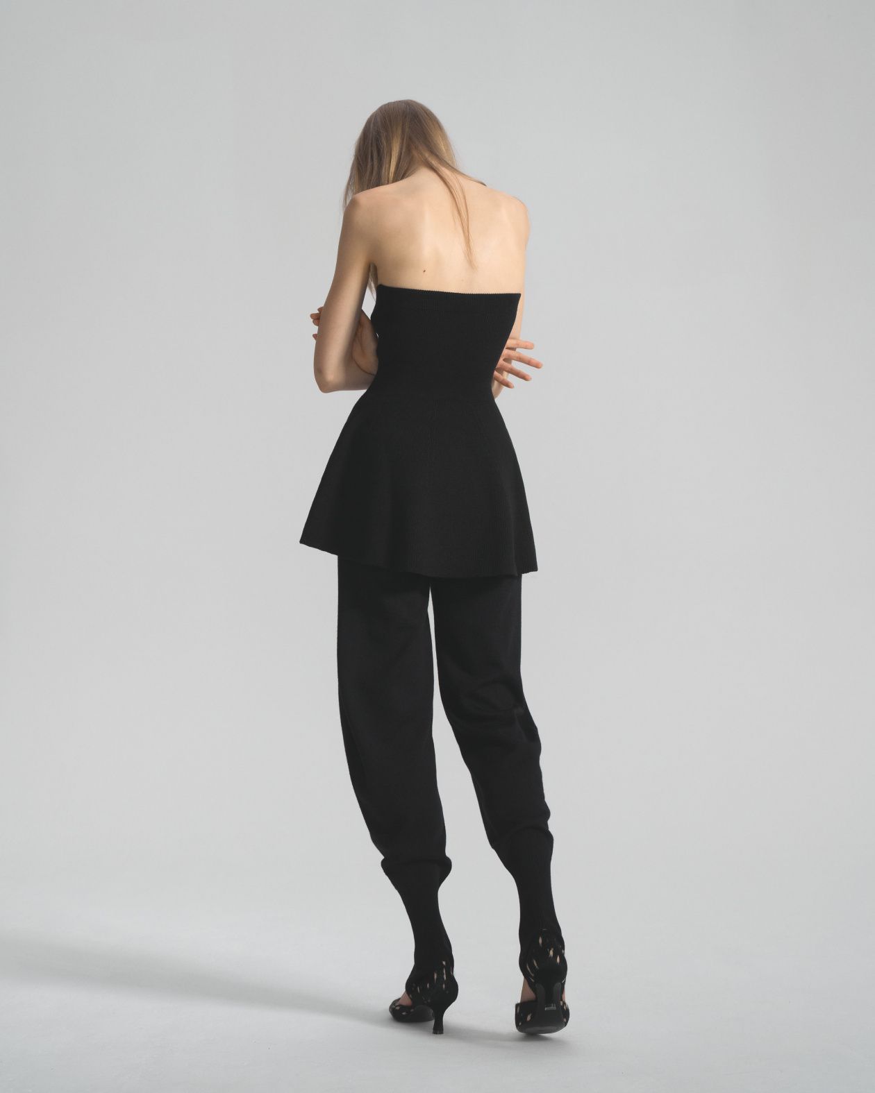 Seamless knitted trousers made from Australian merino wool, with a wide elastic waistband and a loose fit that is narrowed down by strips.