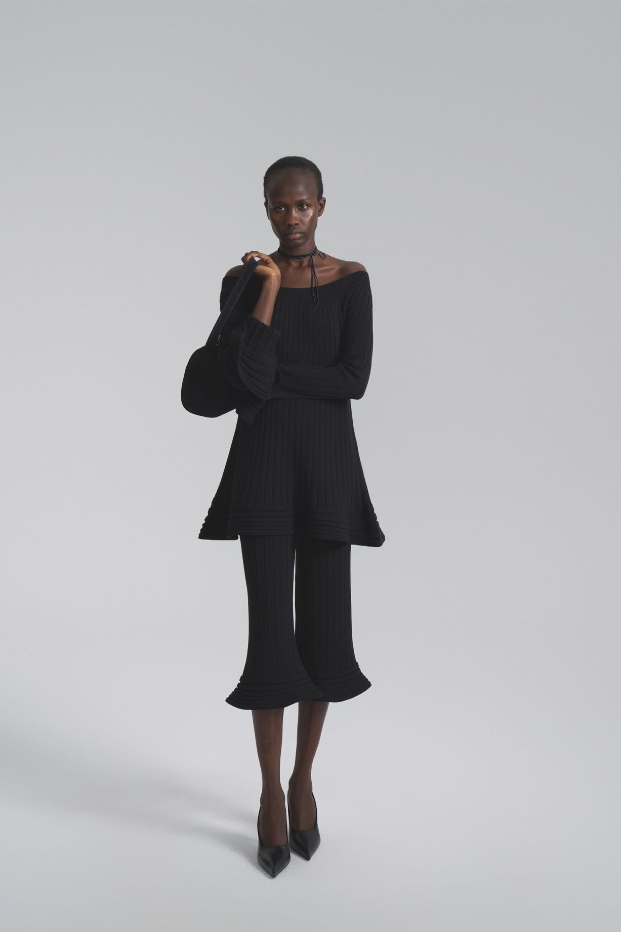 Cropped knitted trousers with a semi-fitted cut, one-piece cuffs with transverse knitting and a wave shape, a high fit and an elastic waistband for greater comfort.Composition: 72% viscose, 28% elastane