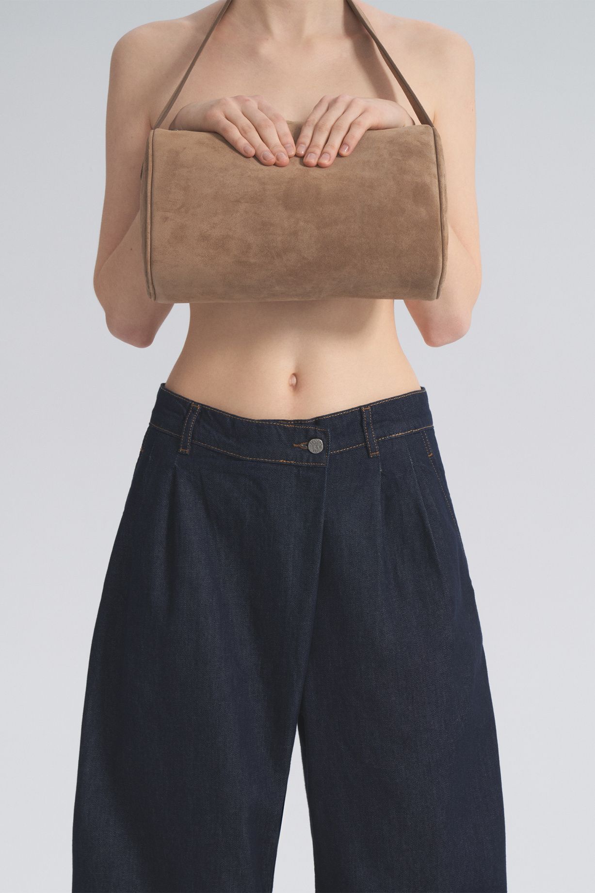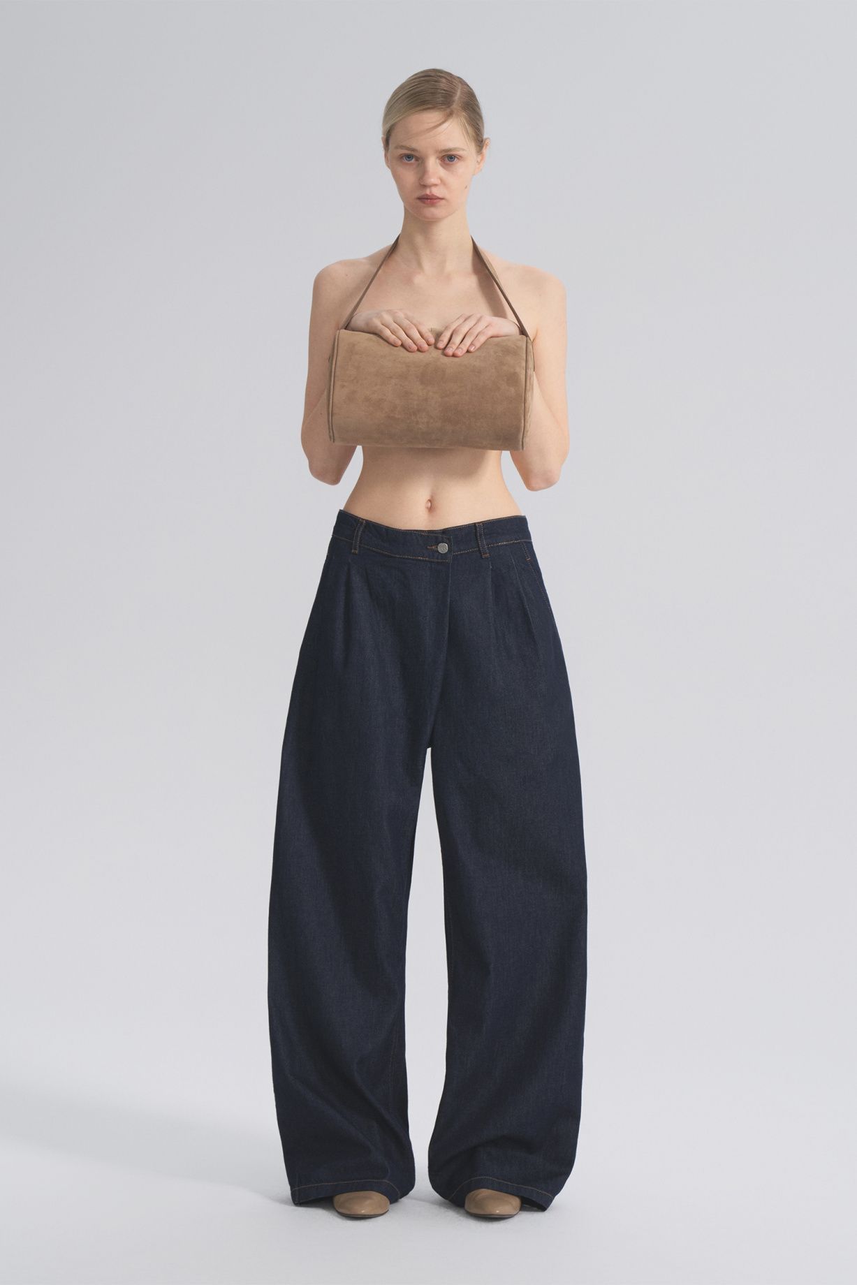 Jeans with a voluminous cut, with an asymmetrical closure, pleats and contrasting stitching made of dense denim.Composition: 100% cotton