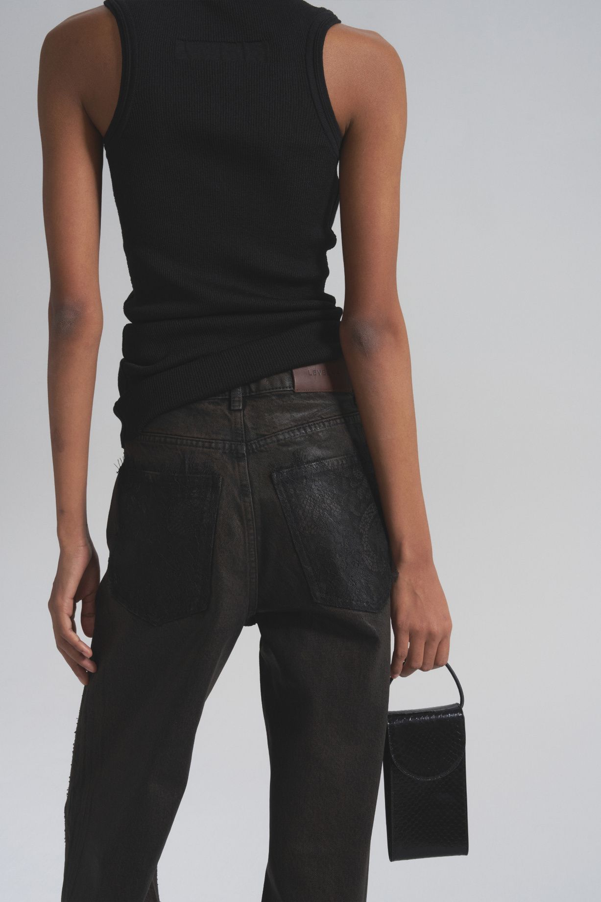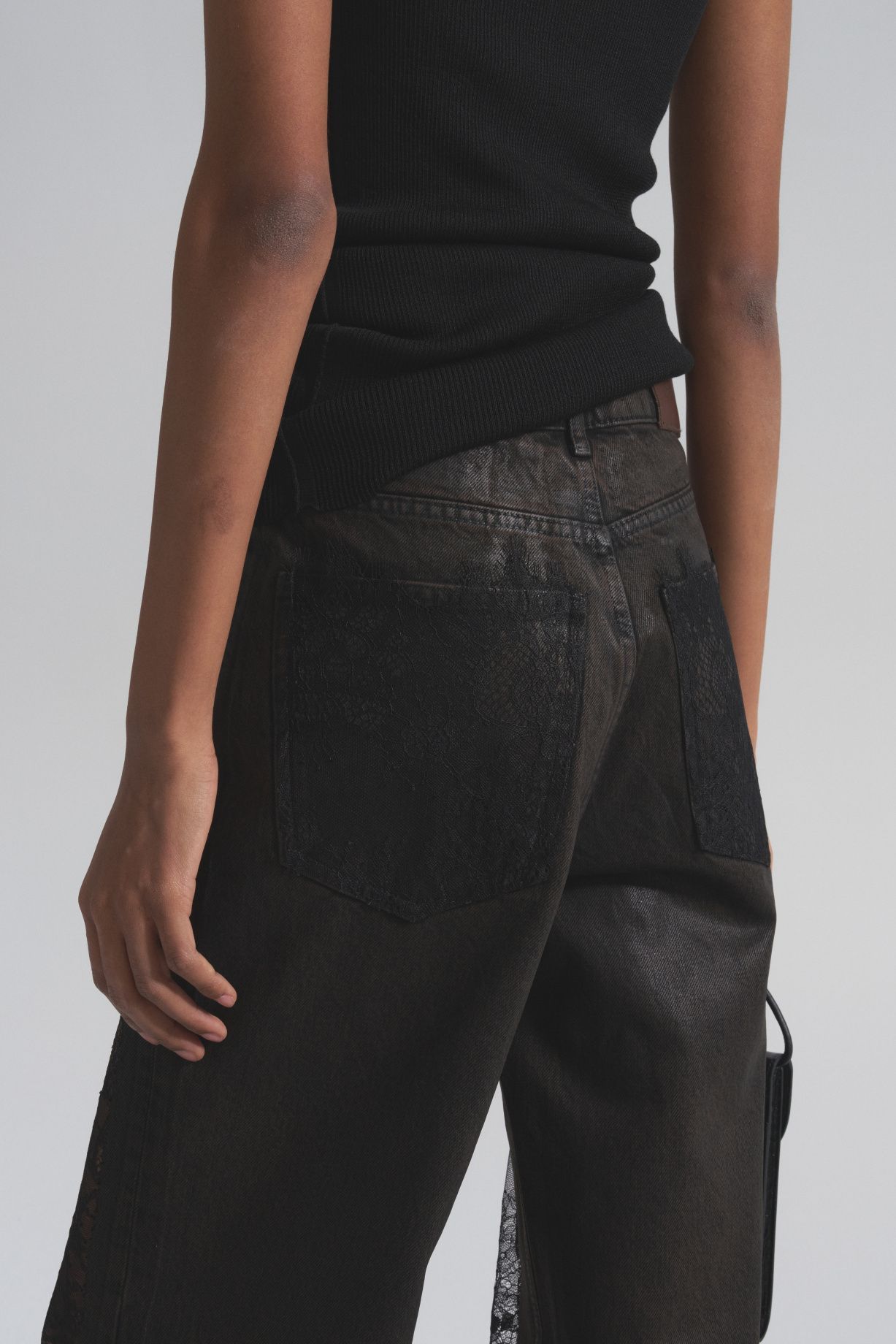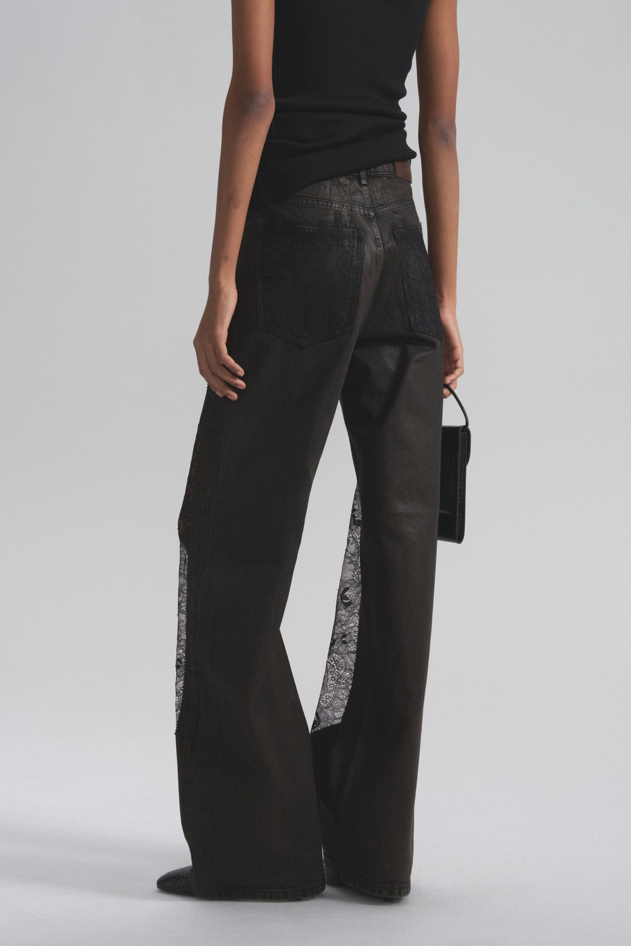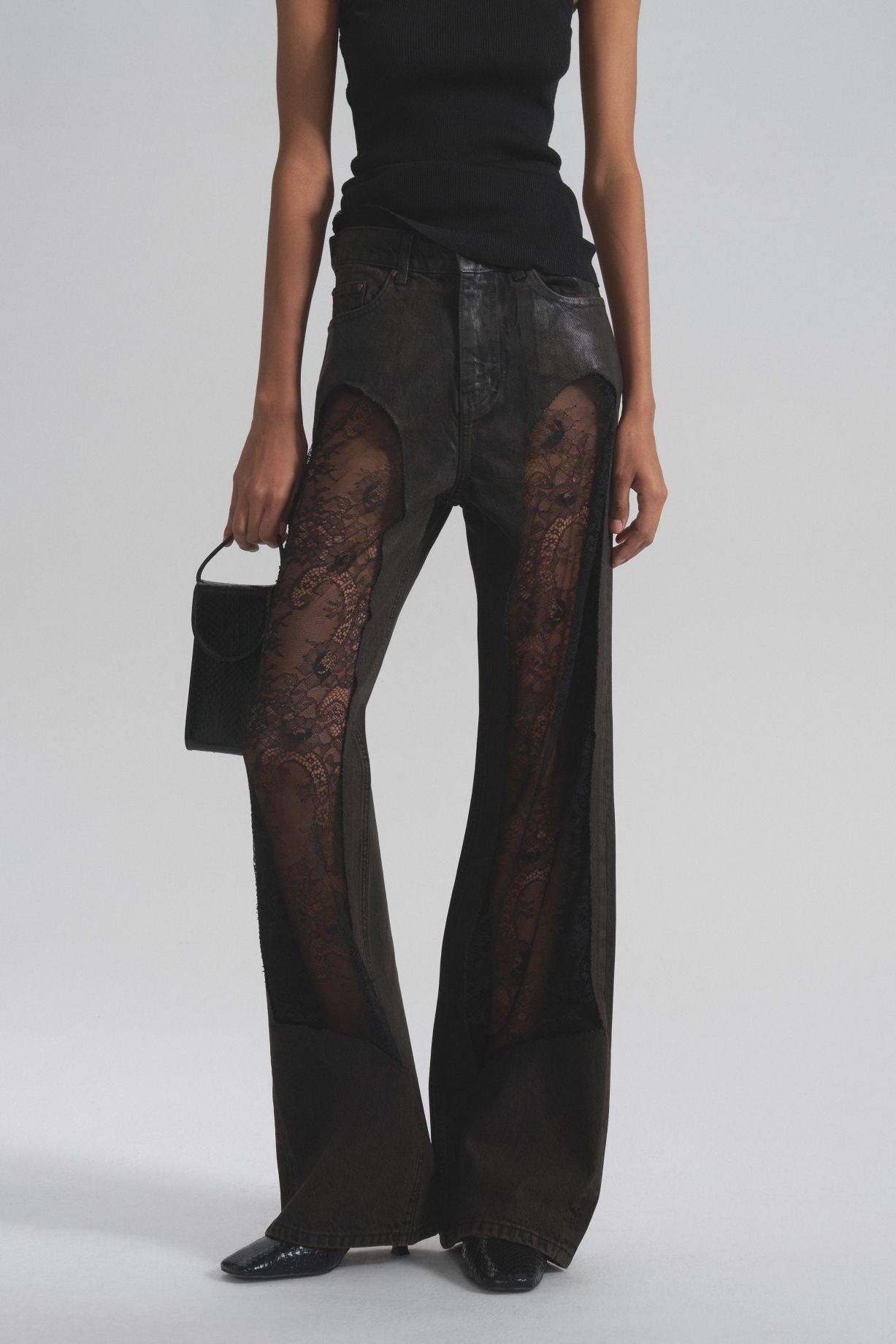 These jeans feature lace inserts and a subtle glass sheen. Elegant lace inserts create a slimming and elongating effect. They're perfect for both evening wear and casual silhouettes.