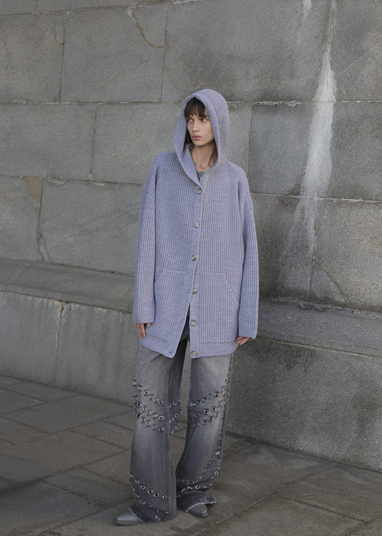 Loose cardigan made of thick yarn. The product is made of 100% merino wool, soft and pleasant to the skin. The versatile model is complemented by a voluminous hood and large pockets, it will perfectly complement the basic wardrobe.Composition: 100% merino wool