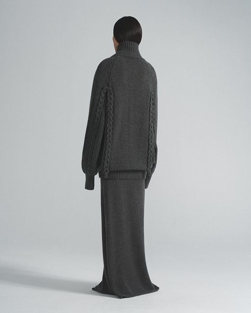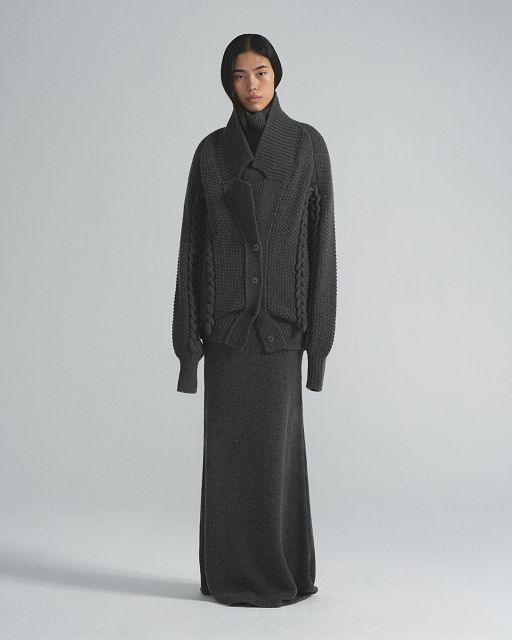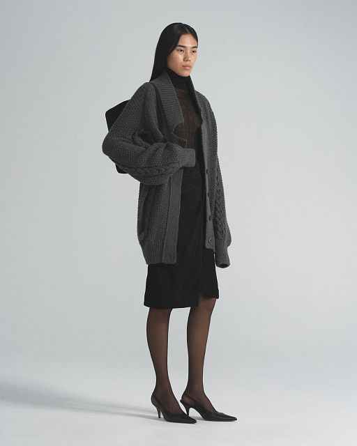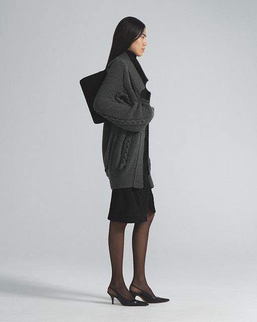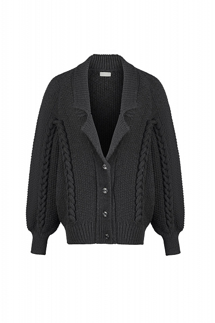 A cardigan with loose-fitting braids will be the perfect addition to your wardrobe. We added Australian merino wool and baby alpaca wool, which is renowned for its exceptional softness and thermal insulation properties, making the cardigan perfect for cooler days. The collar and button closure add convenience and style, while the viscose adds drapery and lightness.Composition: 50% Australian merino, 30% baby alpaca, 20% viscose