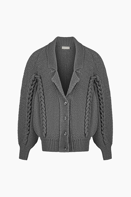 A cardigan with loose-fitting braids will be the perfect addition to your wardrobe. We added Australian merino wool and baby alpaca wool, which is renowned for its exceptional softness and thermal insulation properties, making the cardigan perfect for cooler days. The collar and button closure add convenience and style, while the viscose adds drapery and lightness.Composition: 50% Australian merino, 30% baby alpaca, 20% viscose