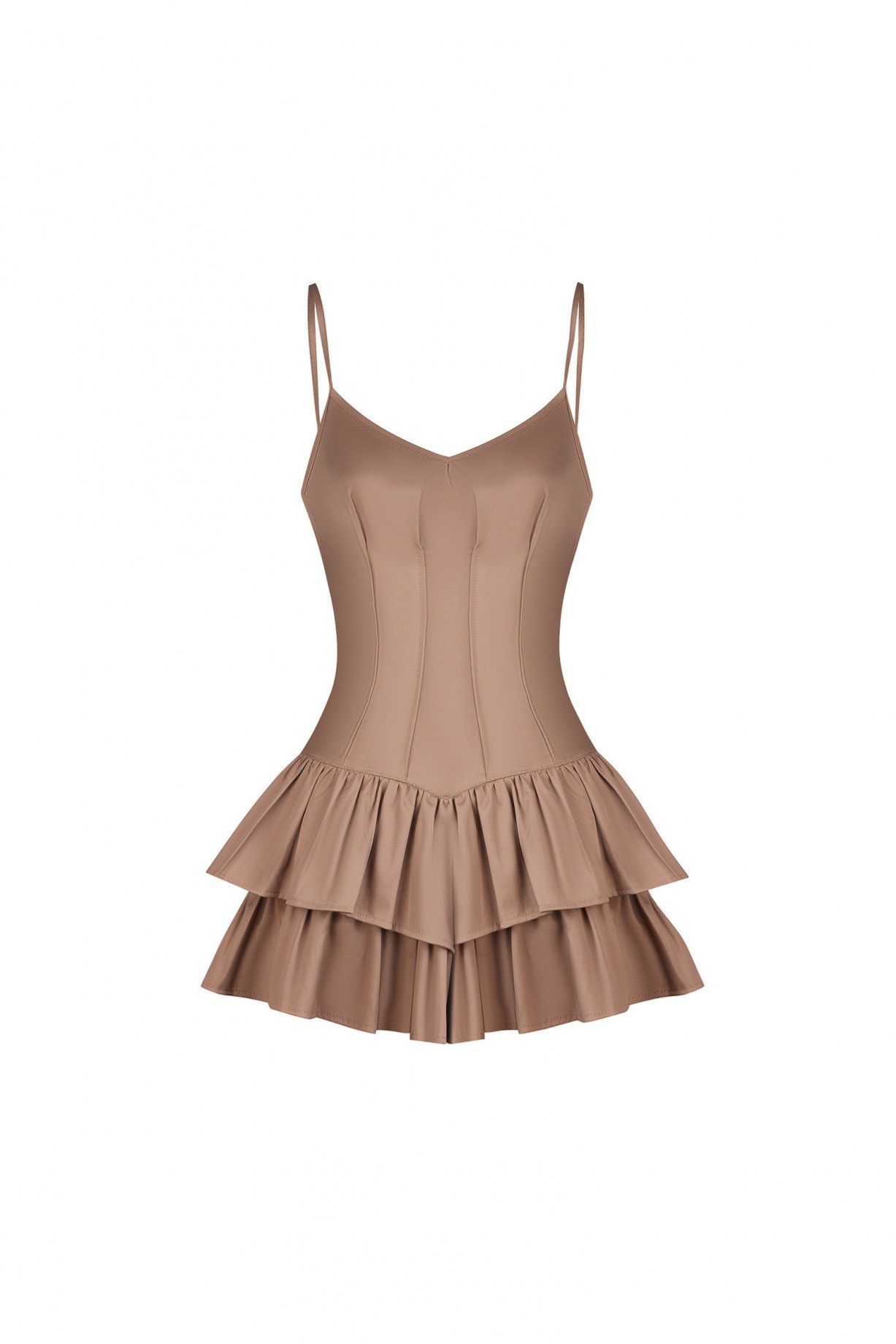The mini jumpsuit is sewn like a corset with thin straps, a skirt with double flounces.Composition: 80% Viscose, 10% Cotton, 10% Elastane