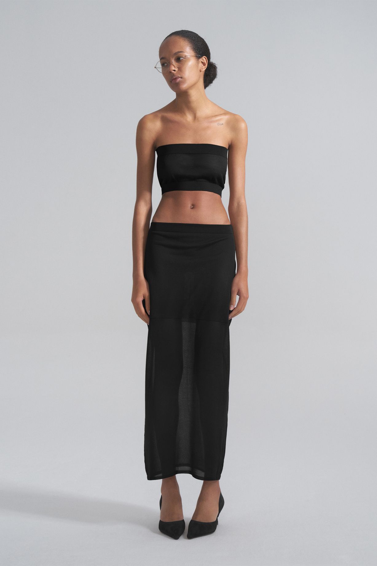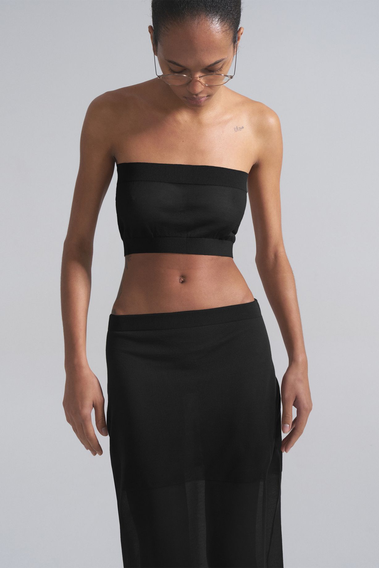 Semi-transparent striped top, upper and lower edges with elastic band.Composition: 20% silk, 60% viscose, 20% nylon