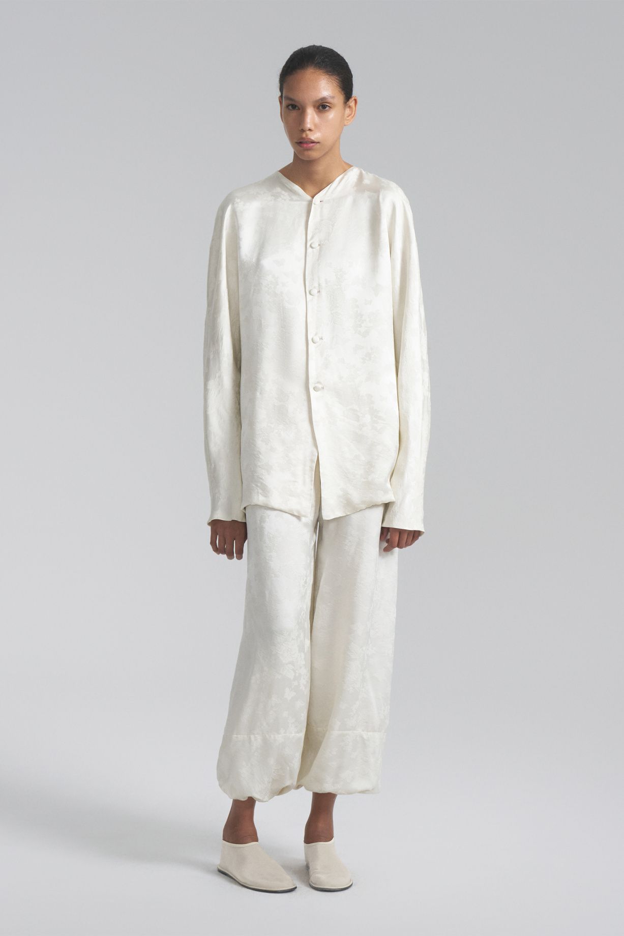 Jacquard silk pajama suit with trousers, buttons covered with silk, author's butterfly print, made using special technologyComposition: 70% silk, 30% viscose