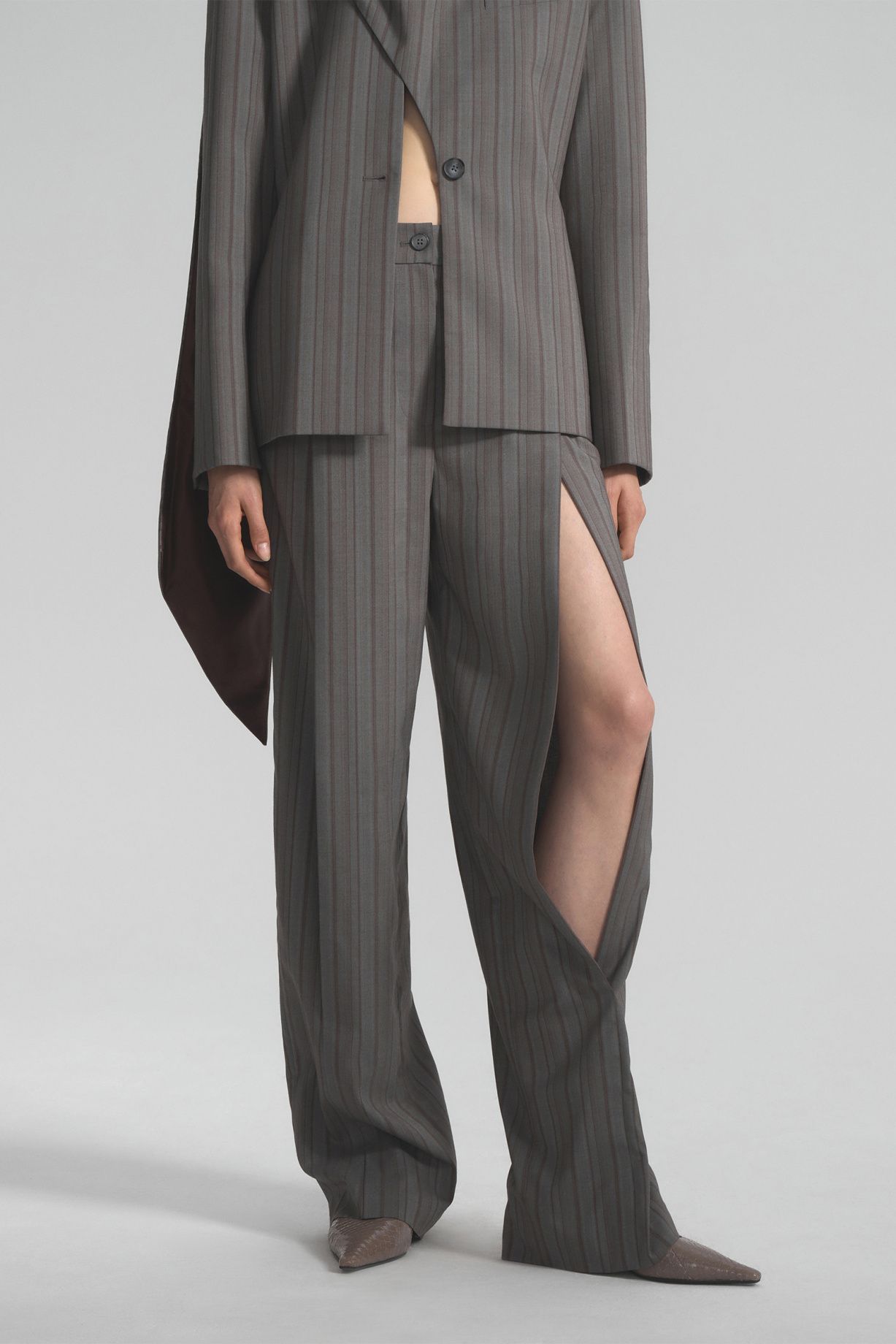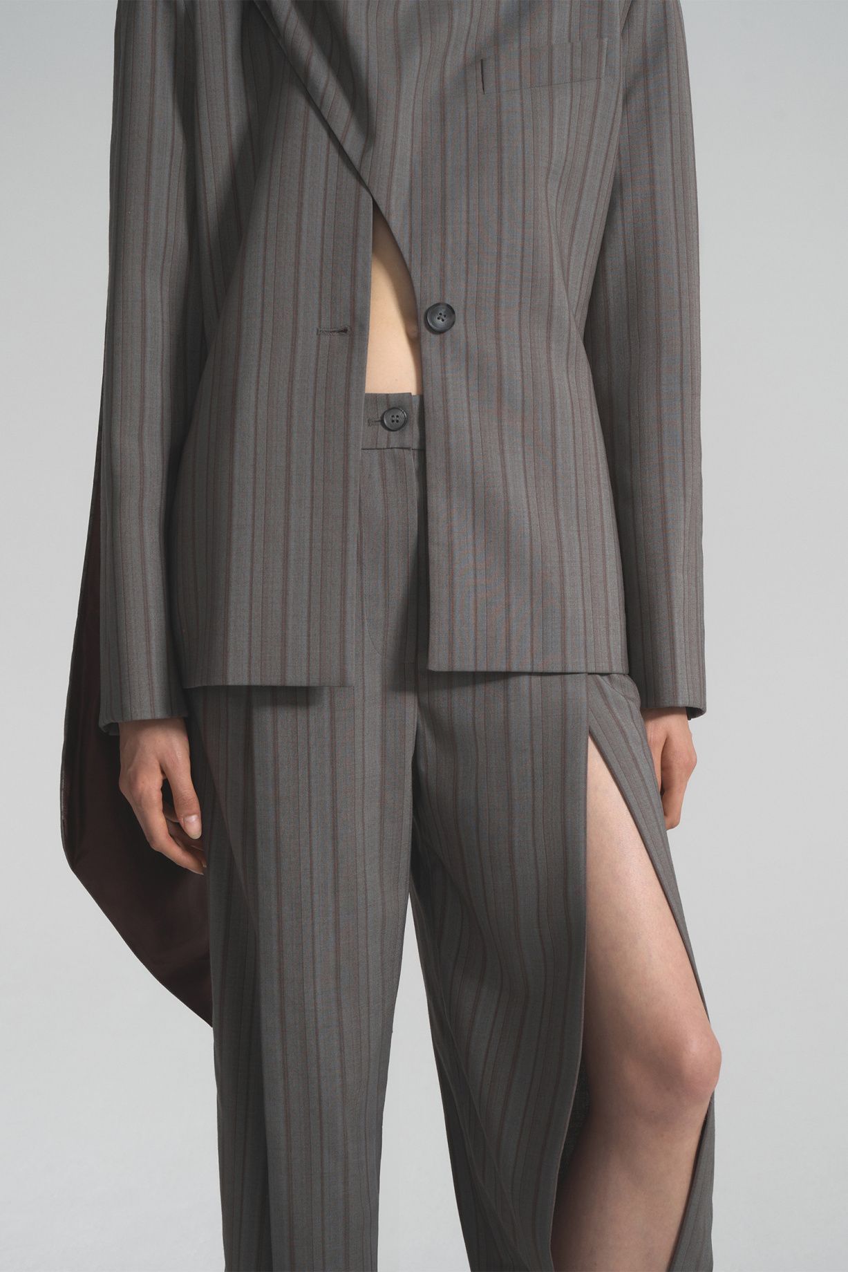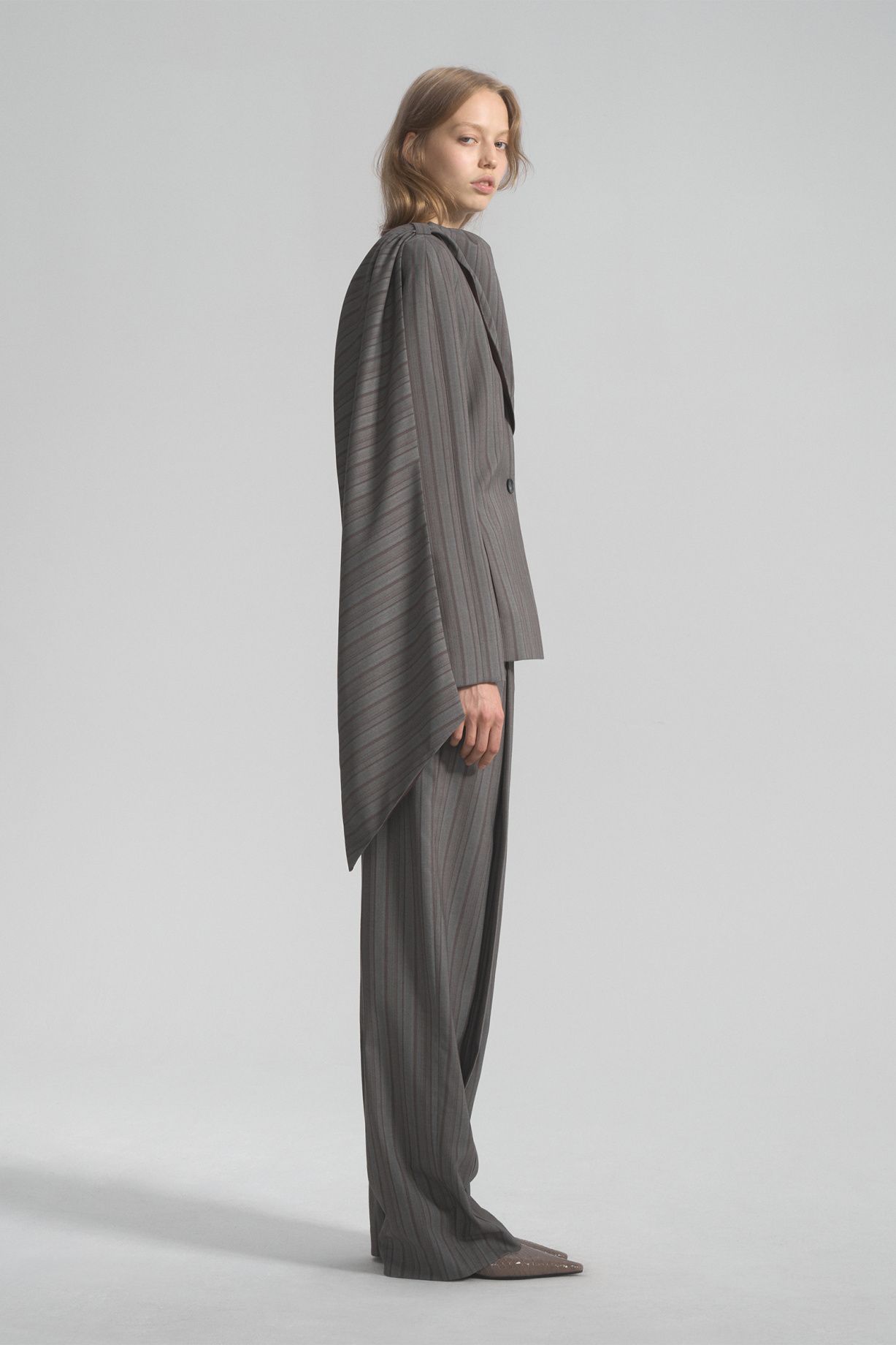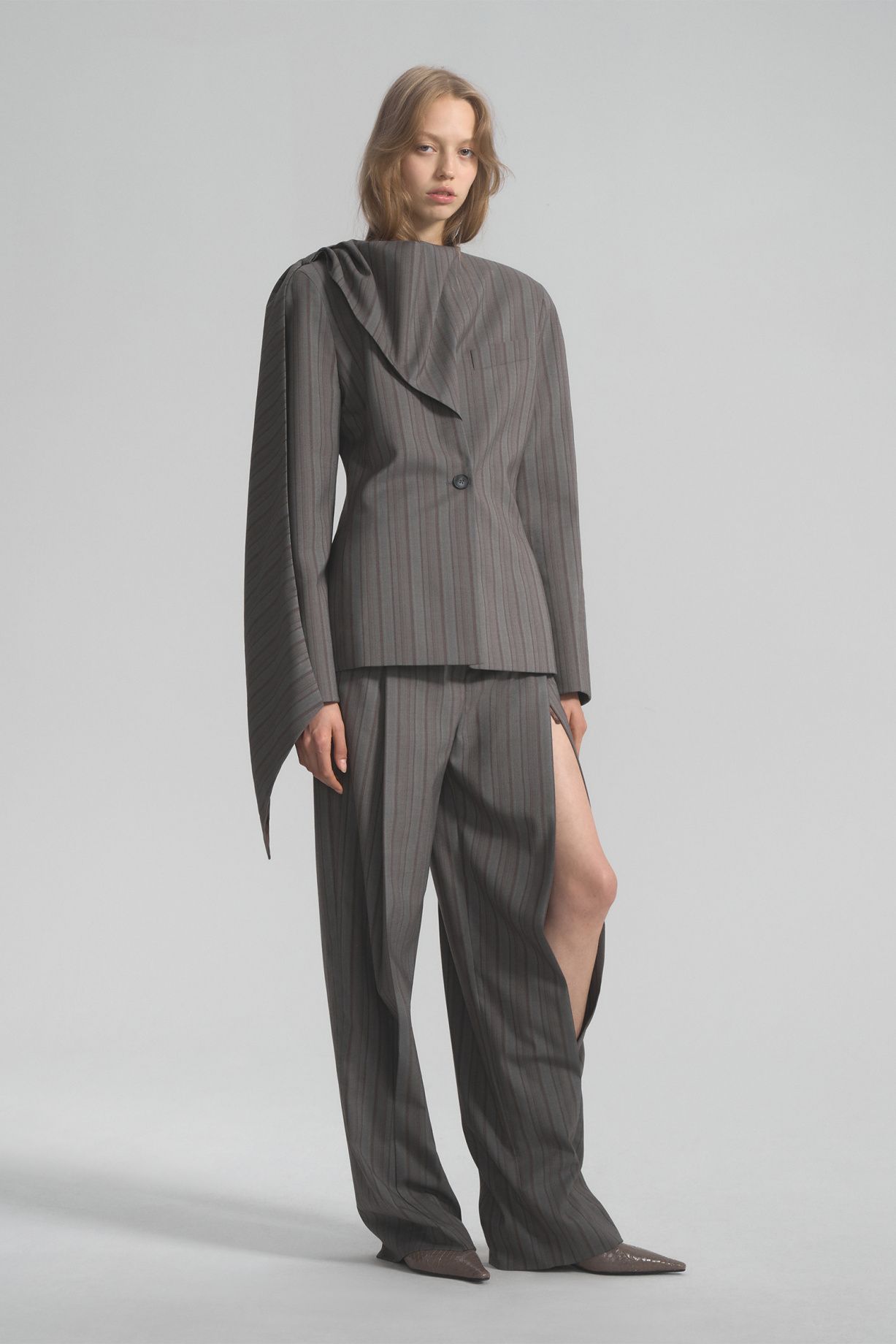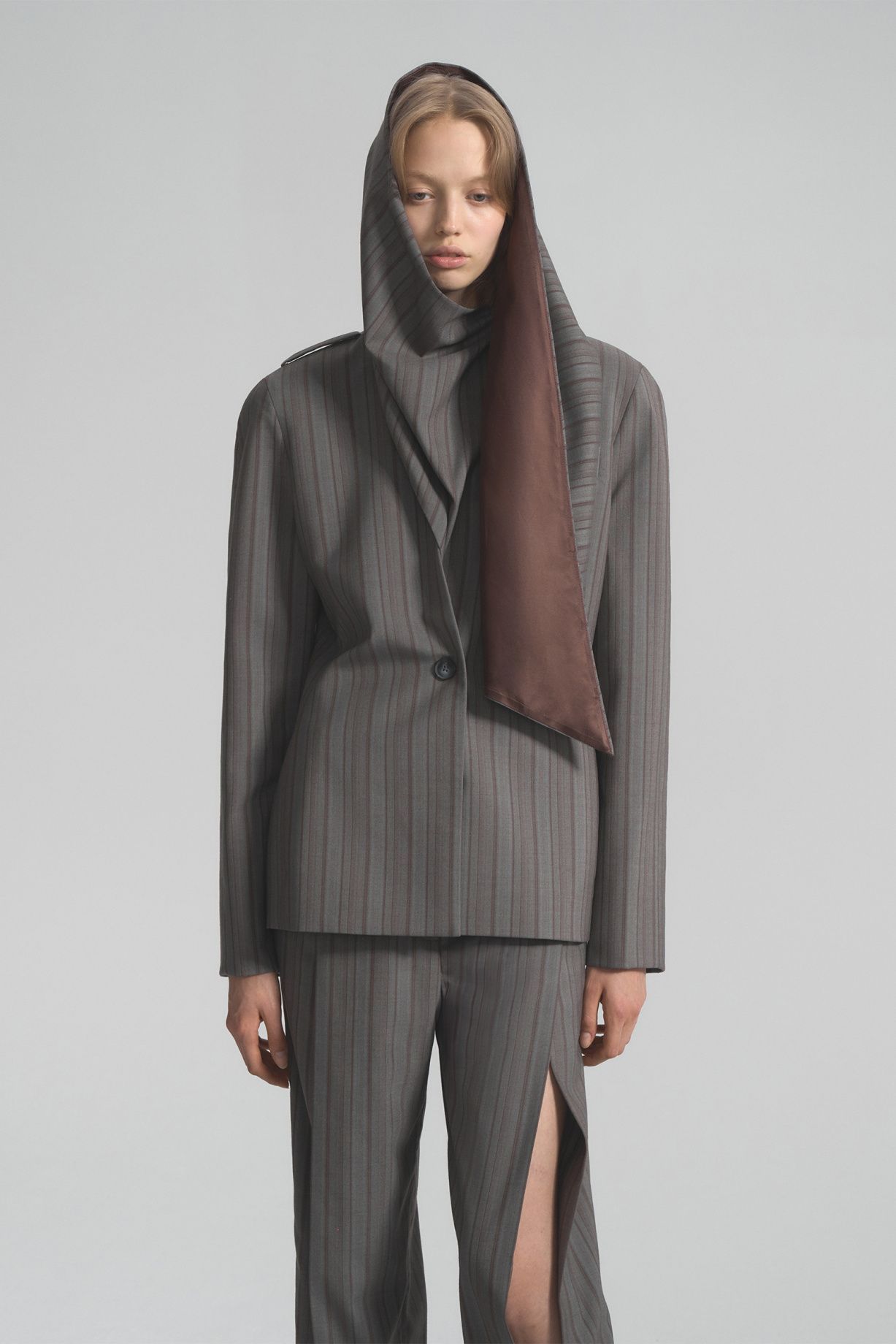 Italian wool suit with a silk viscose scarf and classic-cut trousers with a thigh slit, pockets, and belt loops.Composition: 98% viscose 2% spandex Lining: 100% viscose