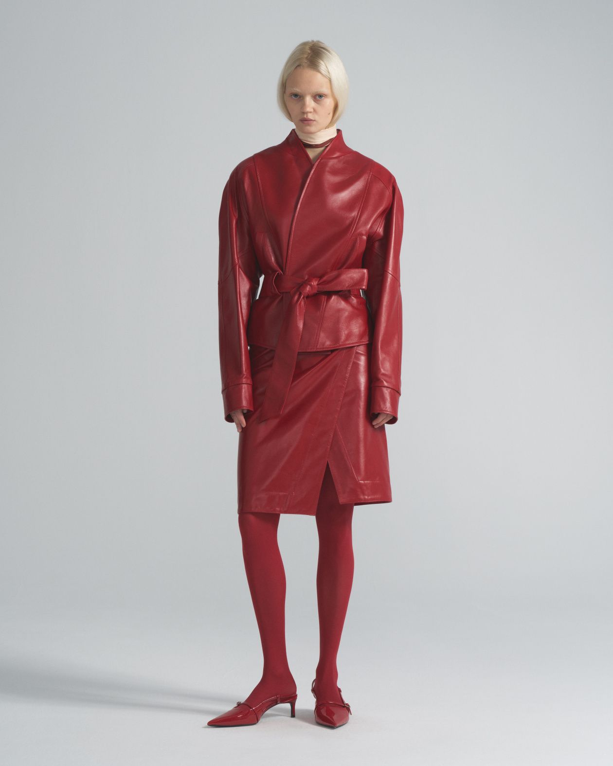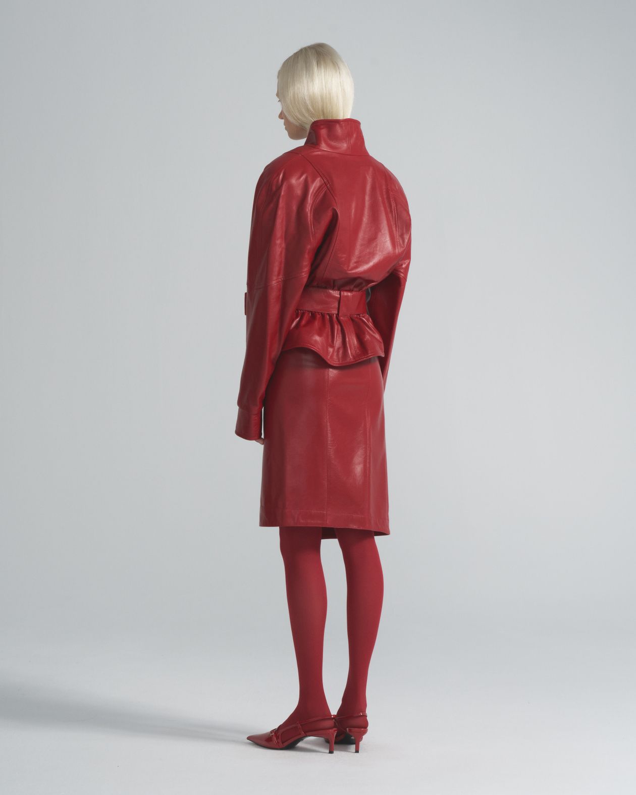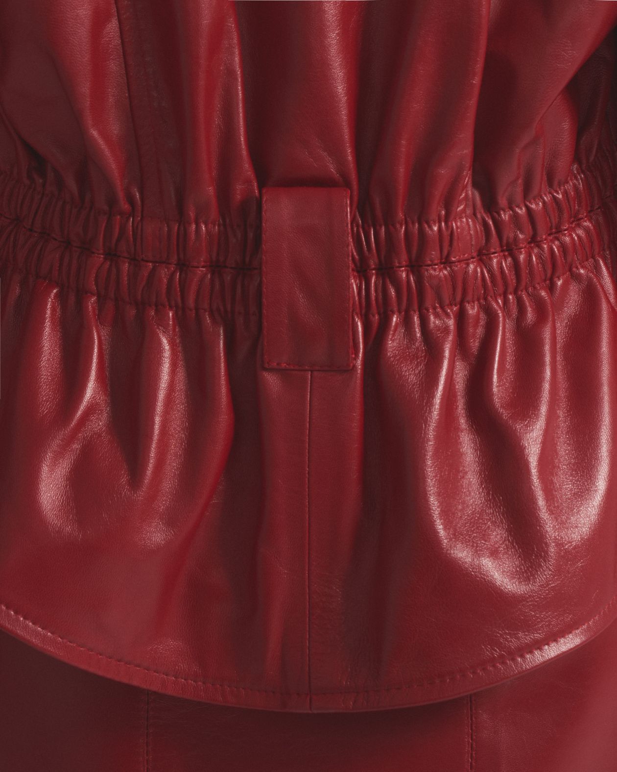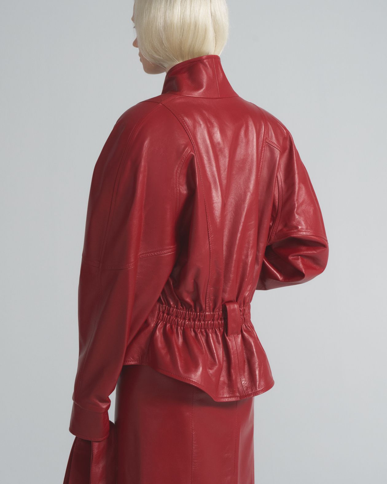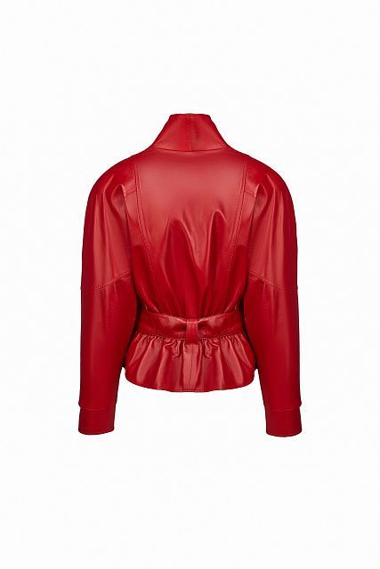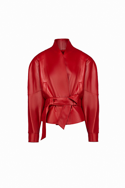A fitted handmade genuine leather jacket of premium quality with a belt at the waist. Voluminous sleeves with cuffs, stand-up collar, leather-covered button.Composition: 100% natural leather