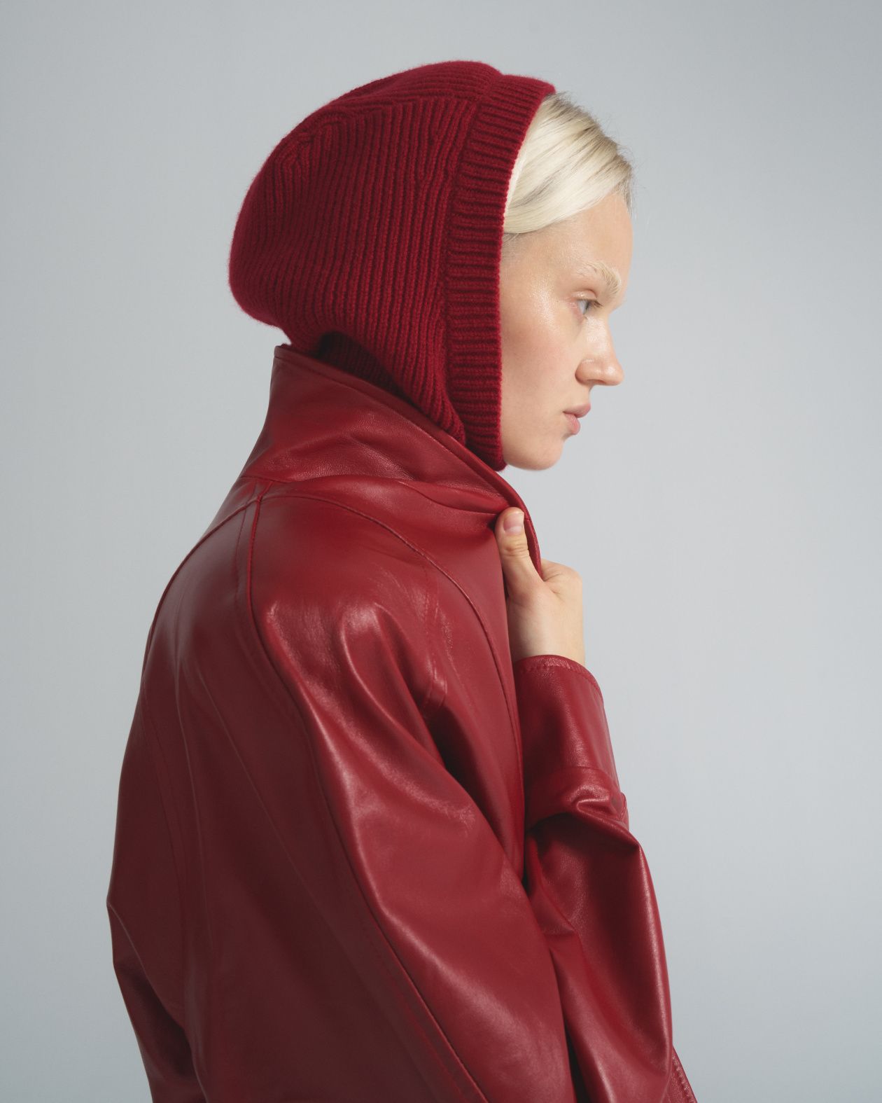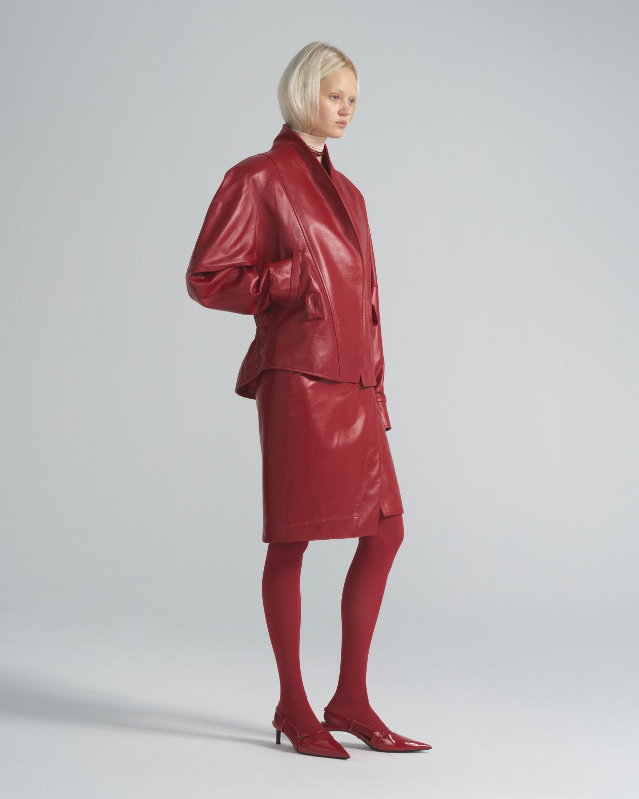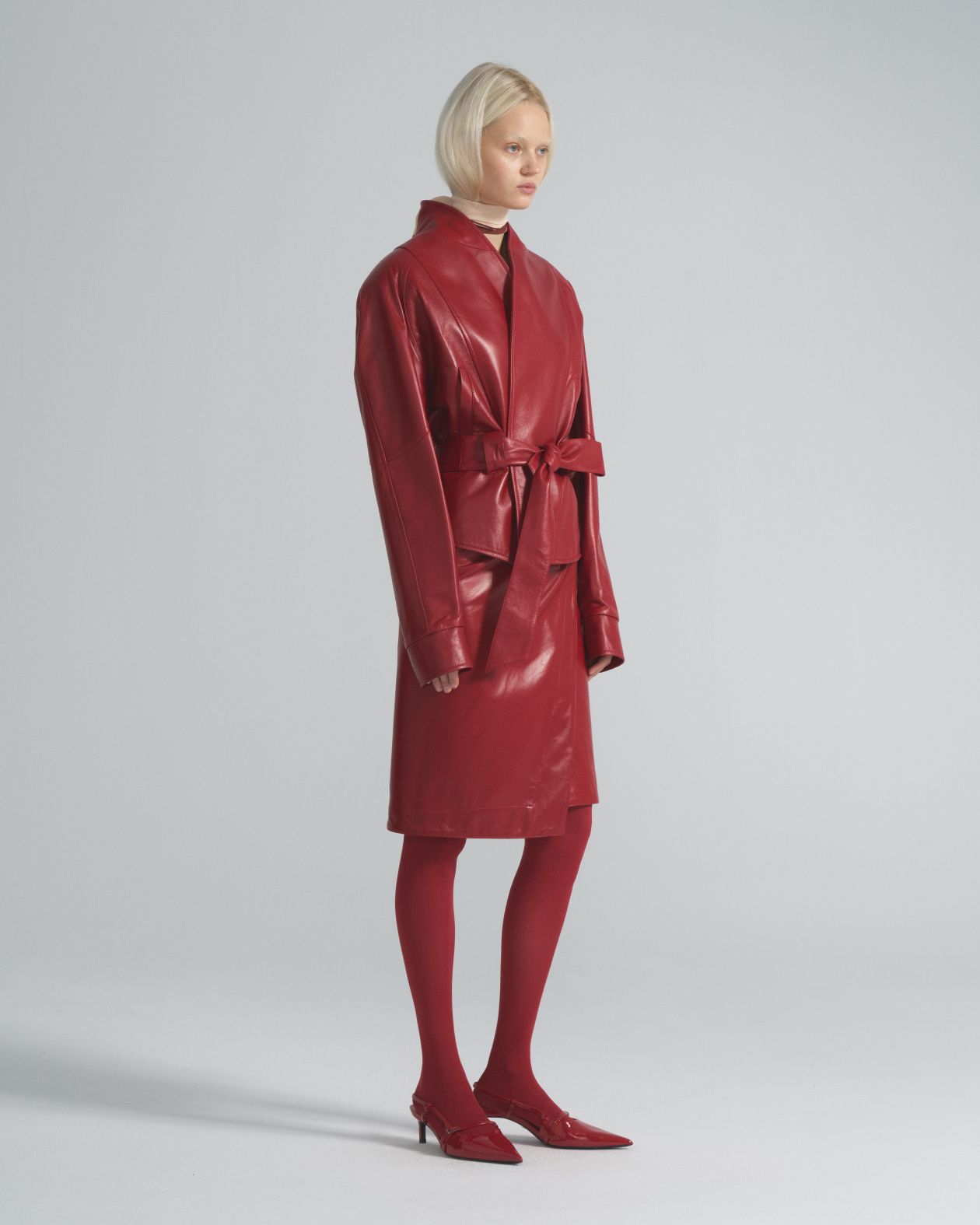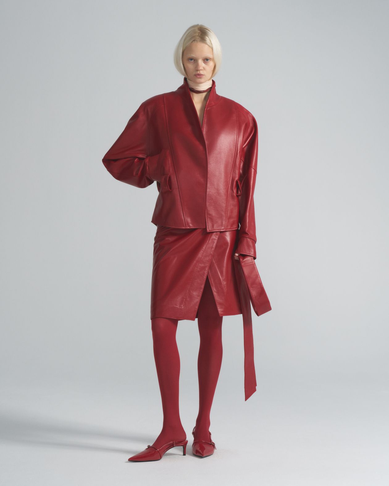 A fitted handmade genuine leather jacket of premium quality with a belt at the waist. Voluminous sleeves with cuffs, stand-up collar, leather-covered button.Composition: 100% natural leather