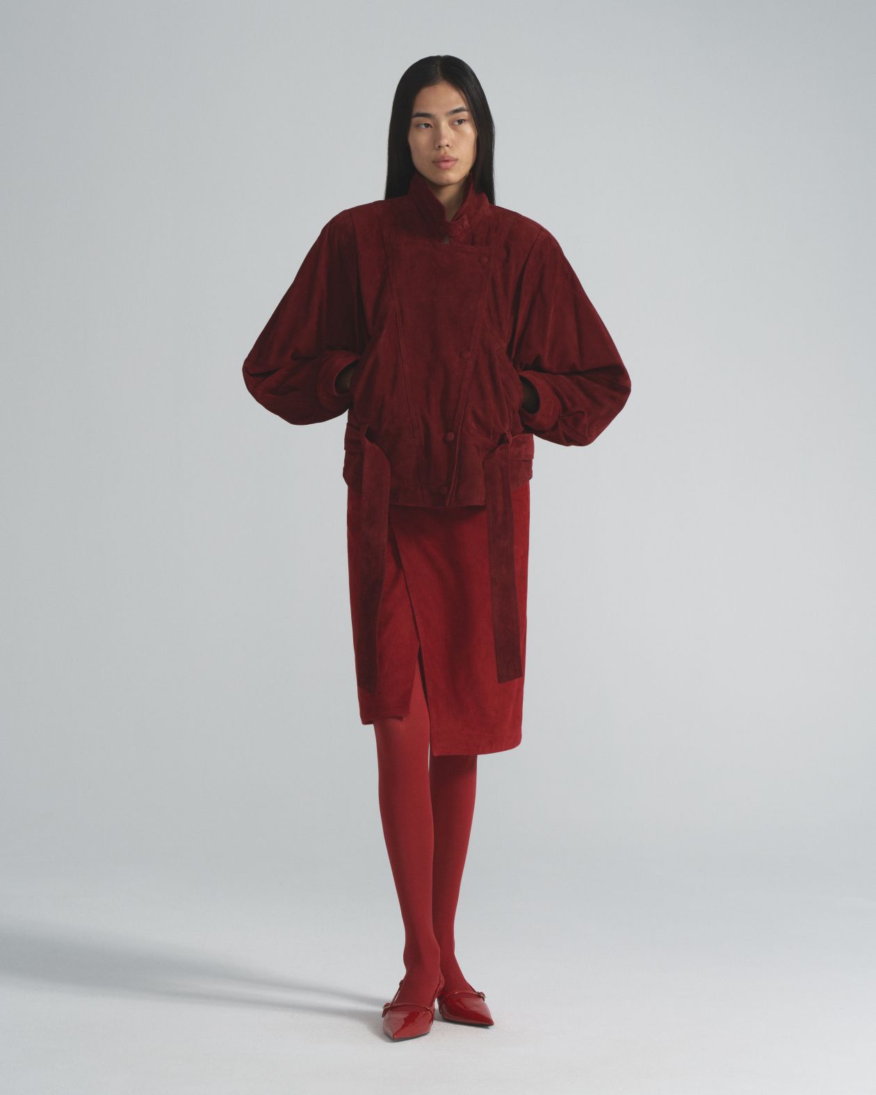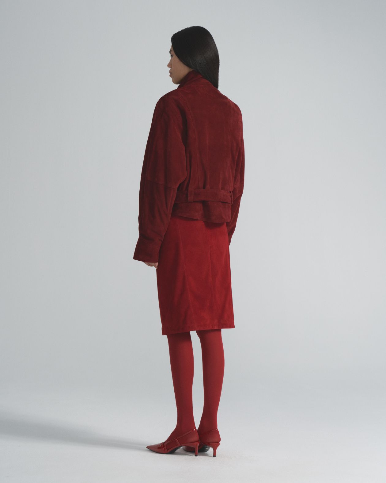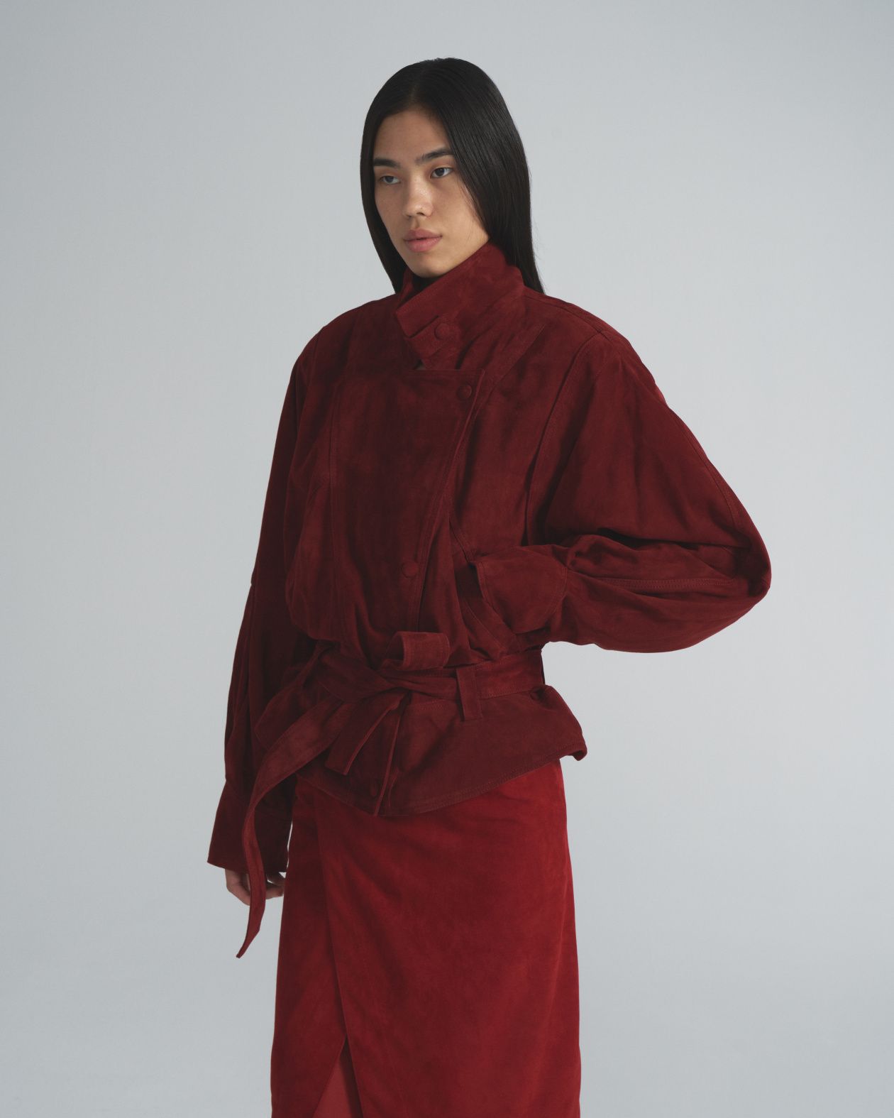 Handmade jacket made of premium quality soft suede in the style of the 80s, with a smooth shoulder line, lapels and a belt that accentuates the waist. It is made with insulated lining, providing comfort in the cool season.Composition: 100% natural suede/leather