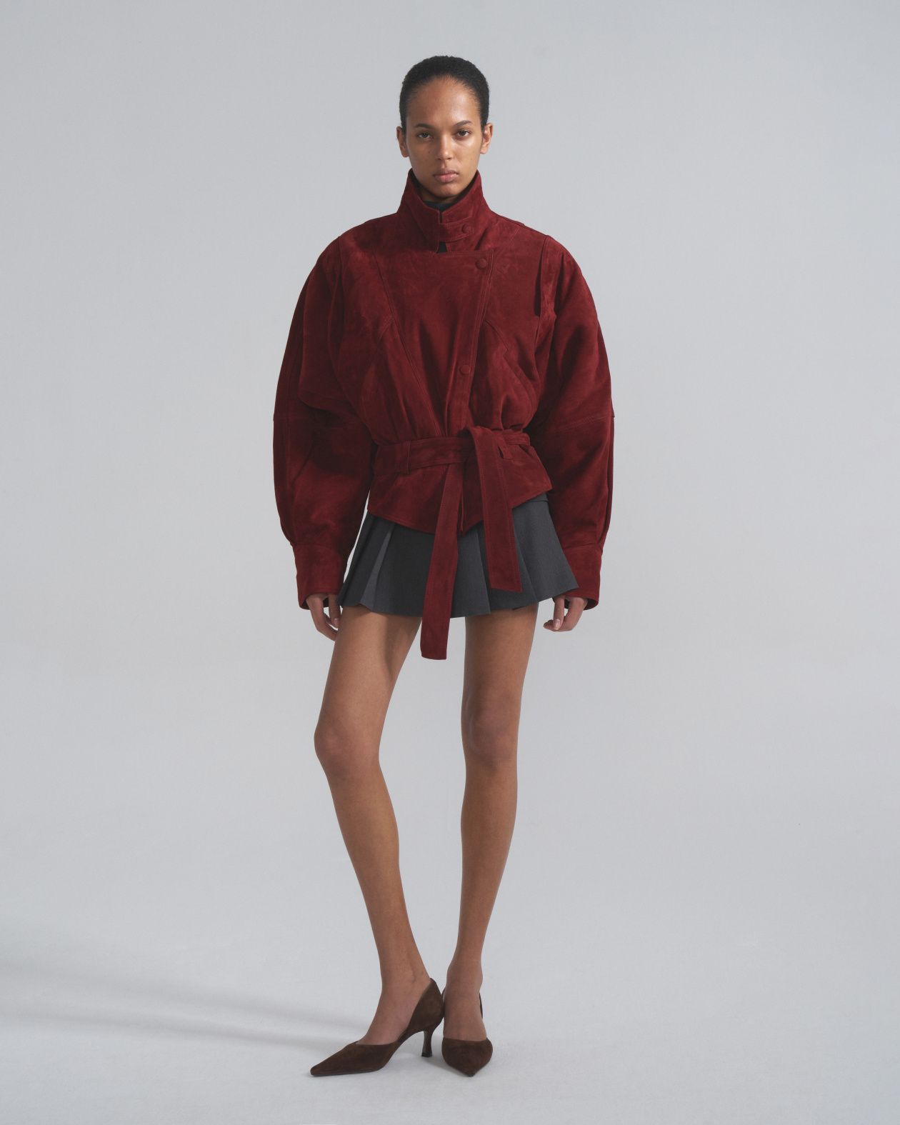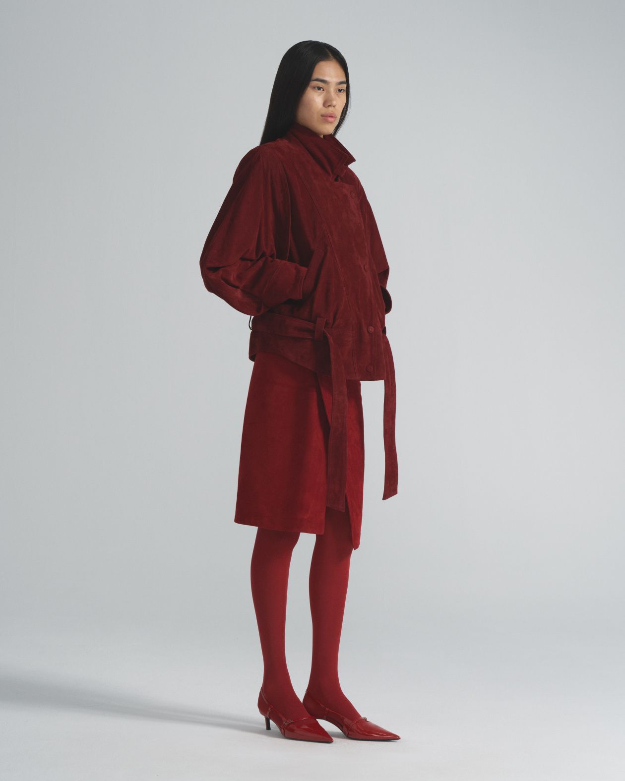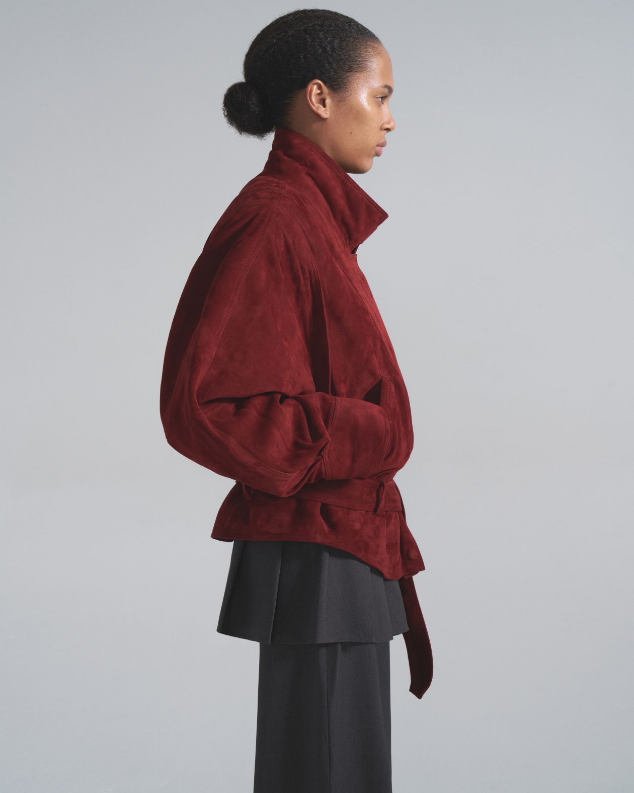 Handmade jacket made of premium quality soft suede in the style of the 80s, with a smooth shoulder line, lapels and a belt that accentuates the waist. It is made with insulated lining, providing comfort in the cool season.Composition: 100% natural suede/leather