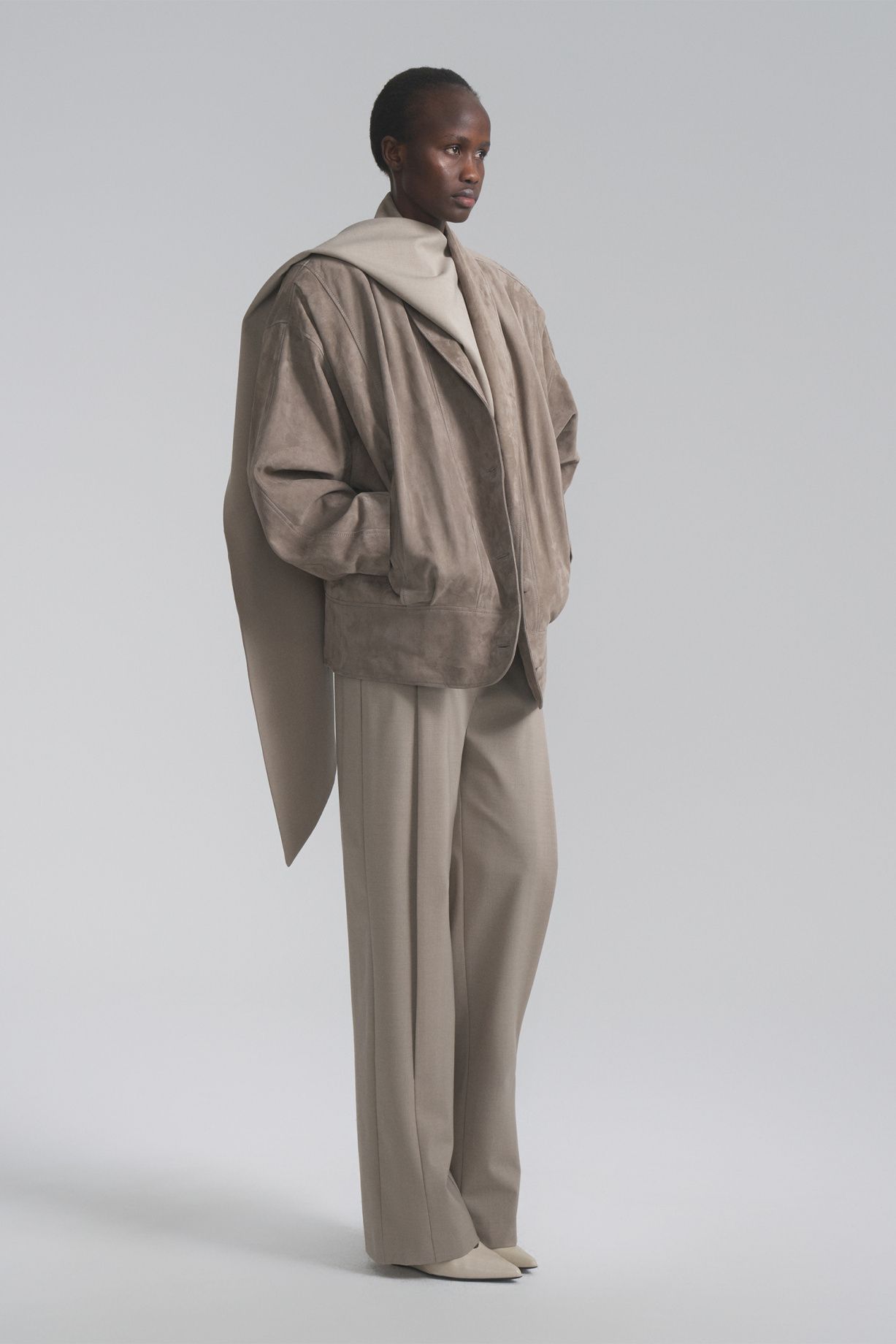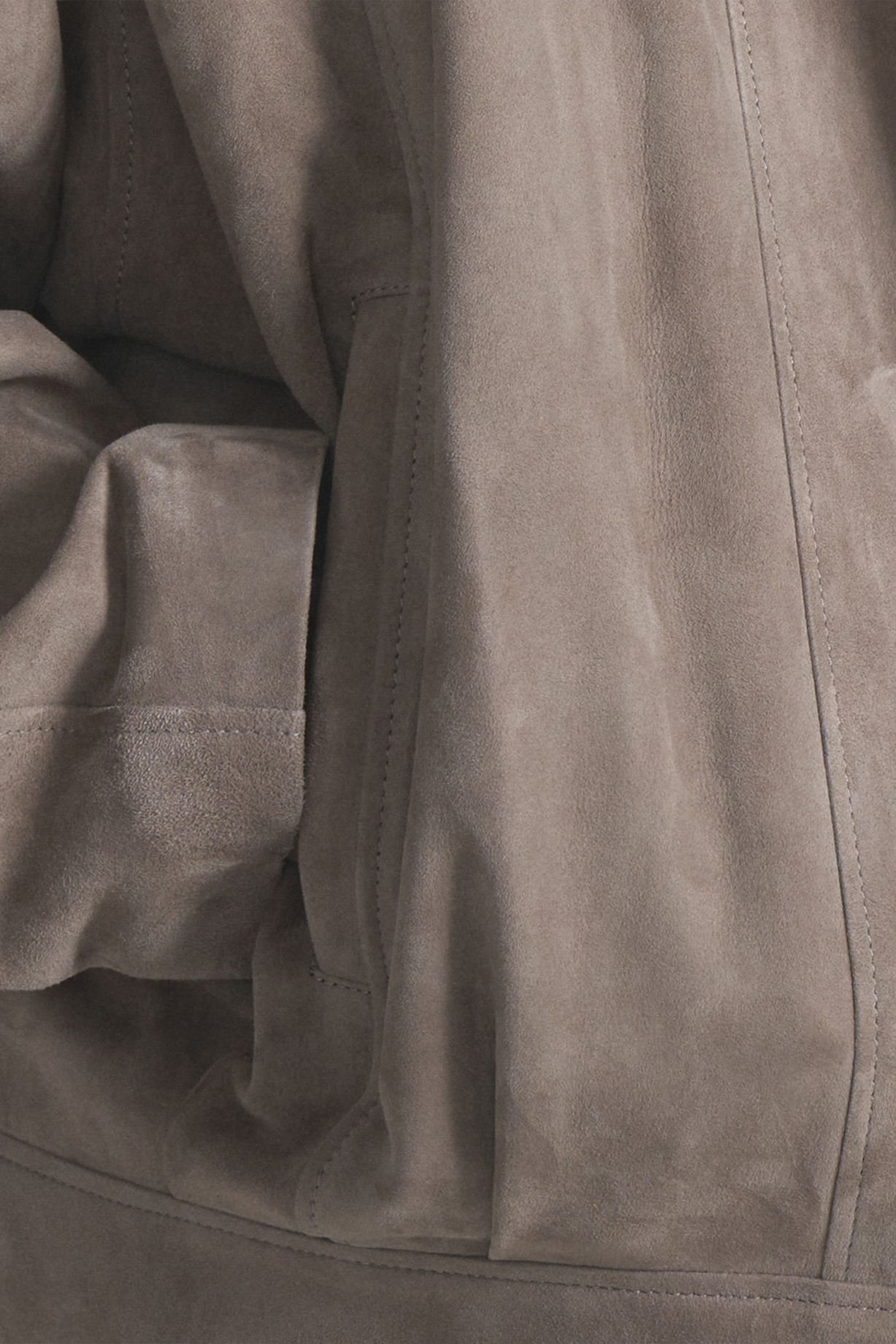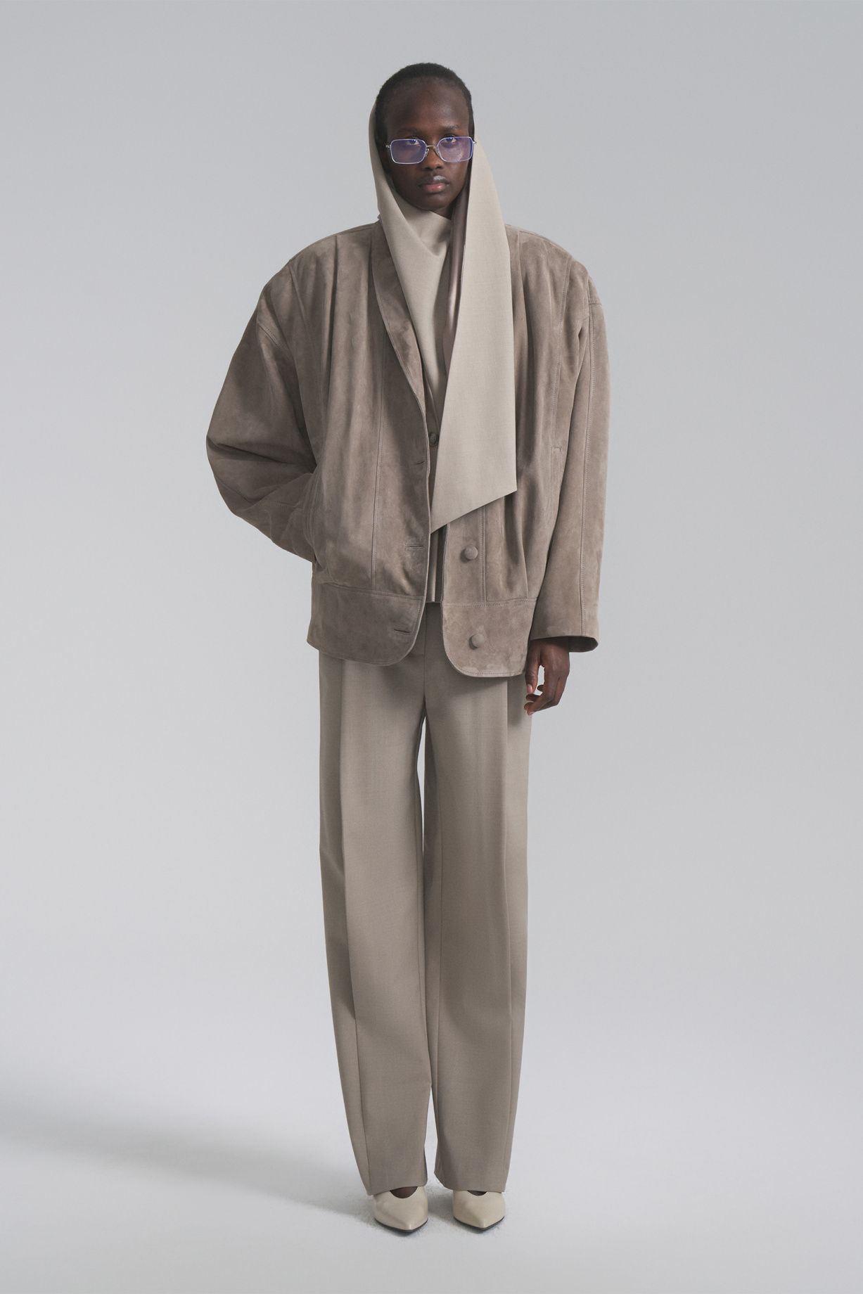 A voluminous handmade jacket made of premium quality soft suede with accent shoulders, dropped shoulder fabric and a low waist in the style of the 80s. A shawl collar, suede-covered buttons and a wide sleeve complement the distinctive cut.Composition: The upper of the product is suede sheepskin, lining: 87% polyester, 10% viscose, 3% elastane