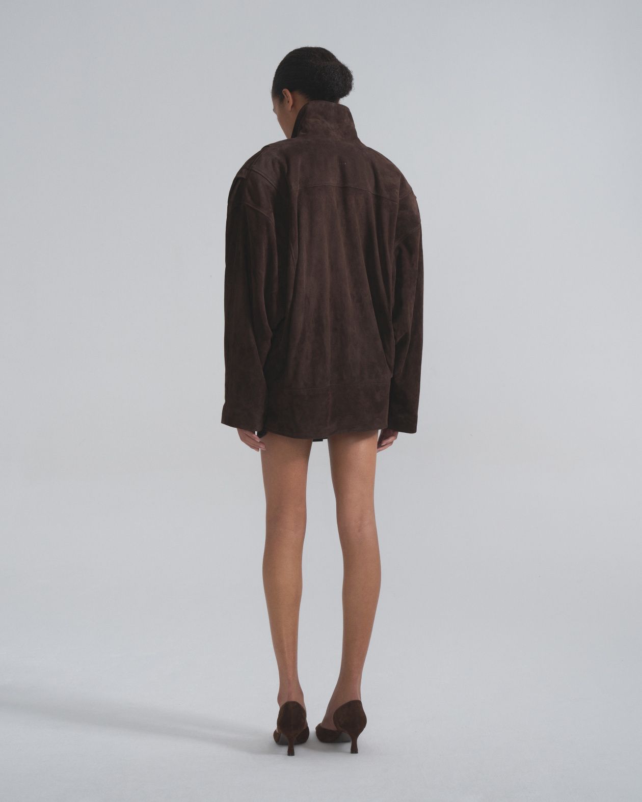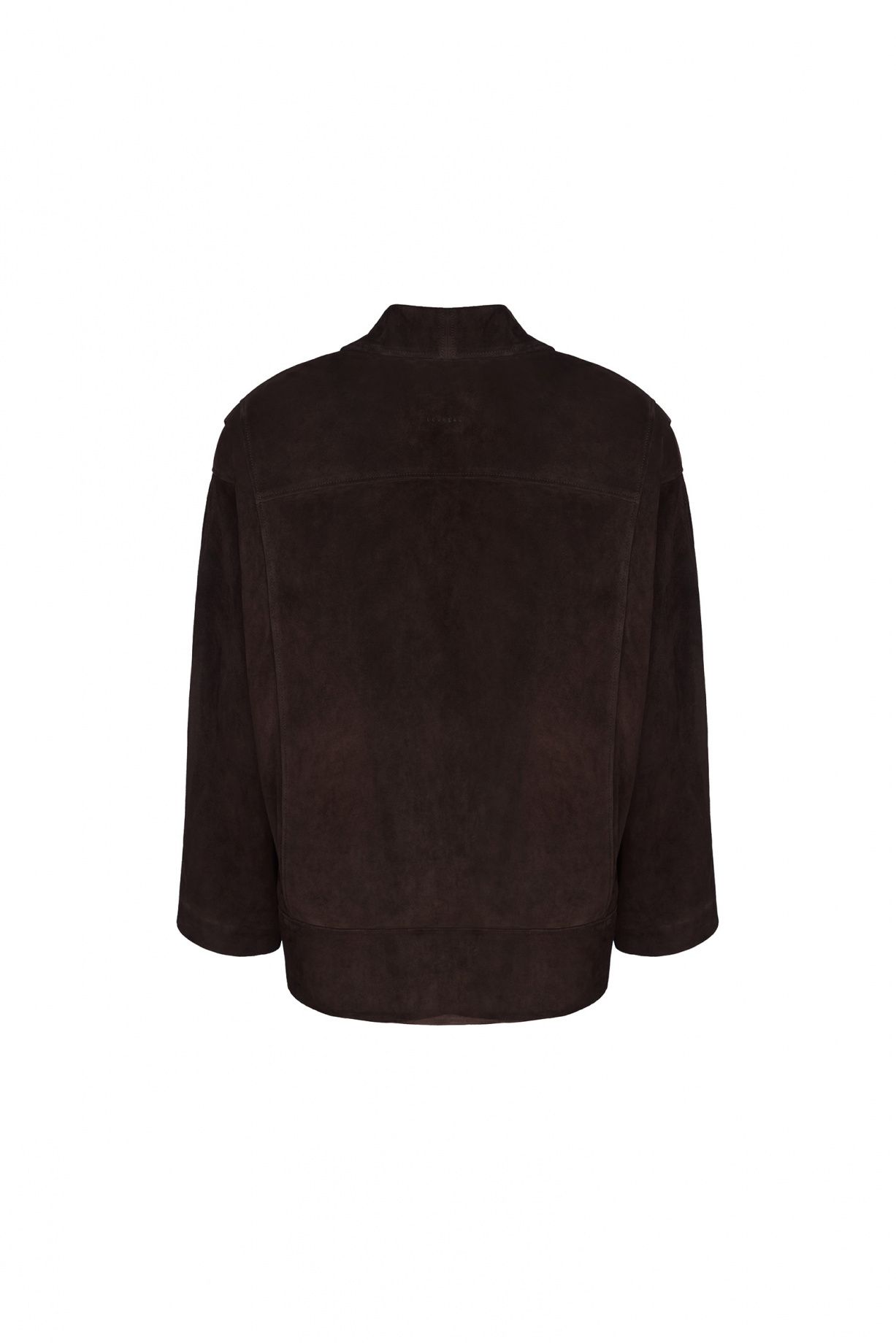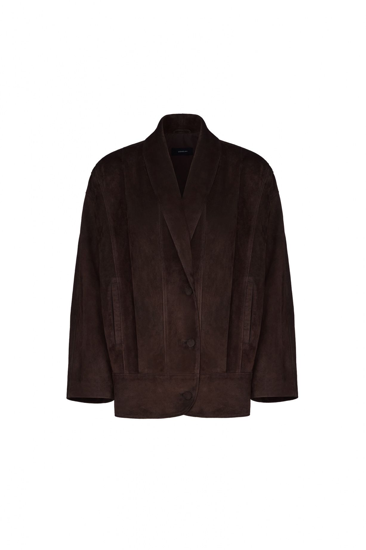A voluminous handmade jacket made of premium quality soft suede with accent shoulders, dropped shoulder fabric and a low waist in the style of the 80s. A shawl collar, suede-covered buttons and a wide sleeve complement the distinctive cut.Composition: 100% sheepskin, lining 87% polyester, 10% viscose, 3% elastane