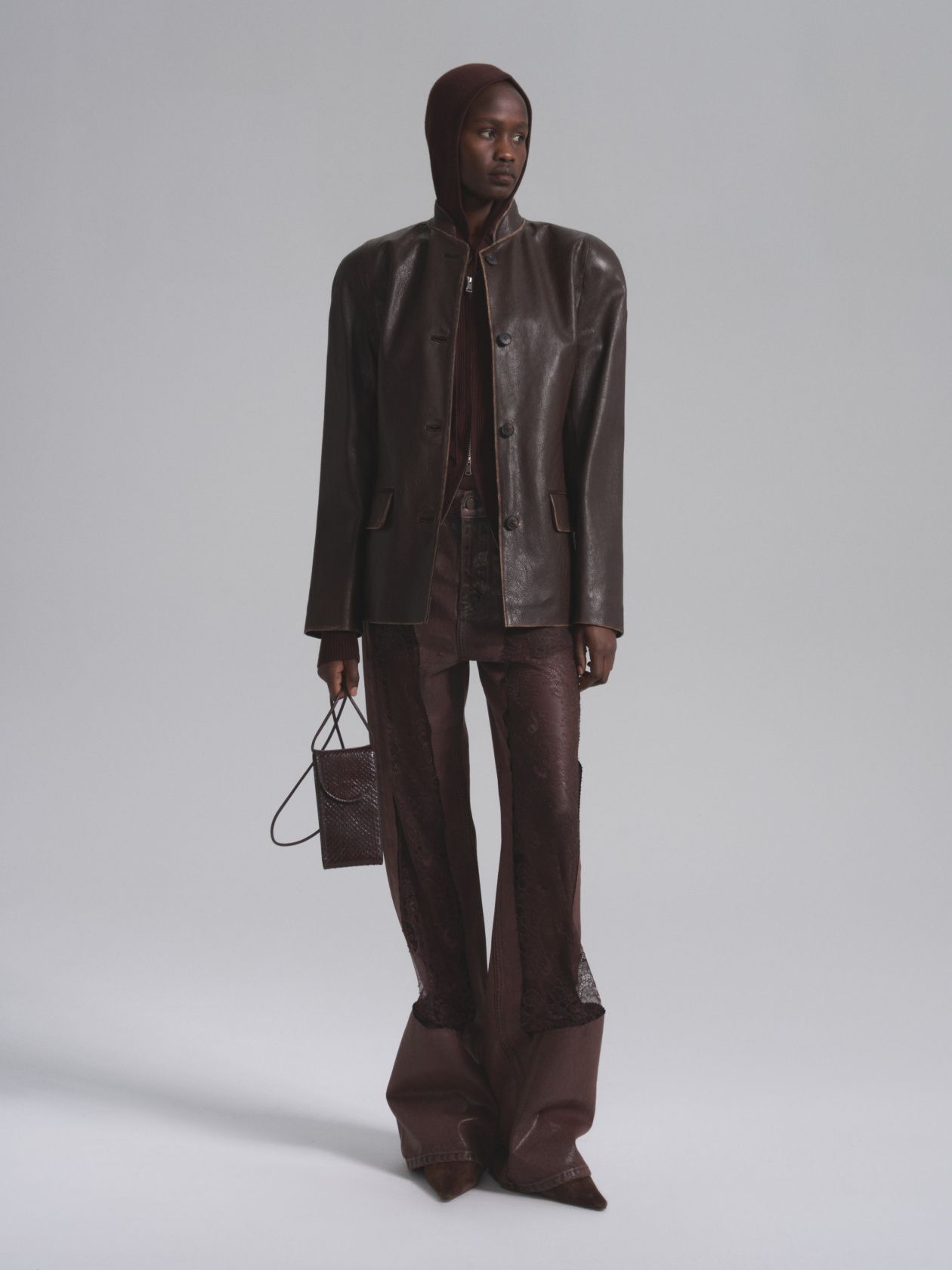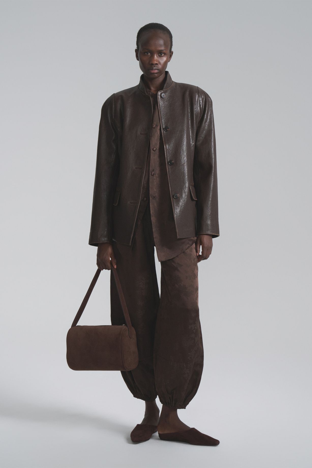 Fitted jacket made of premium quality genuine leather with a vintage handmade effect, stand-up collar, voluminous shoulders, loose sleeve, single-breasted button closure.Composition: 100% sheepskin, lining is 75% cotton, 25% polyester