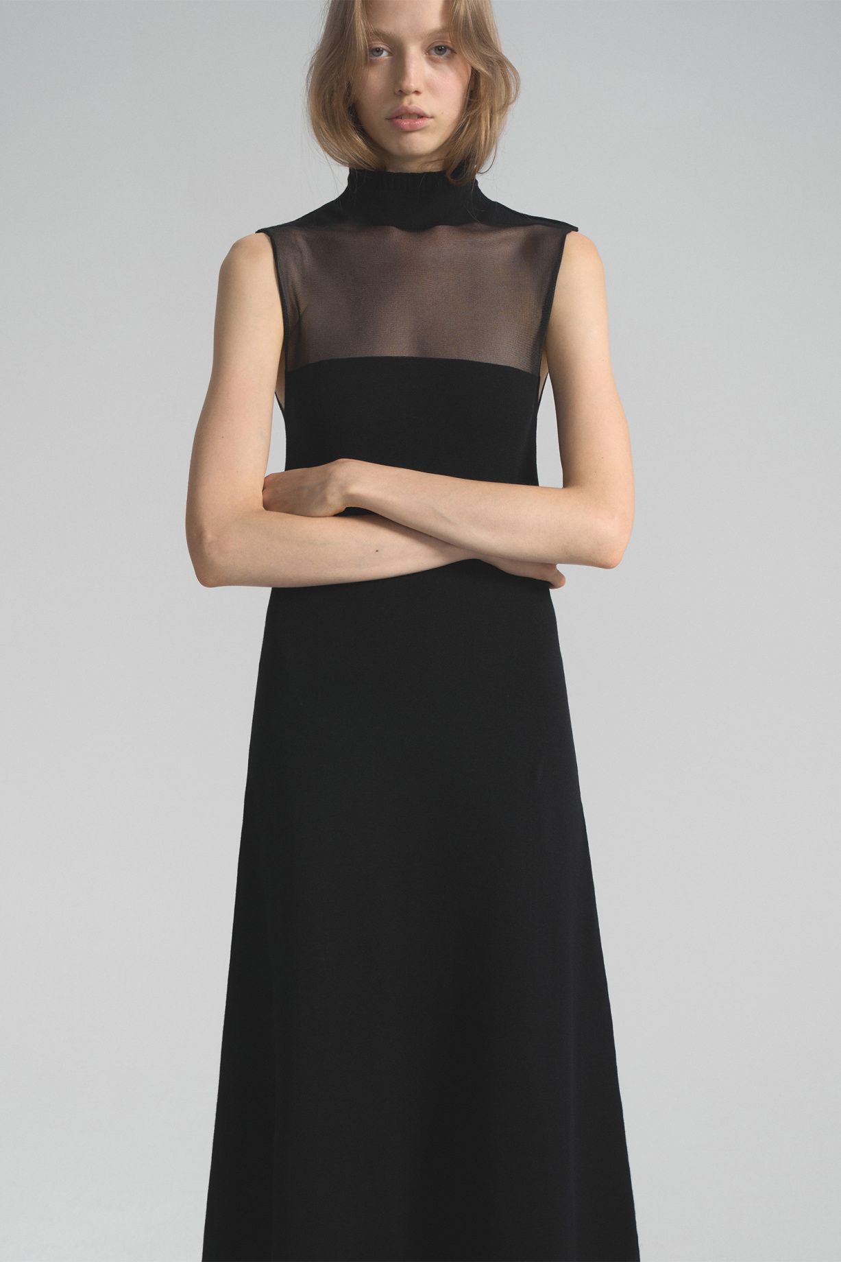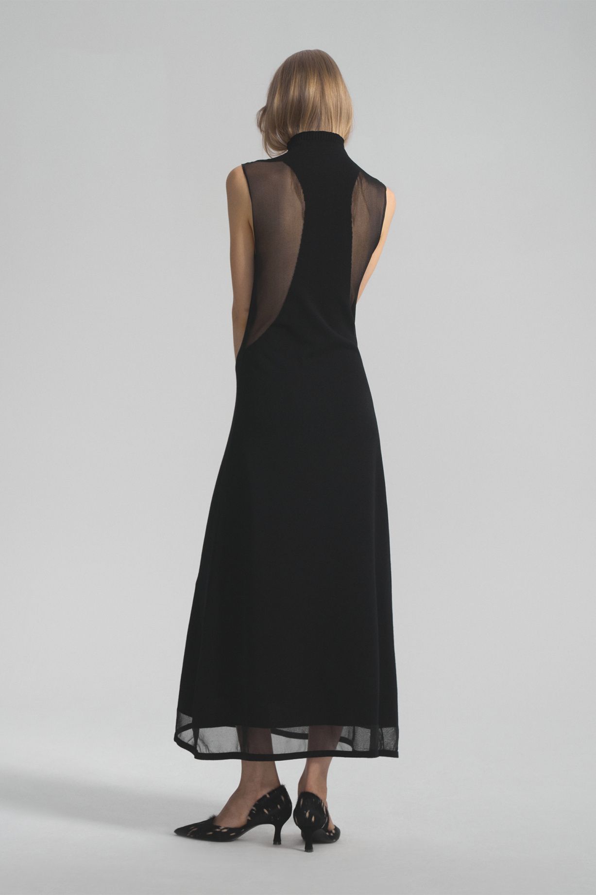 Knitted maxi dress made of soft knitwear. The design of the model is uniquely woven with transparent weightless yarn, which visually adds elegance to the silhouette.Composition: 61% viscose, 30% nylon, 9% elastane