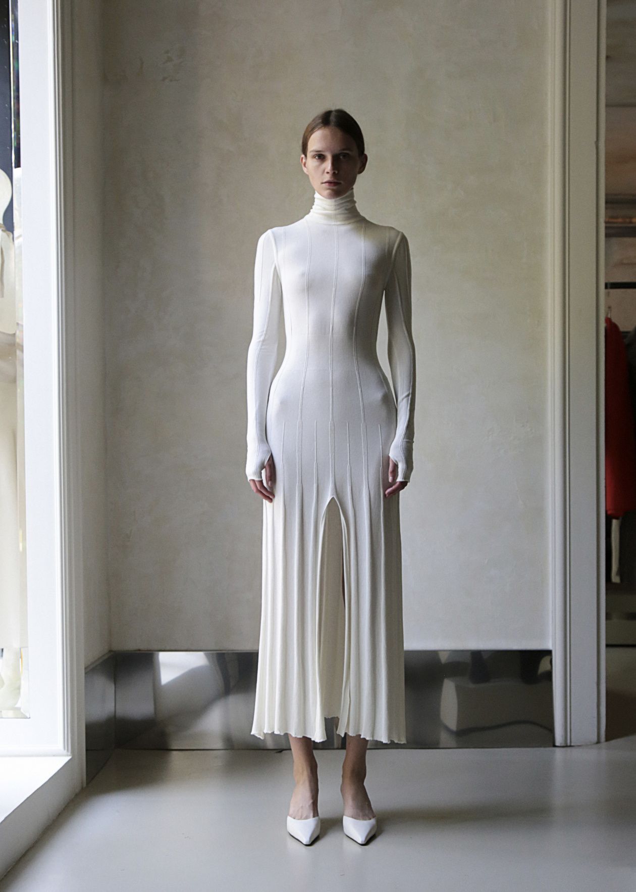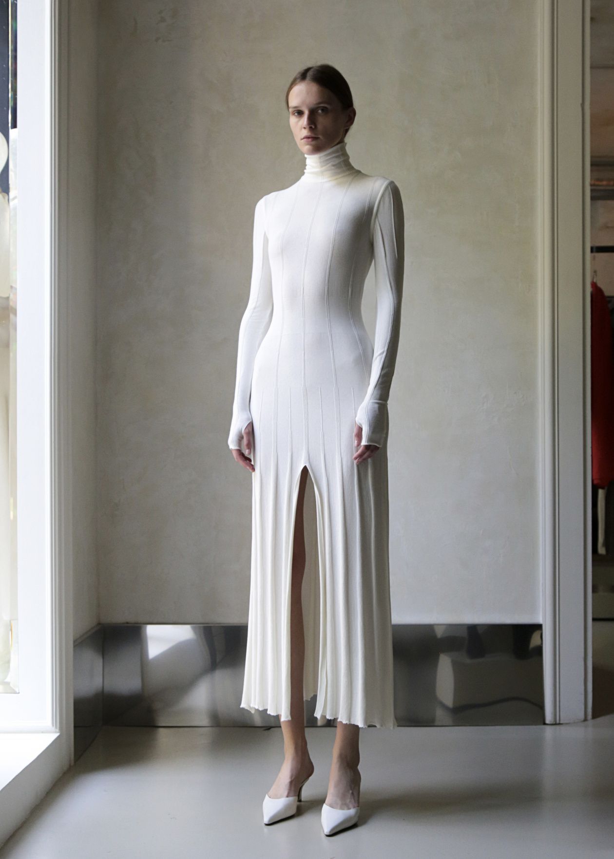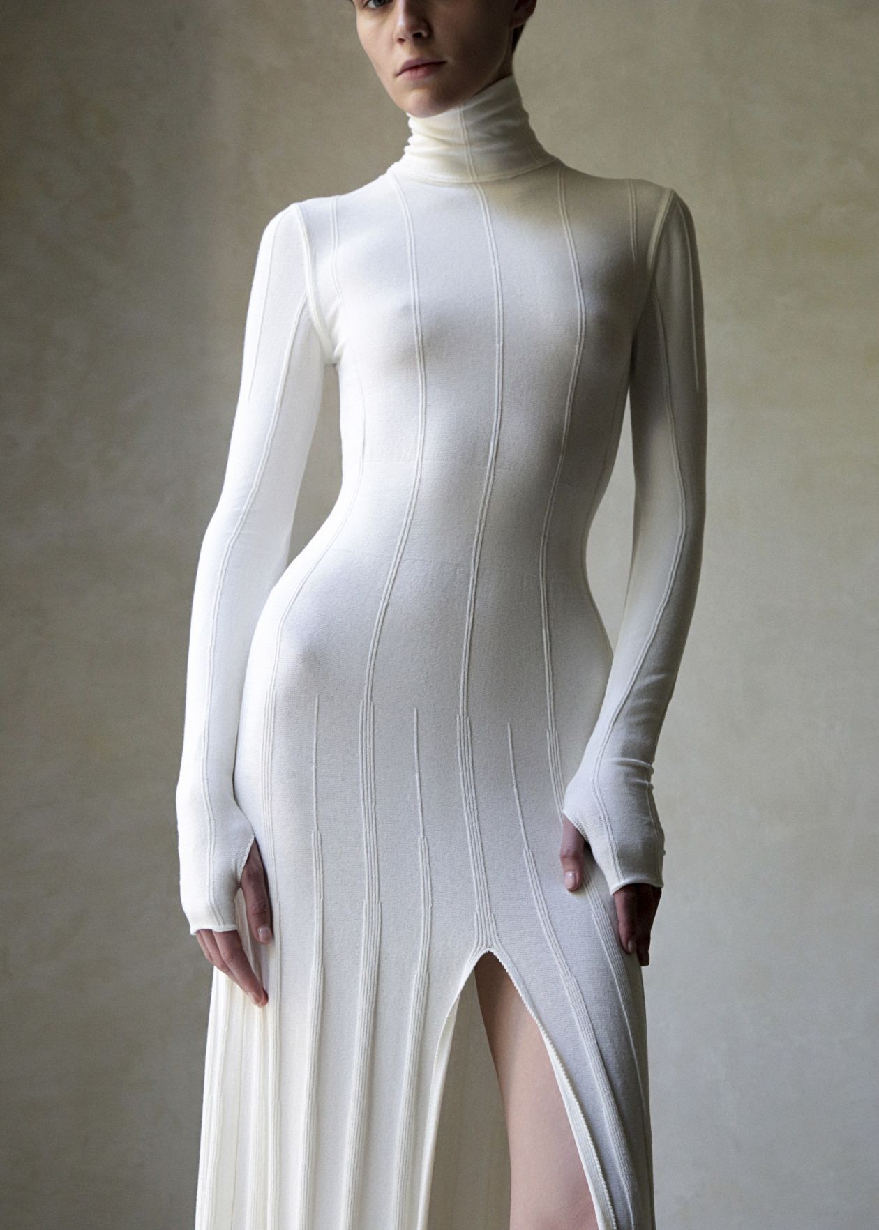 Long sleeves and a slit on the skirt at the front add femininity and sophistication to the dress. This dress can be easily combined with various accessories and shoes, creating a harmonious and complete look. Viscose provides softness and drape, and elastane adds elasticity for a perfect fit.Composition: 91% viscose, 9% elastane