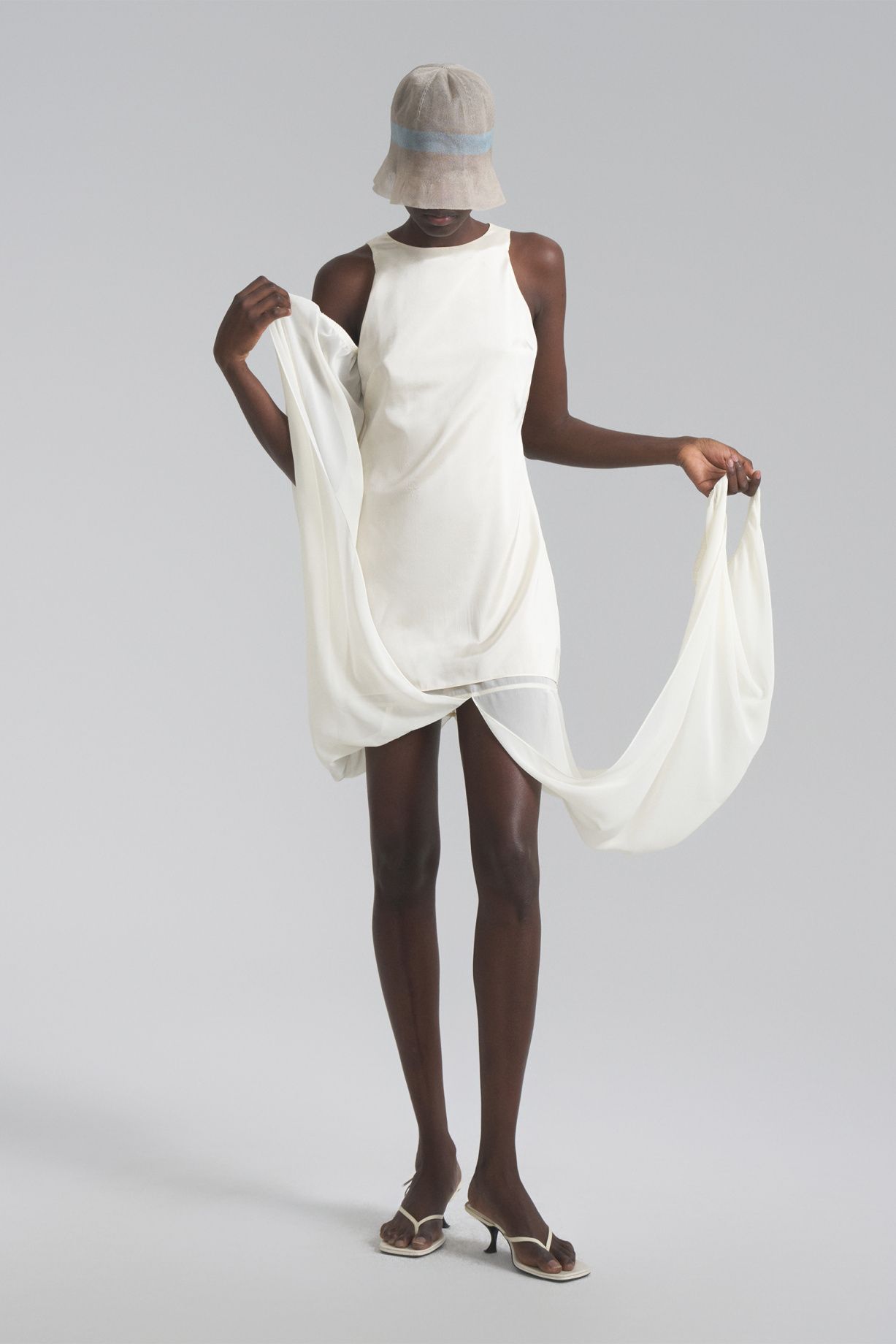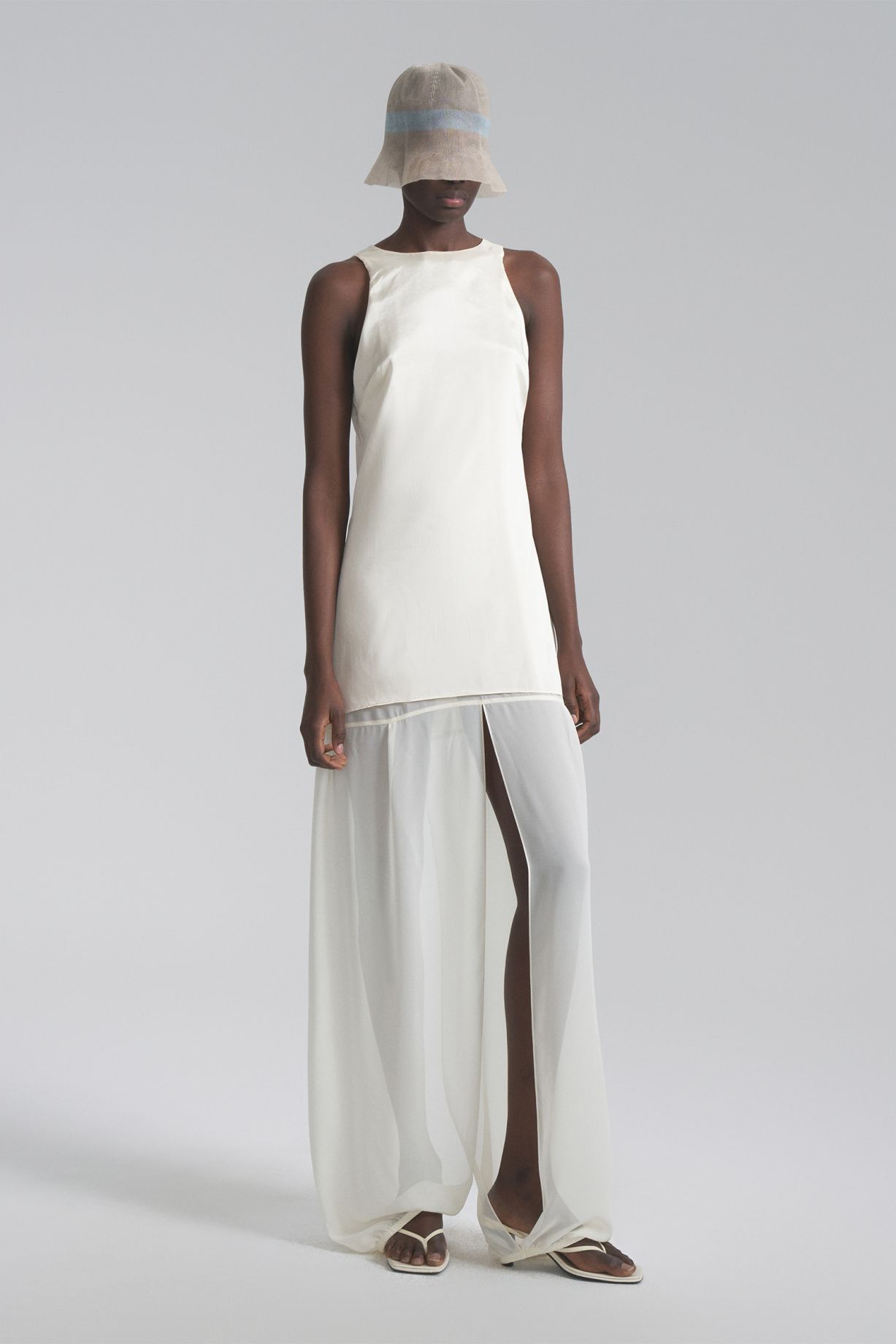 A dress made of 100% flowing silk with an additional construction in the form of trousers, which allows it to be decorated in different ways.Composition: 100% Silk