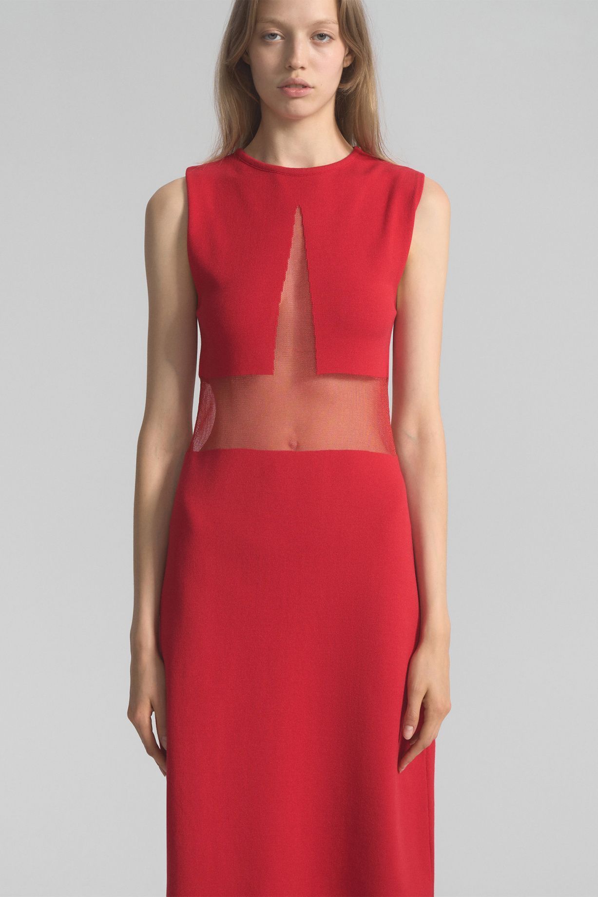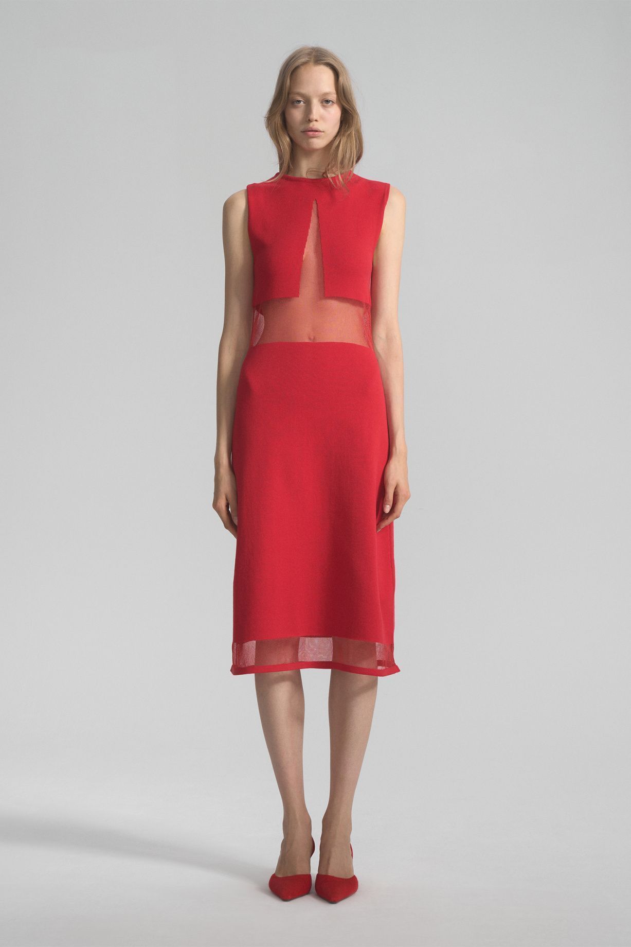 Knitted midi dress made of soft knitwear. The design of the model features a unique weave of transparent weightless yarn along the lines of the chest, back and bottom of the product, which visually add elegance to the silhouette.Composition: 61% viscose, 30% nylon, 9% elastane