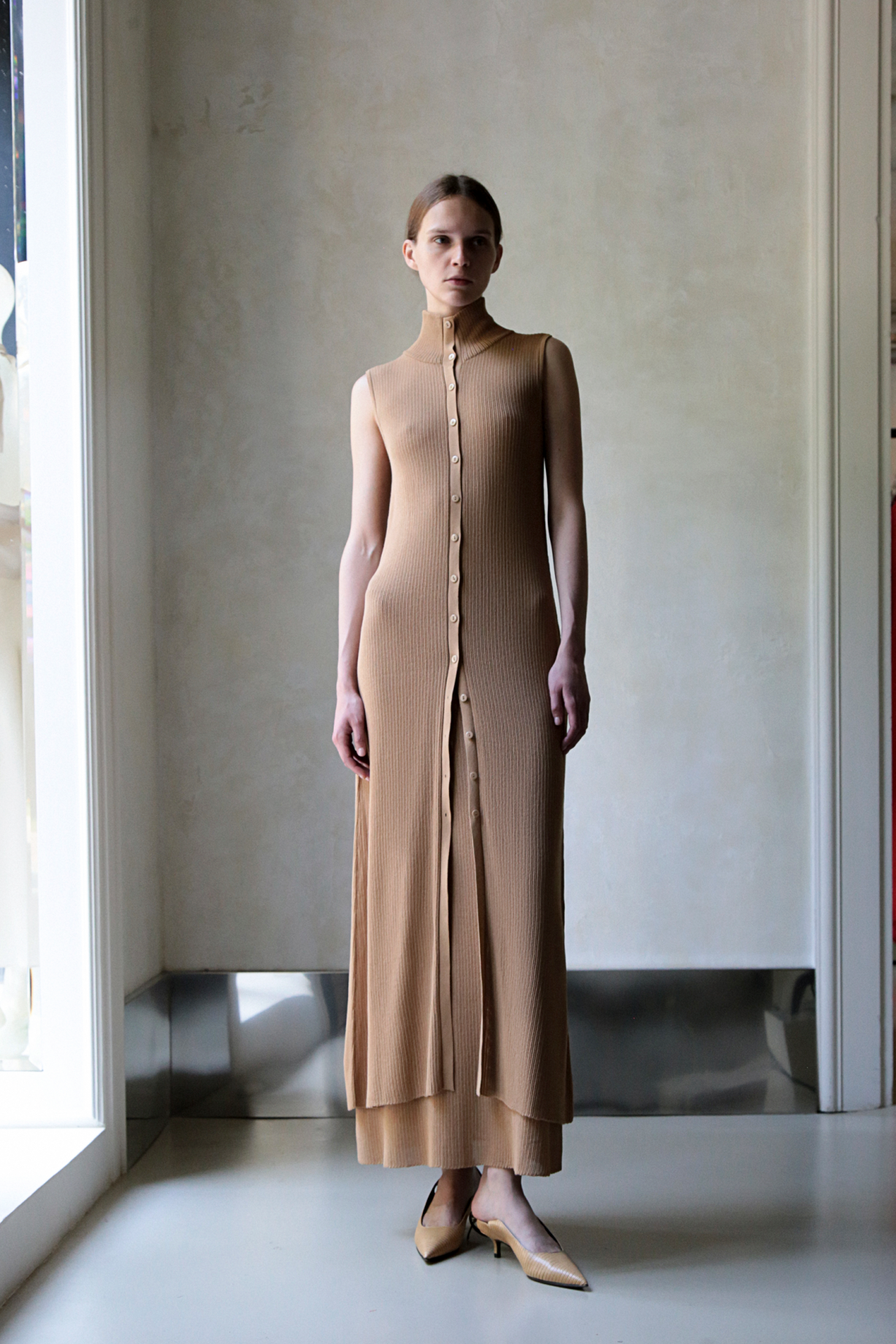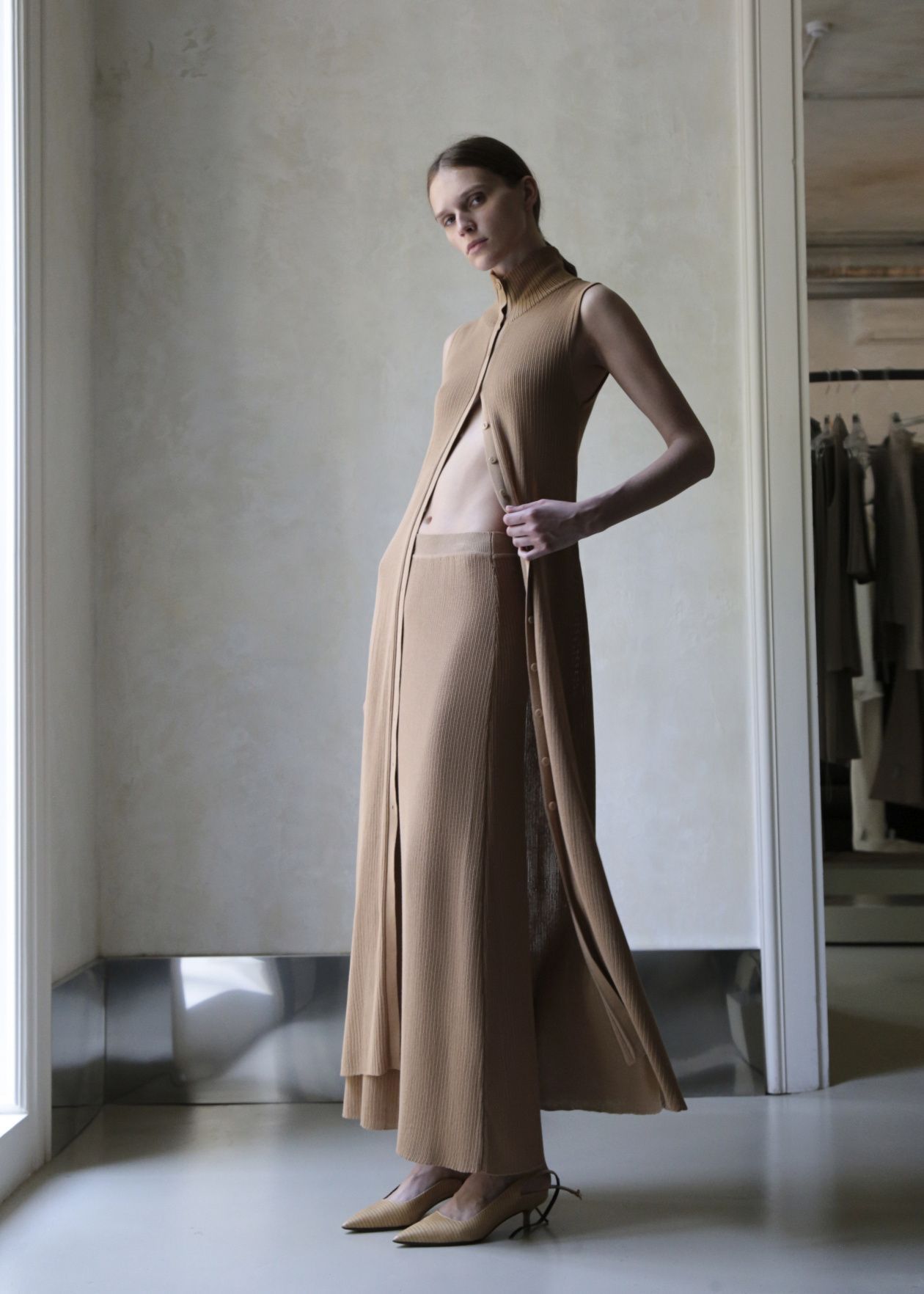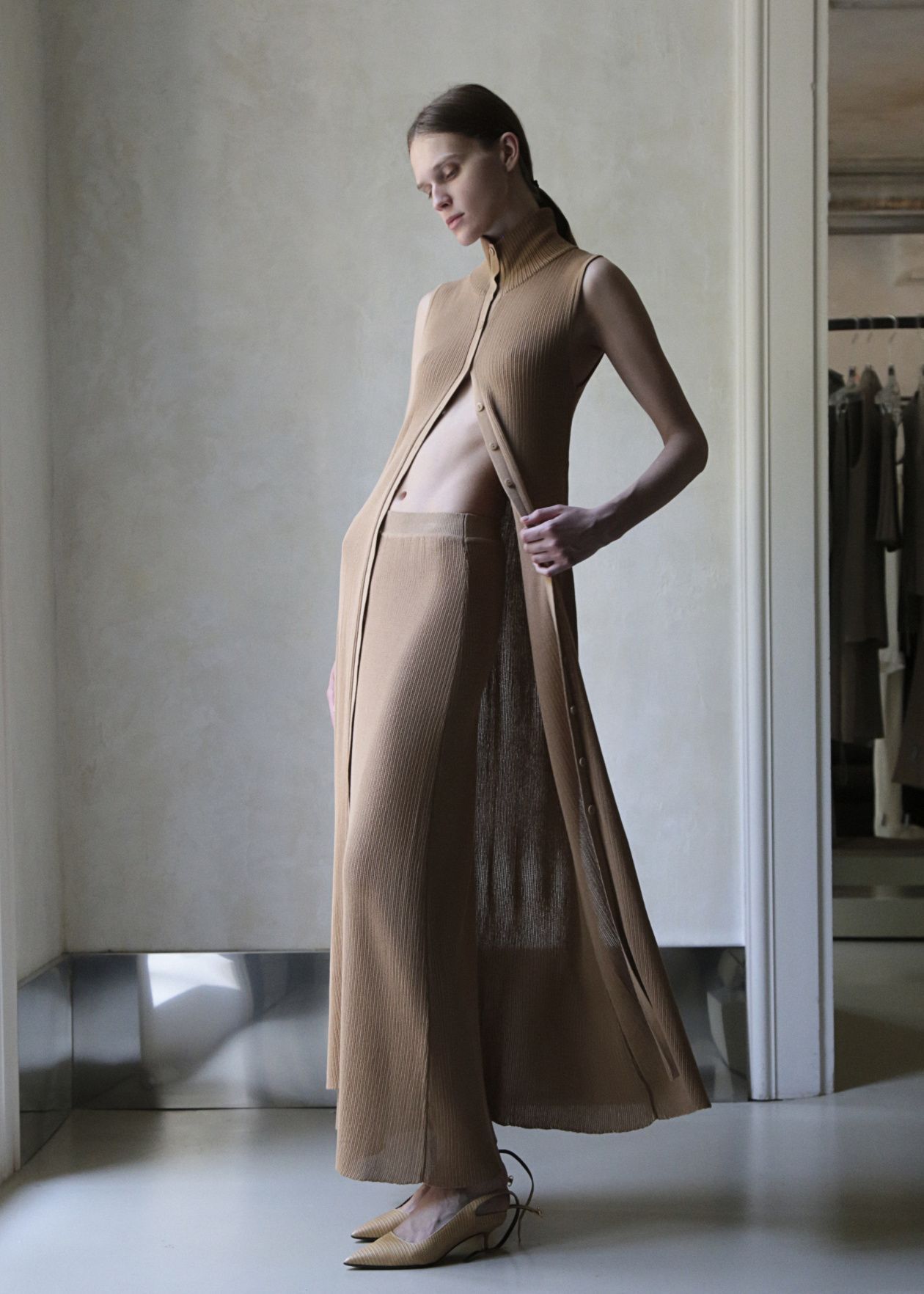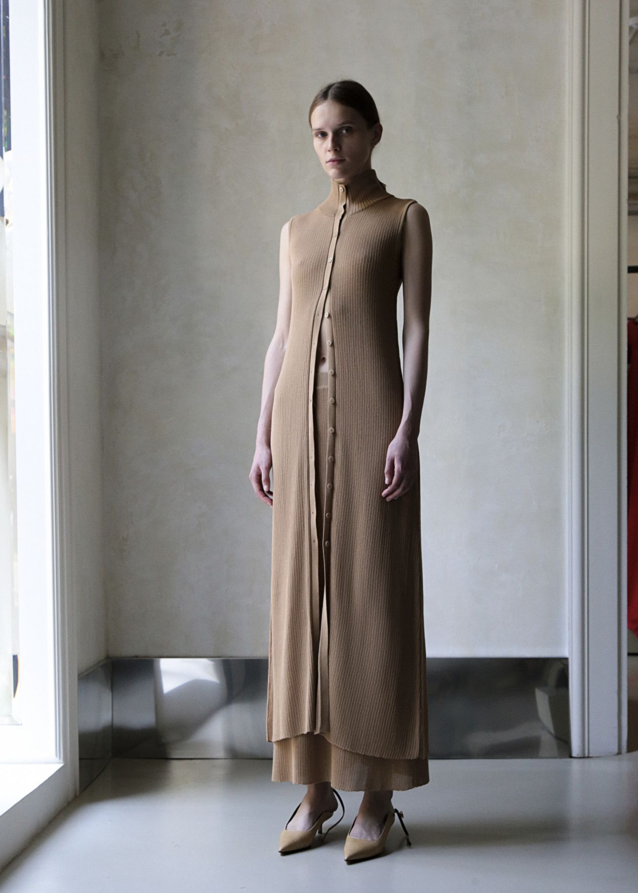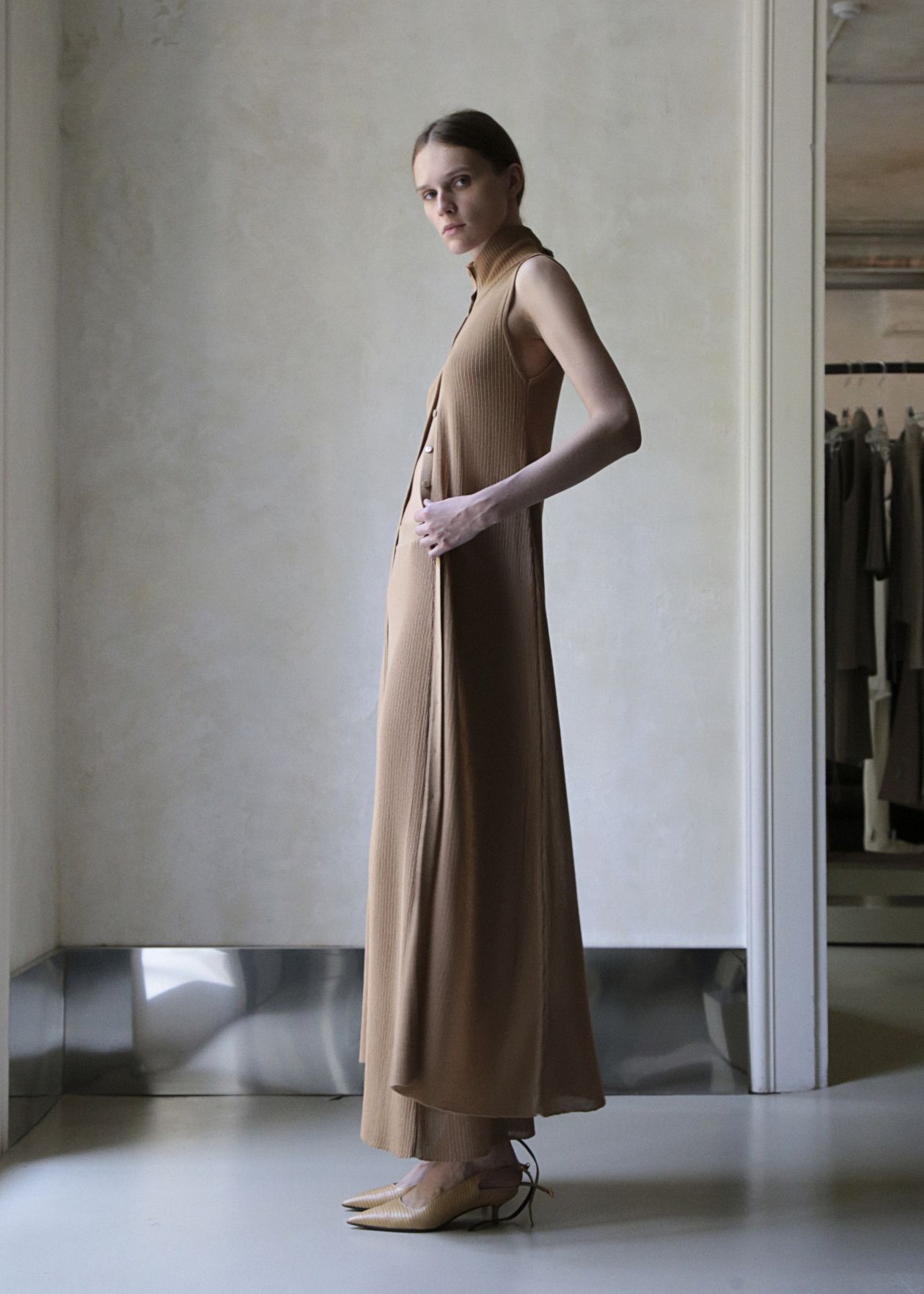 The Thilde maxi-length dress is buttoned with sleeveless buttons made of Italian knitwear.Composition: 91% viscose, 9% elastane
