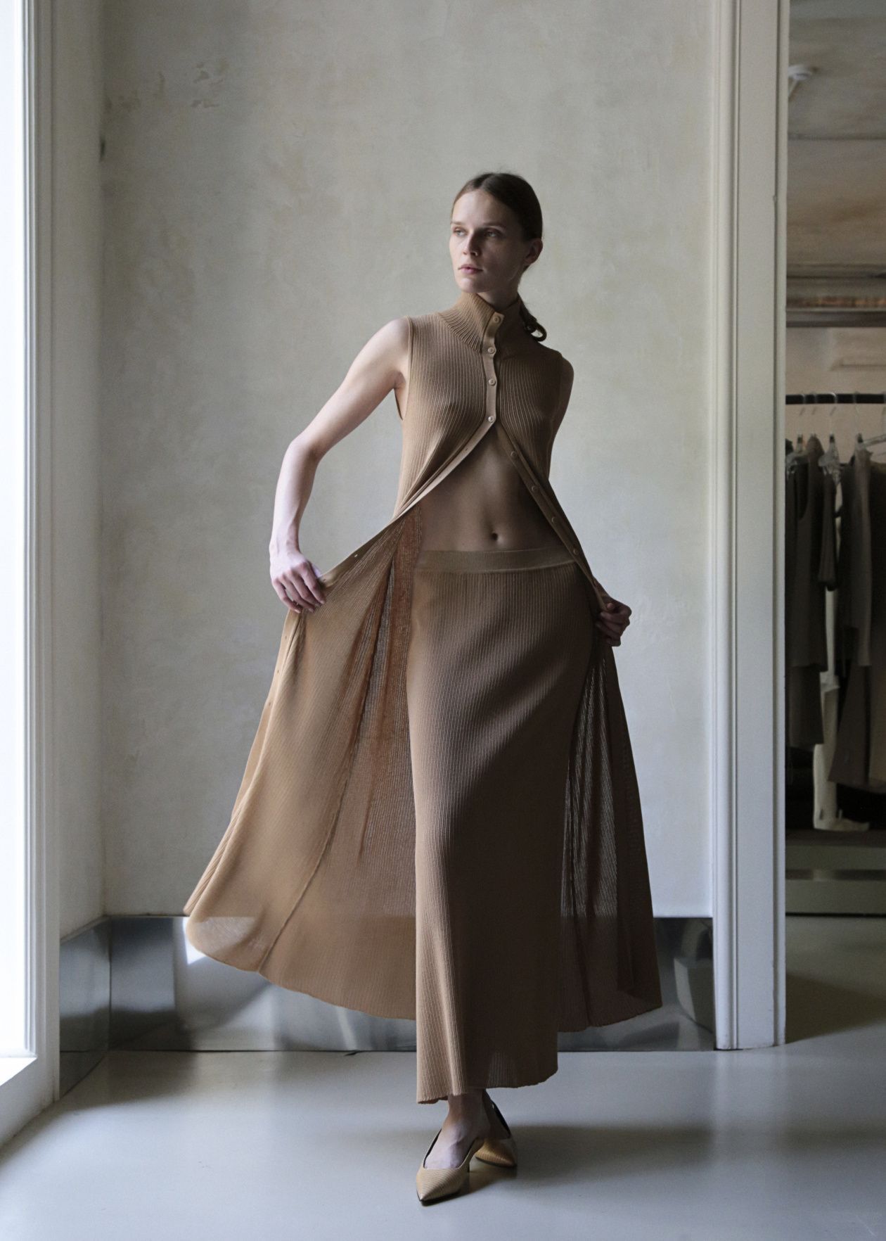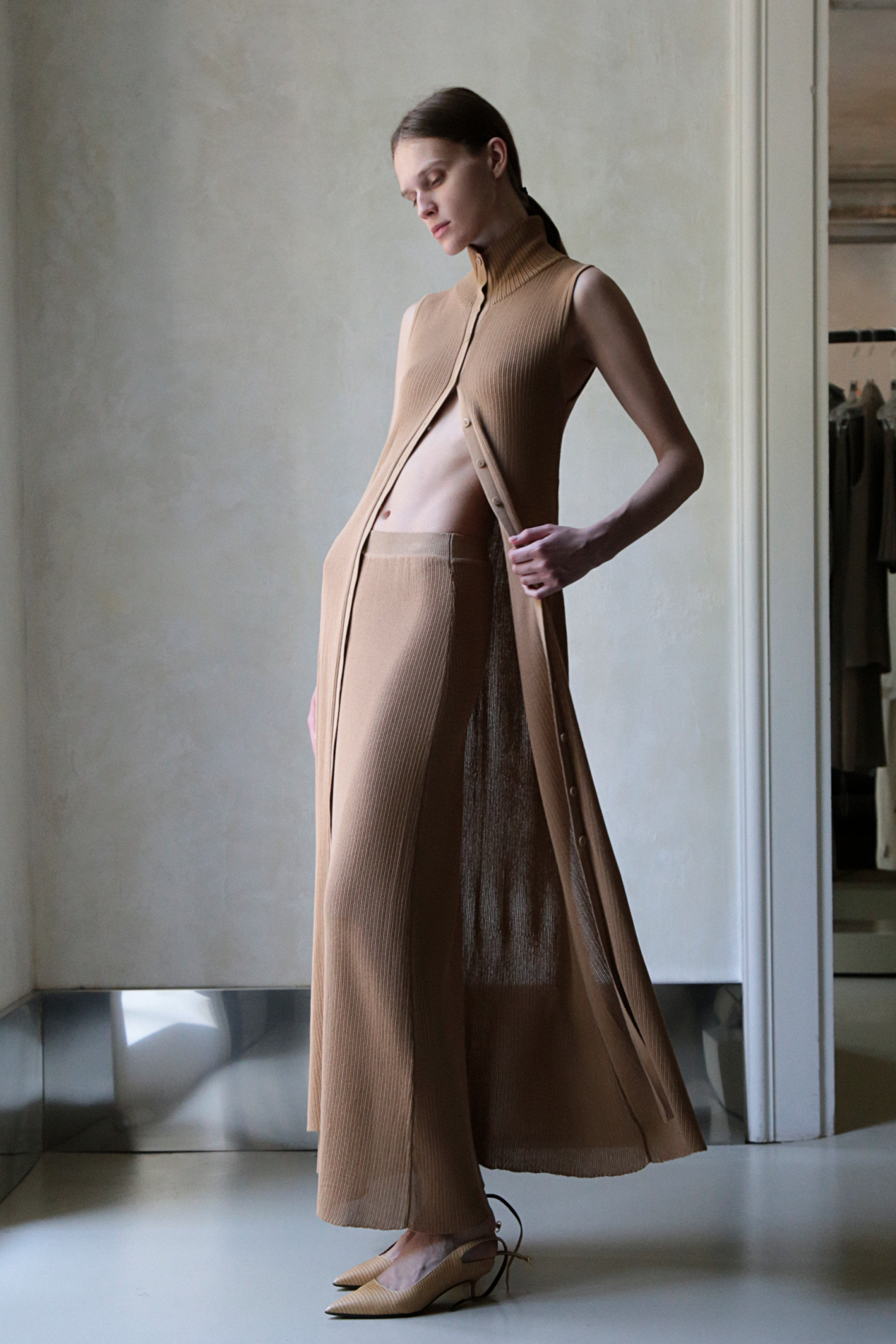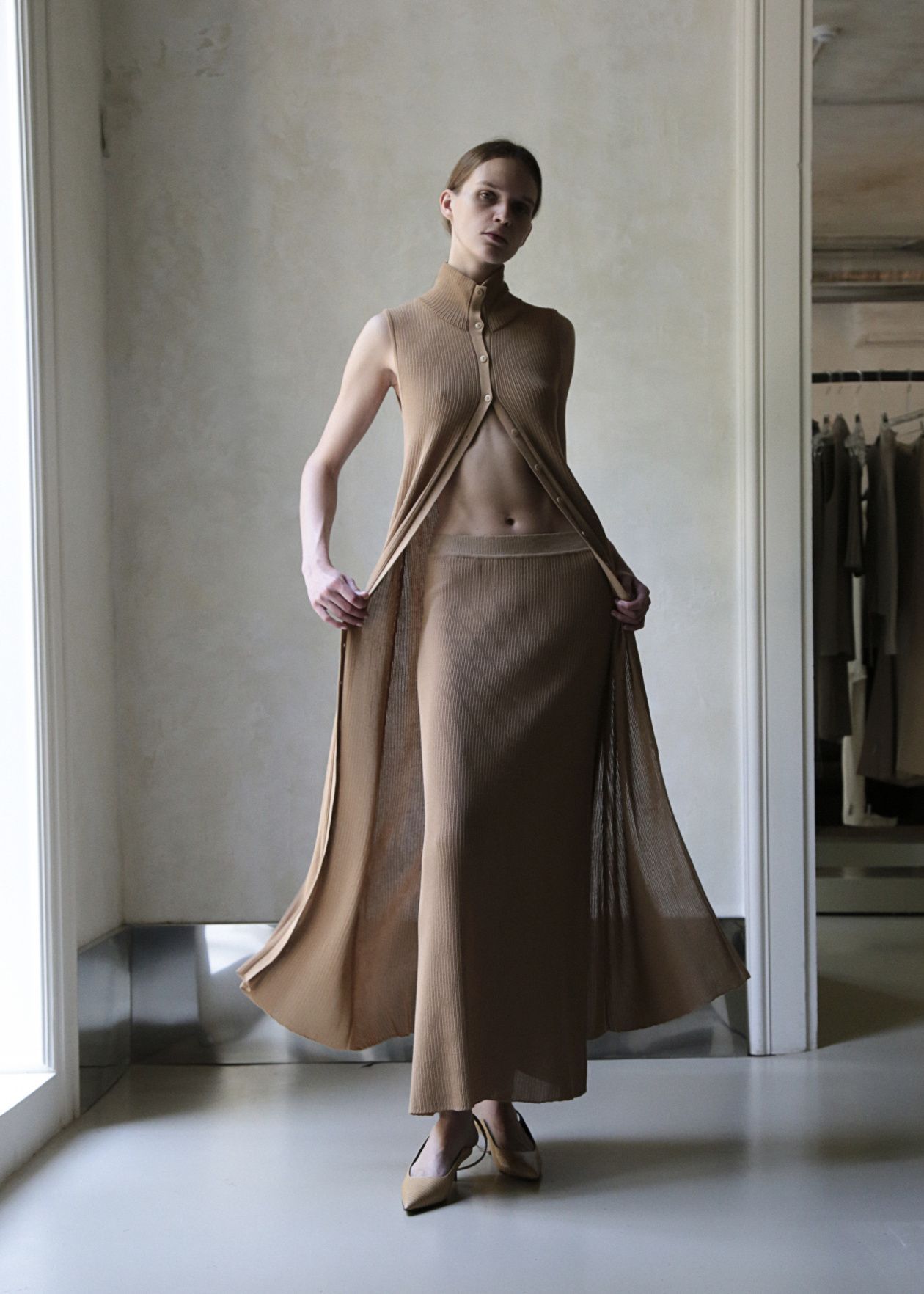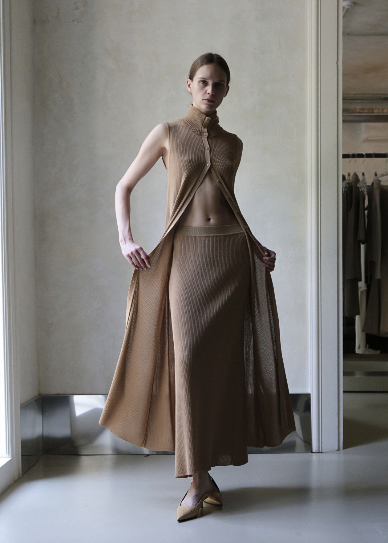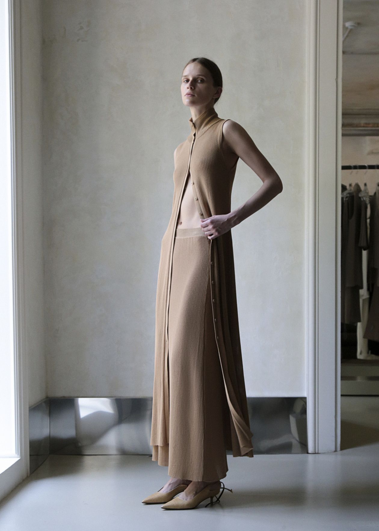 The Thilde maxi-length dress is buttoned with sleeveless buttons made of Italian knitwear.Composition: 91% viscose, 9% elastane