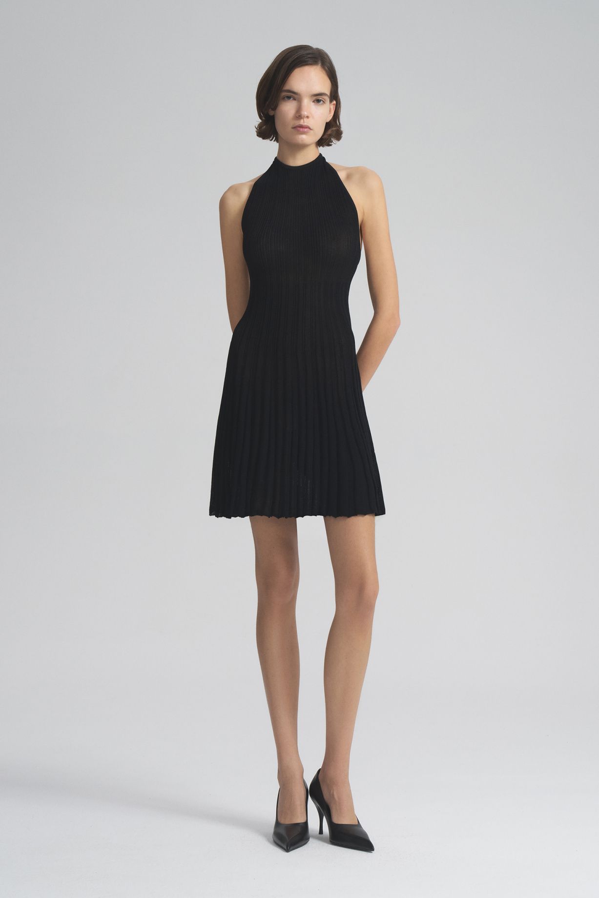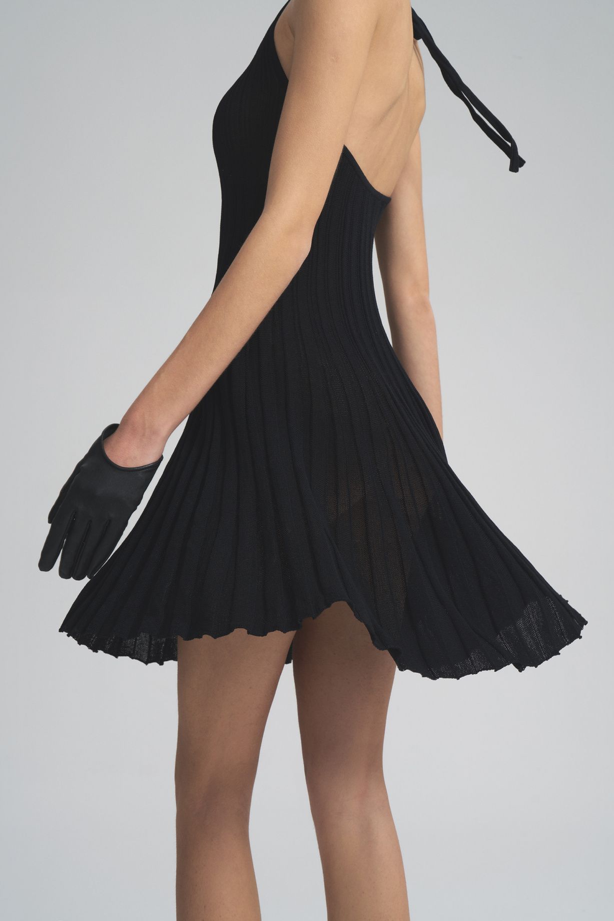The mini dress is tied up, its cut forms a fragile, elongated silhouette with an emphasis on the shoulder line, and deep armholes allow you to open your back. It is knitted from elastic thin Italian knitwear based on viscose. The material will provide softness, drapery and a pleasant texture.Composition: 100% viscose