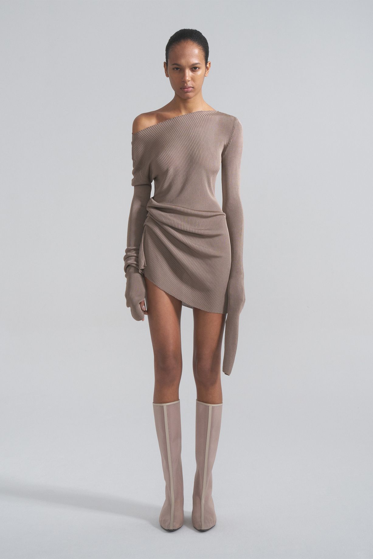 The dress has a fitted silhouette, long sleeves with cutouts under the finger, with an asymmetrical neck.Composition: 90% viscose, 10% silk