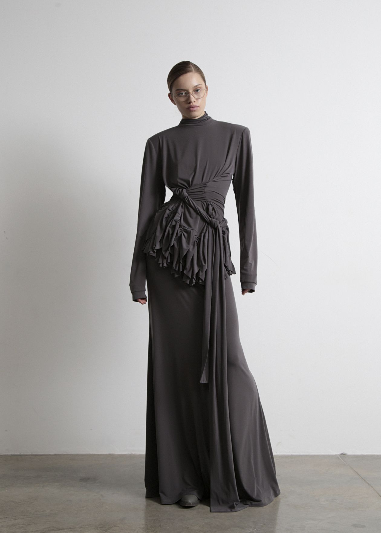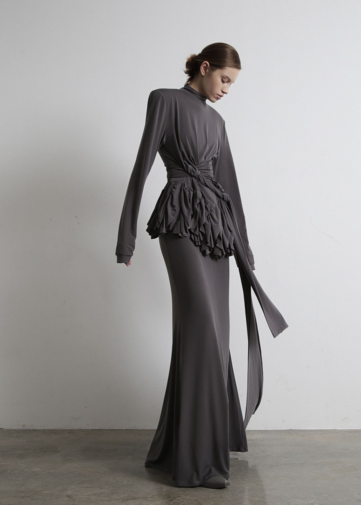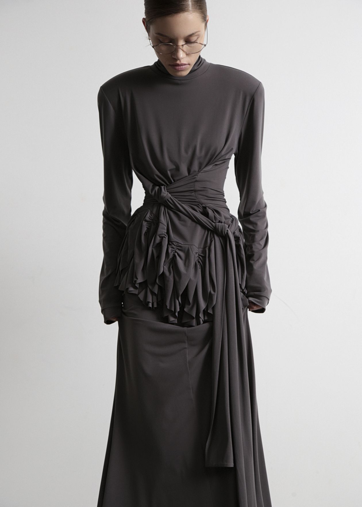 A short dress with voluminous shoulders made of loose-fitting knitwear, a skirt decorated with flounces in the form of petals, 2 wide belts sewn into the side seams.Composition: 70% viscose, 20% elastane, 10% cotton