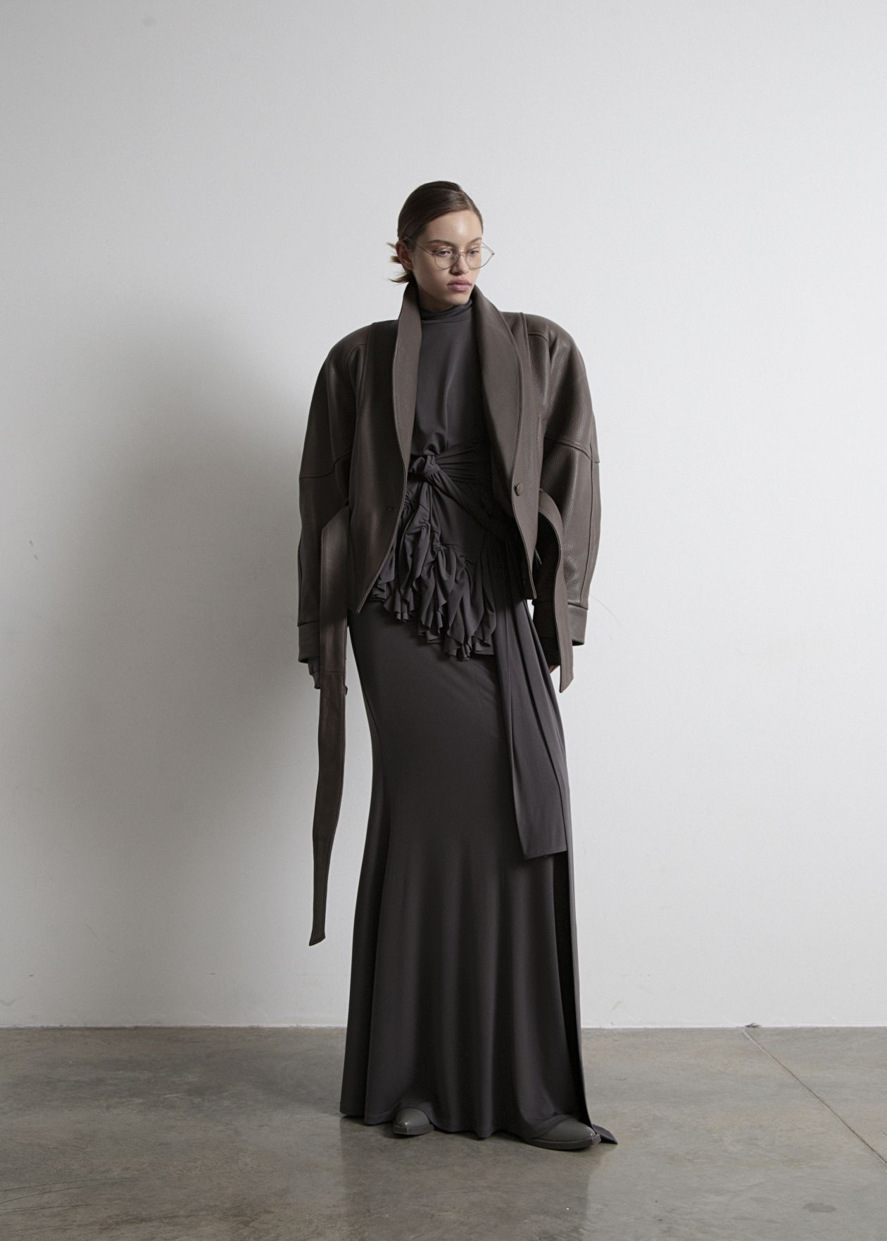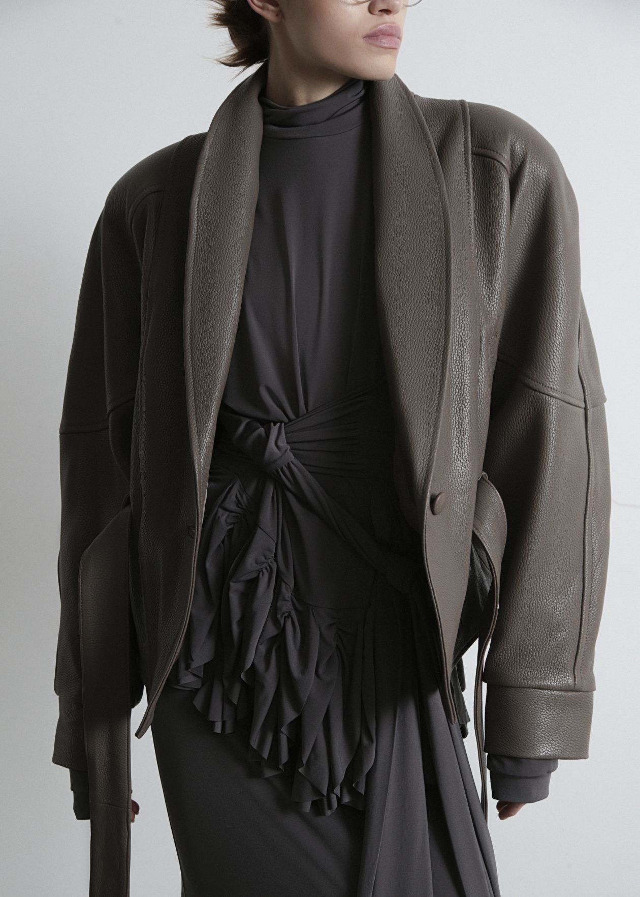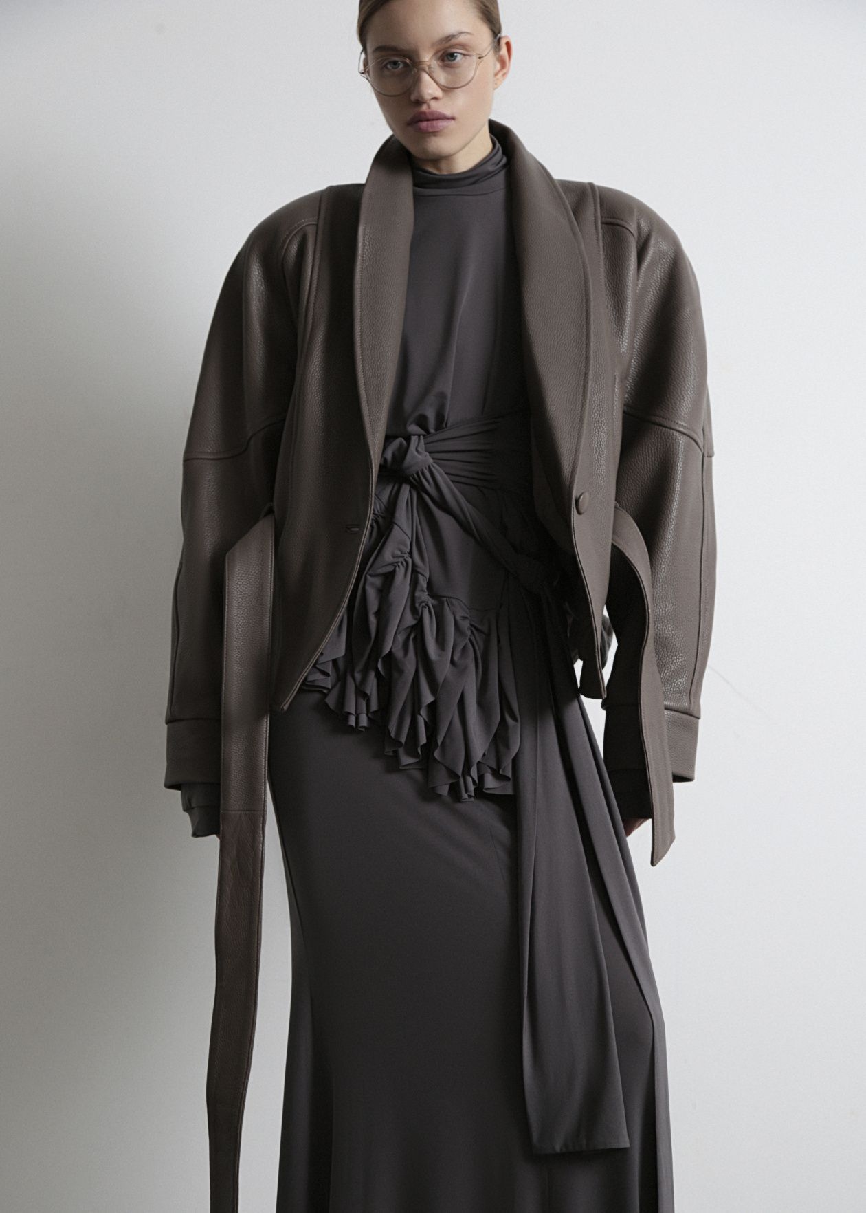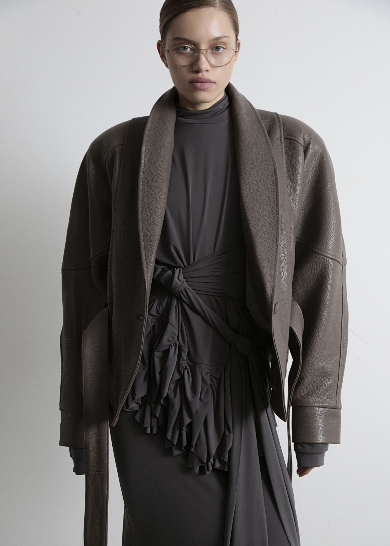 A short dress with voluminous shoulders made of loose-fitting knitwear, a skirt decorated with flounces in the form of petals, 2 wide belts sewn into the side seams.Composition: 70% viscose, 20% elastane, 10% cotton