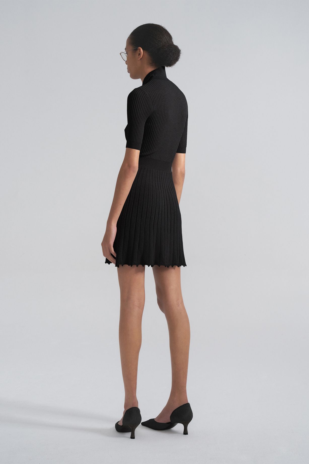 A fitted knit mini dress with a 6-button closure, polo collar, short sleeves, and a pleated skirt.Composition: 85% viscose, 15% nylon