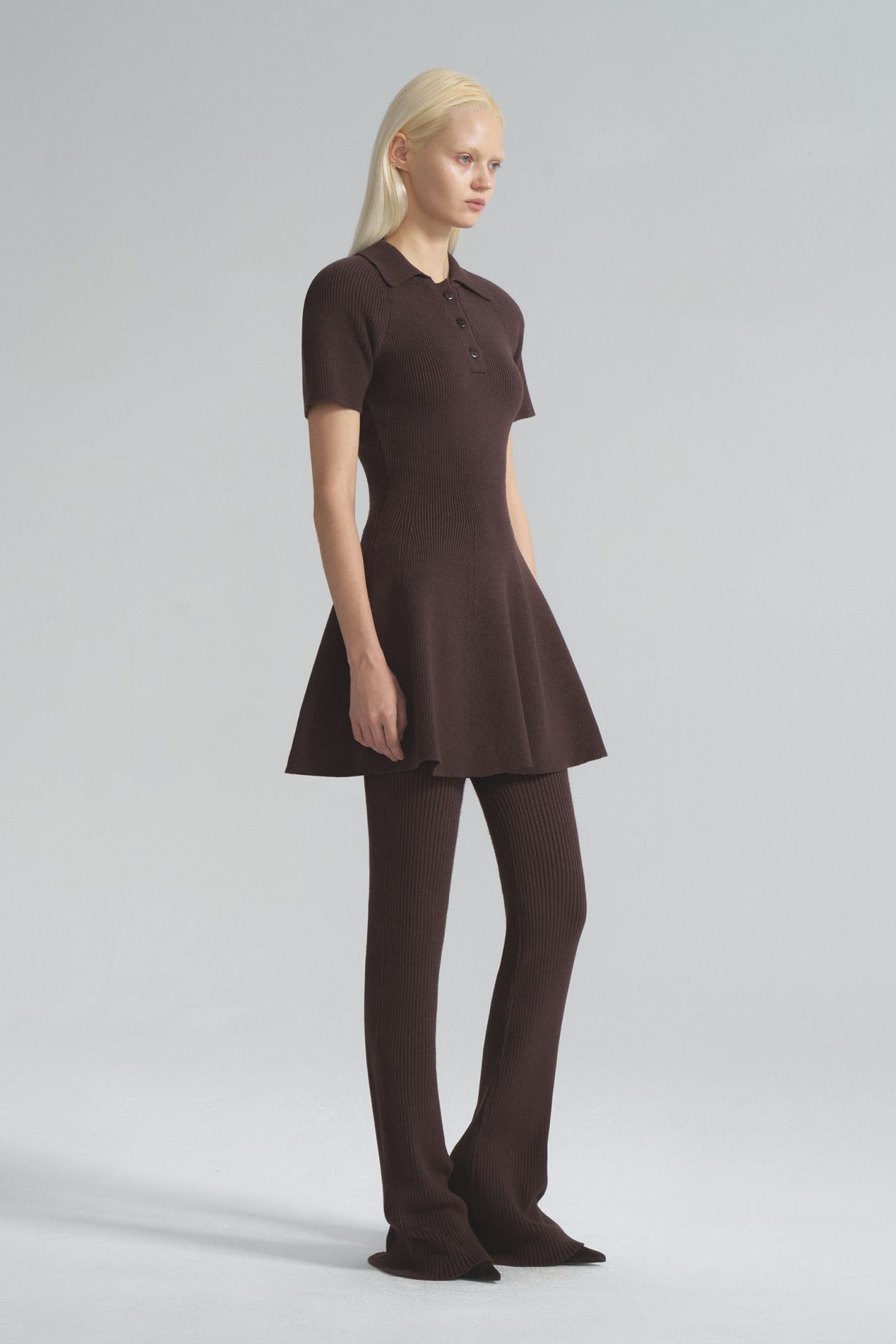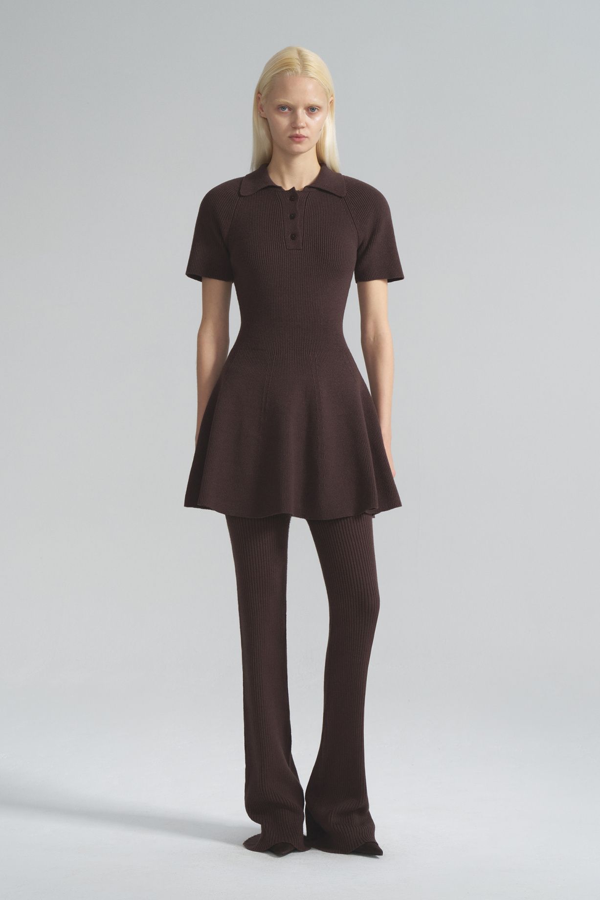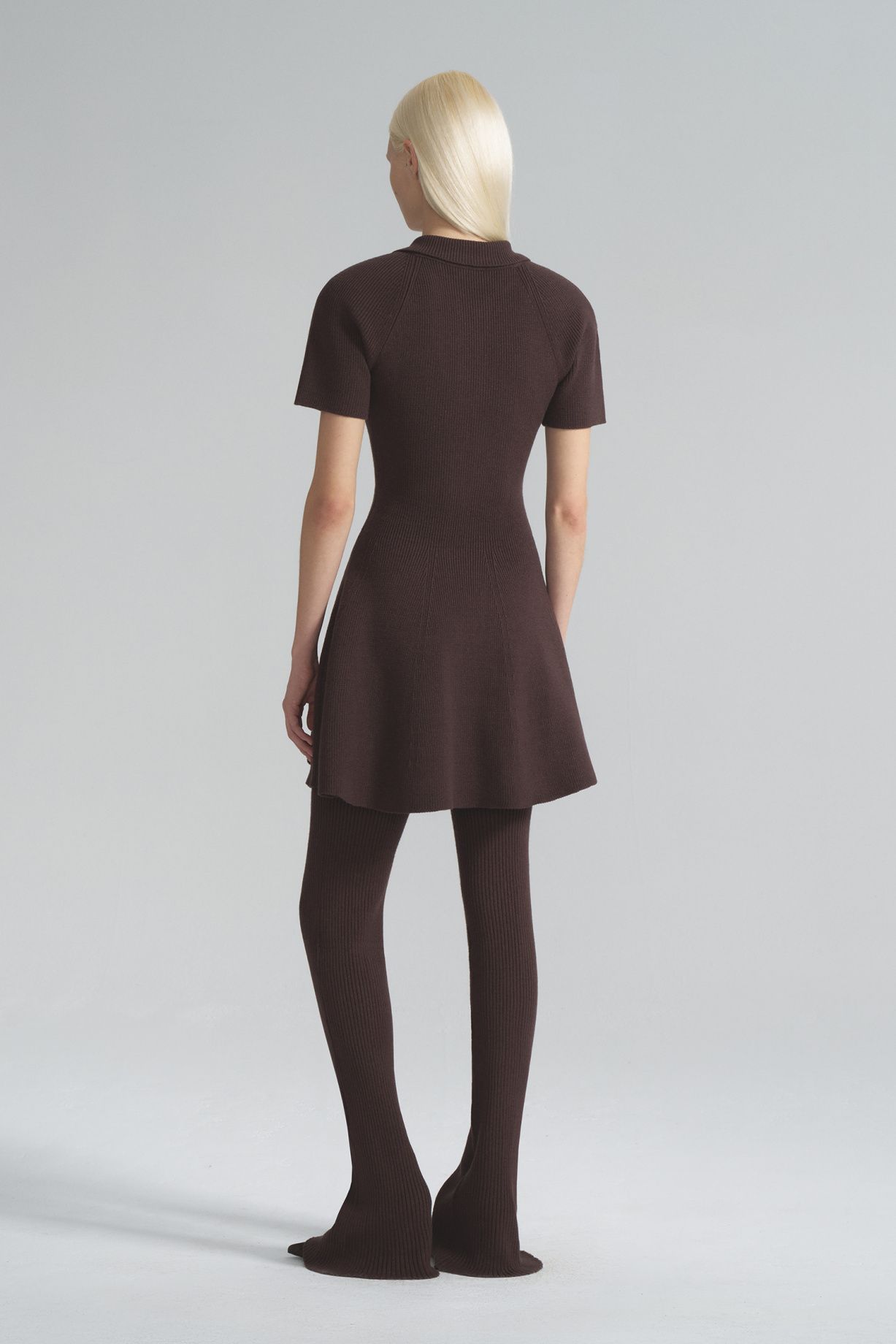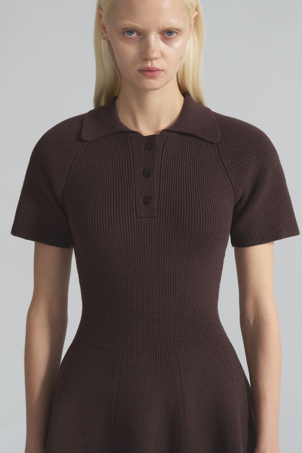 Fitted mini dress with an A-line skirt and short raglan sleeves, which are knitted with wedges. We chose knitwear, which contains viscose, it gives the dress a drape and a breathable structure, and wool adds warmth and comfort. Turn-down polo collar with a button placket. Dress with rib weave, which adds good stretch and elasticity to the product.Composition: 80% viscose, 20% wool