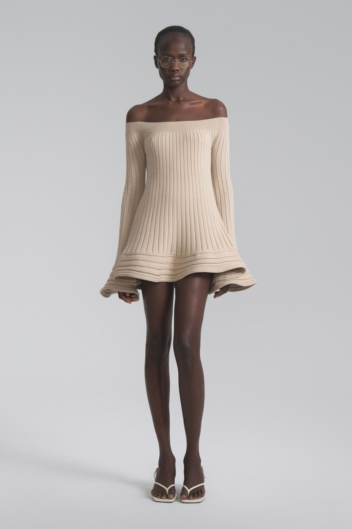A-line mini dress with open shoulders, long sleeves, wide cuffs and bottom of the product in the form of a wave with transverse knitting, creating spectacular volume and elasticity.Composition: 72% viscose, 28% elastane