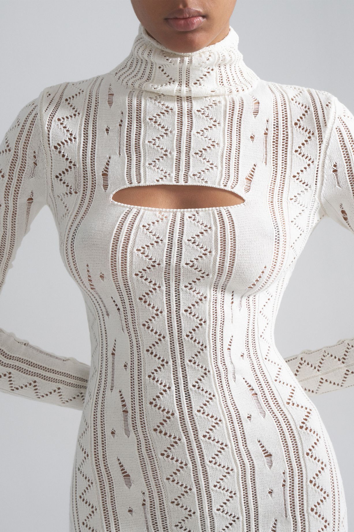 The mini dress is made of high-quality Italian knitwear. Viscose adds softness and drape, while elastane adds elasticity, ensuring a perfect fit. The lace design, long sleeves and neckline add femininity and sophistication to the dress, making it perfect for special occasions.Composition: 91% Viscose, 9% Elastane