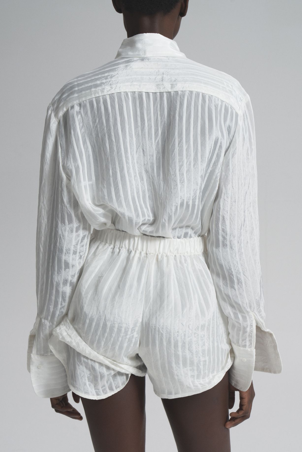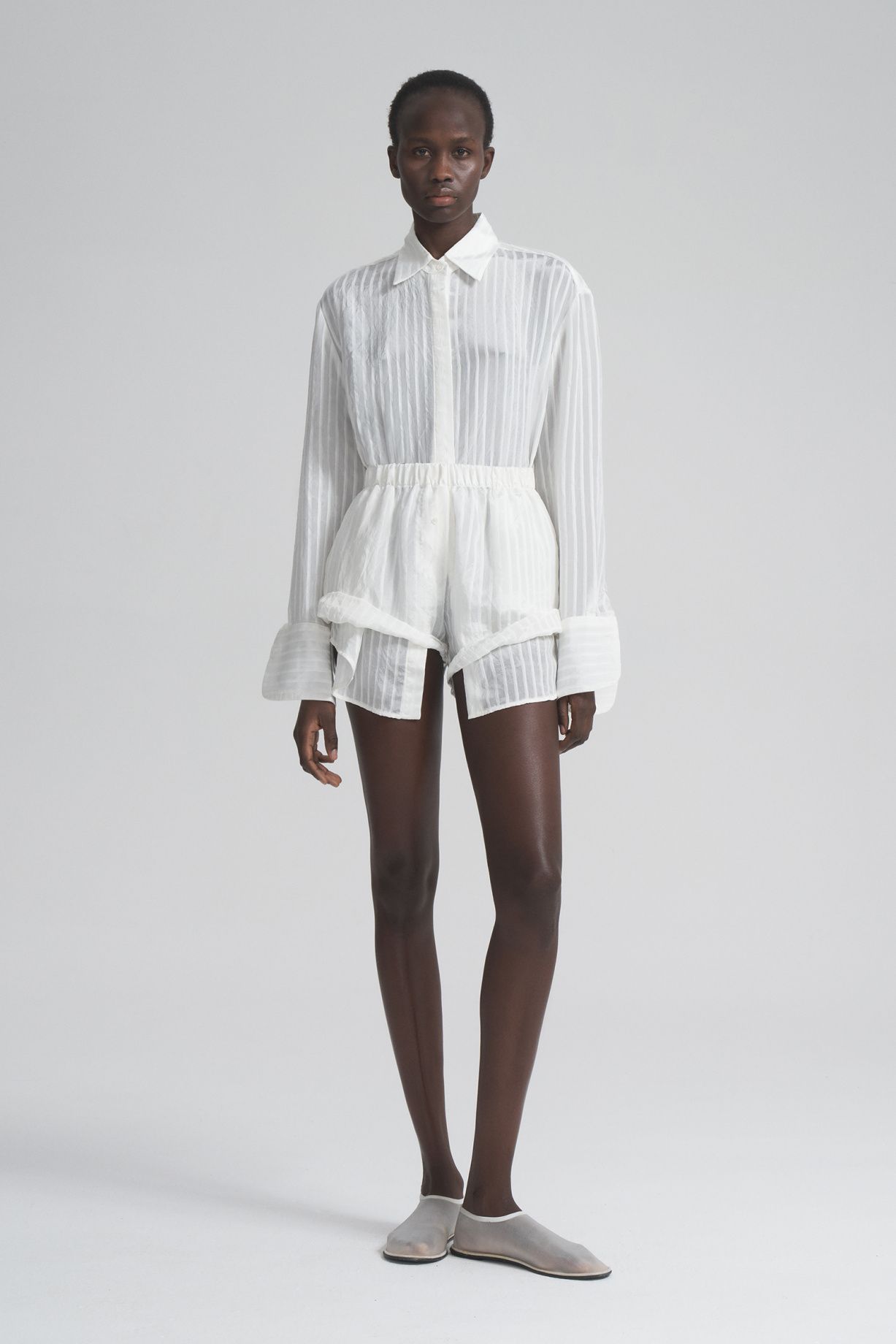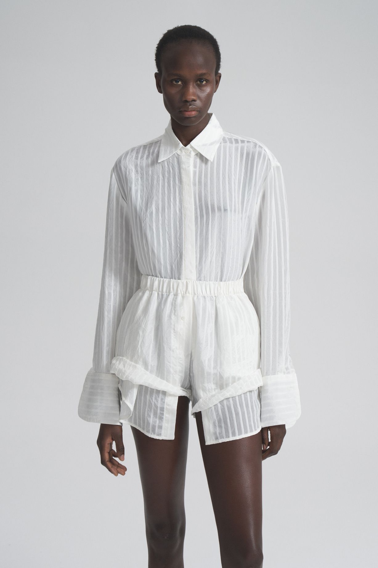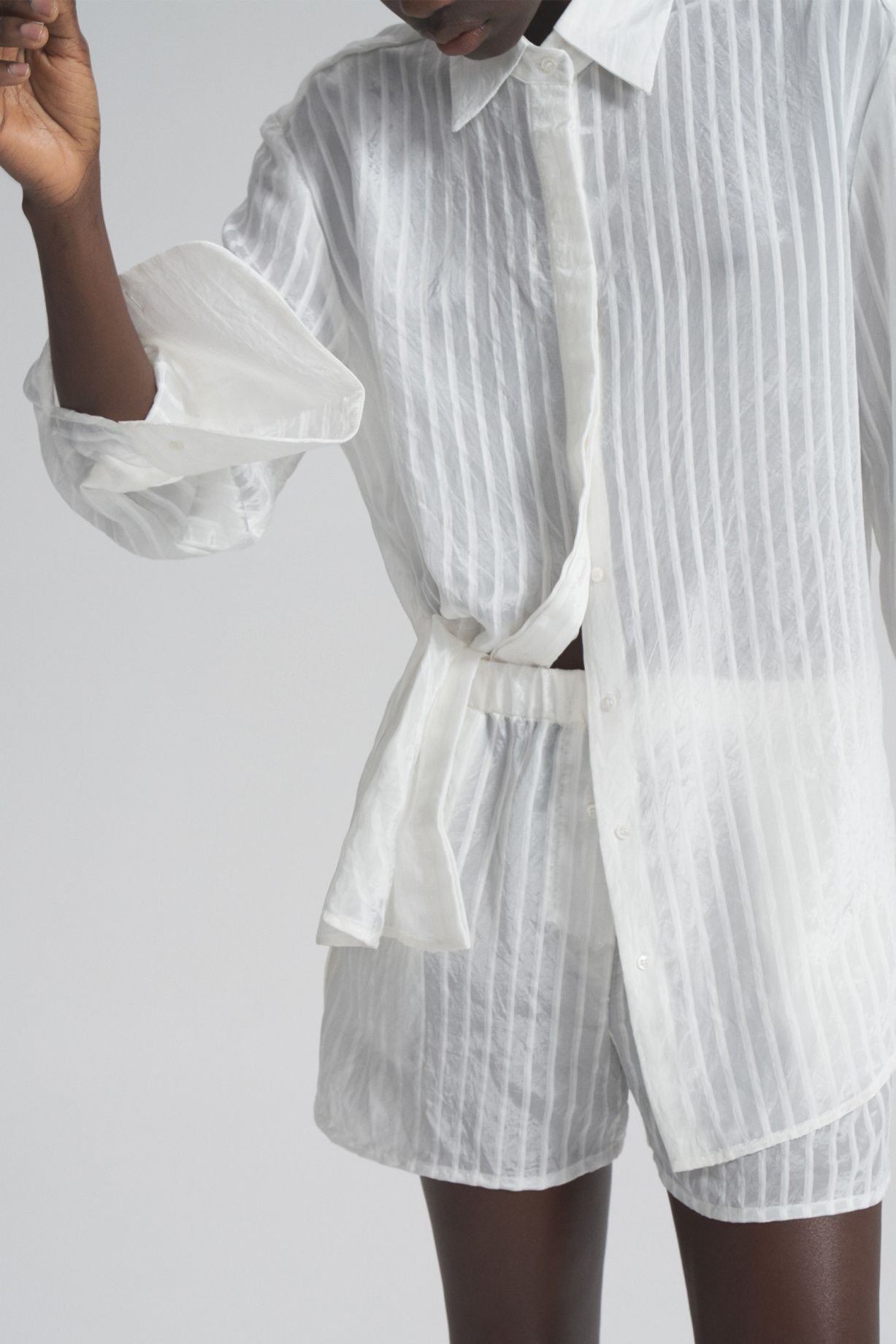 A viscose pajama suit. A classic-cut shirt with one chest pocket and mini shorts with elastic band and pockets.Composition: 81% viscose, 19% nylon