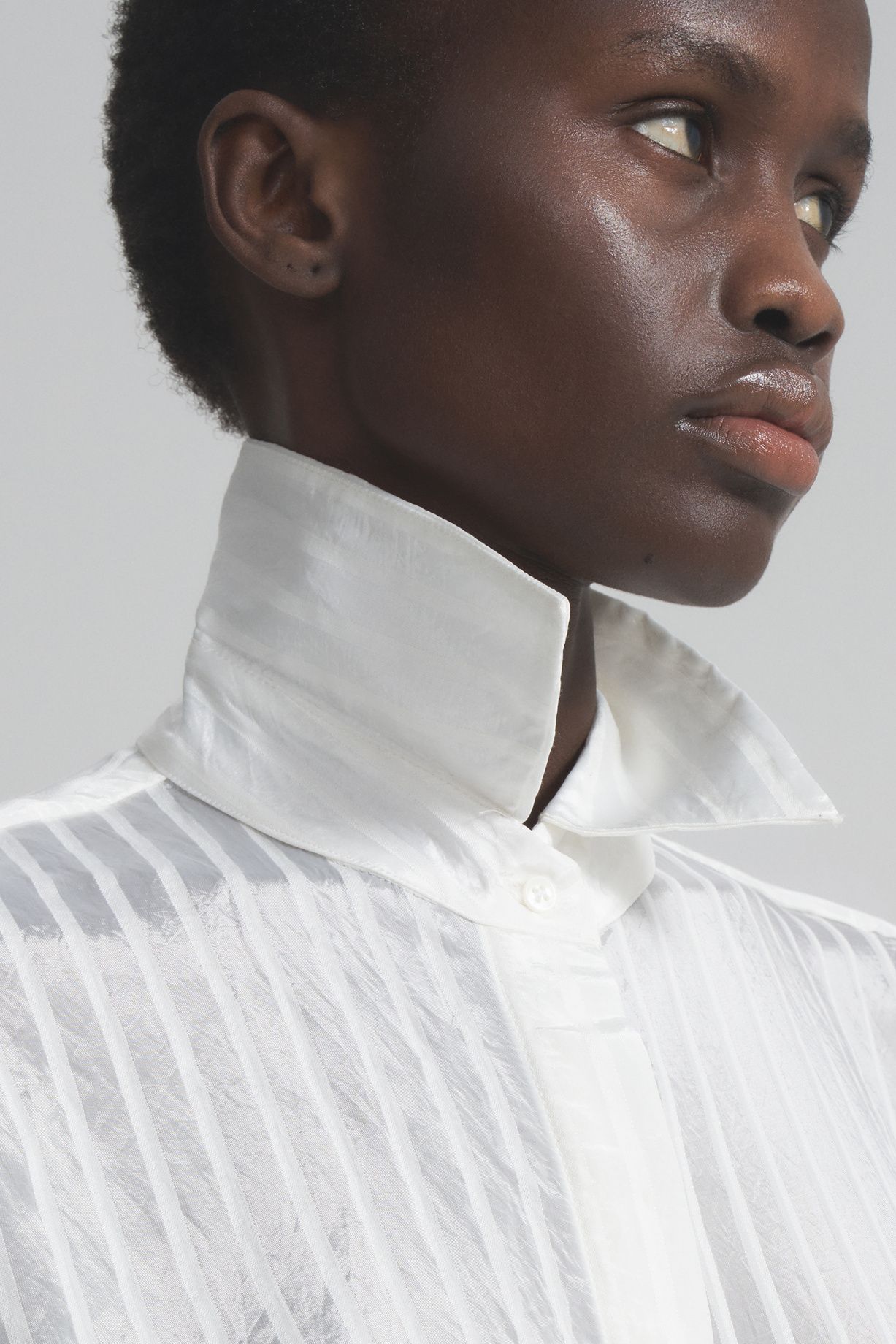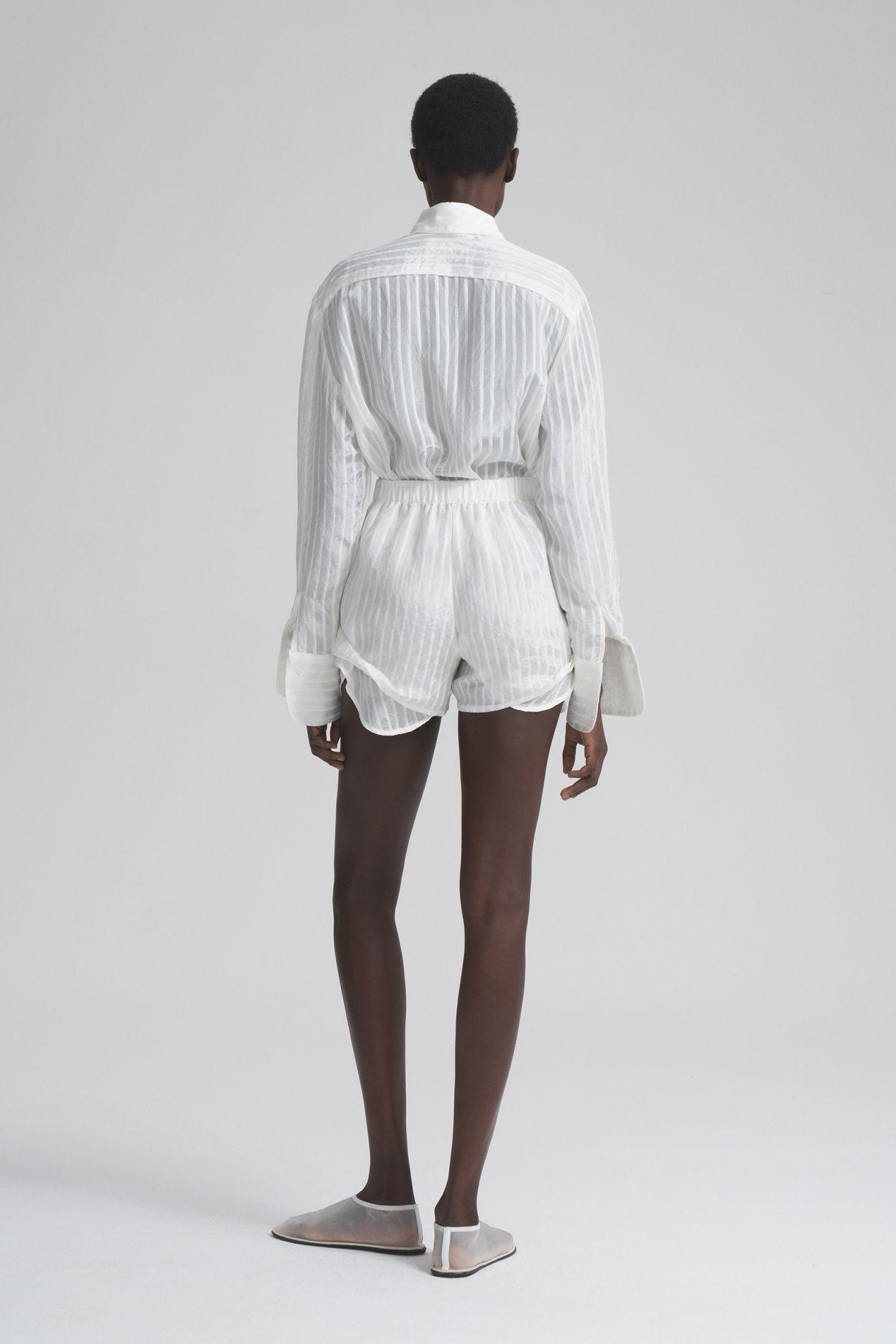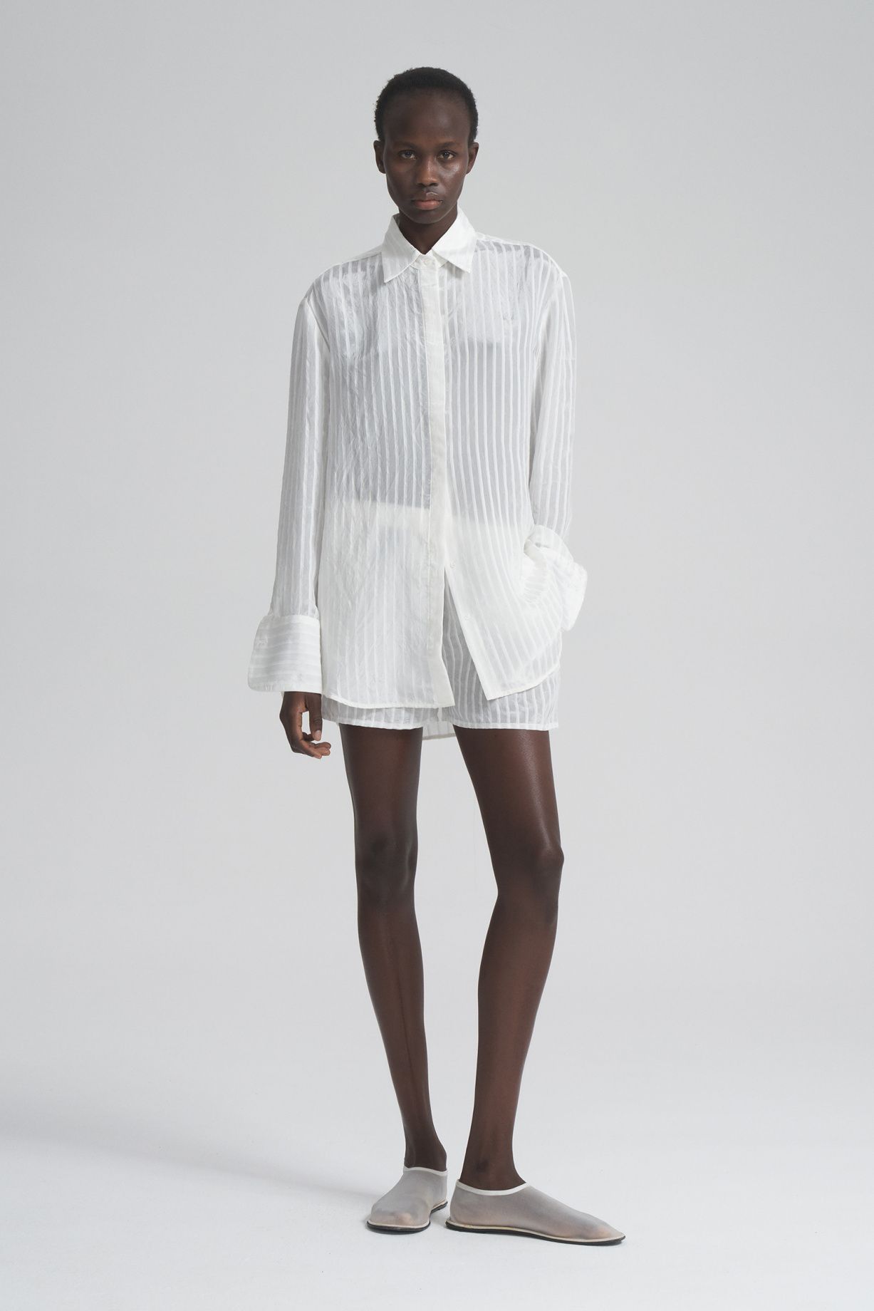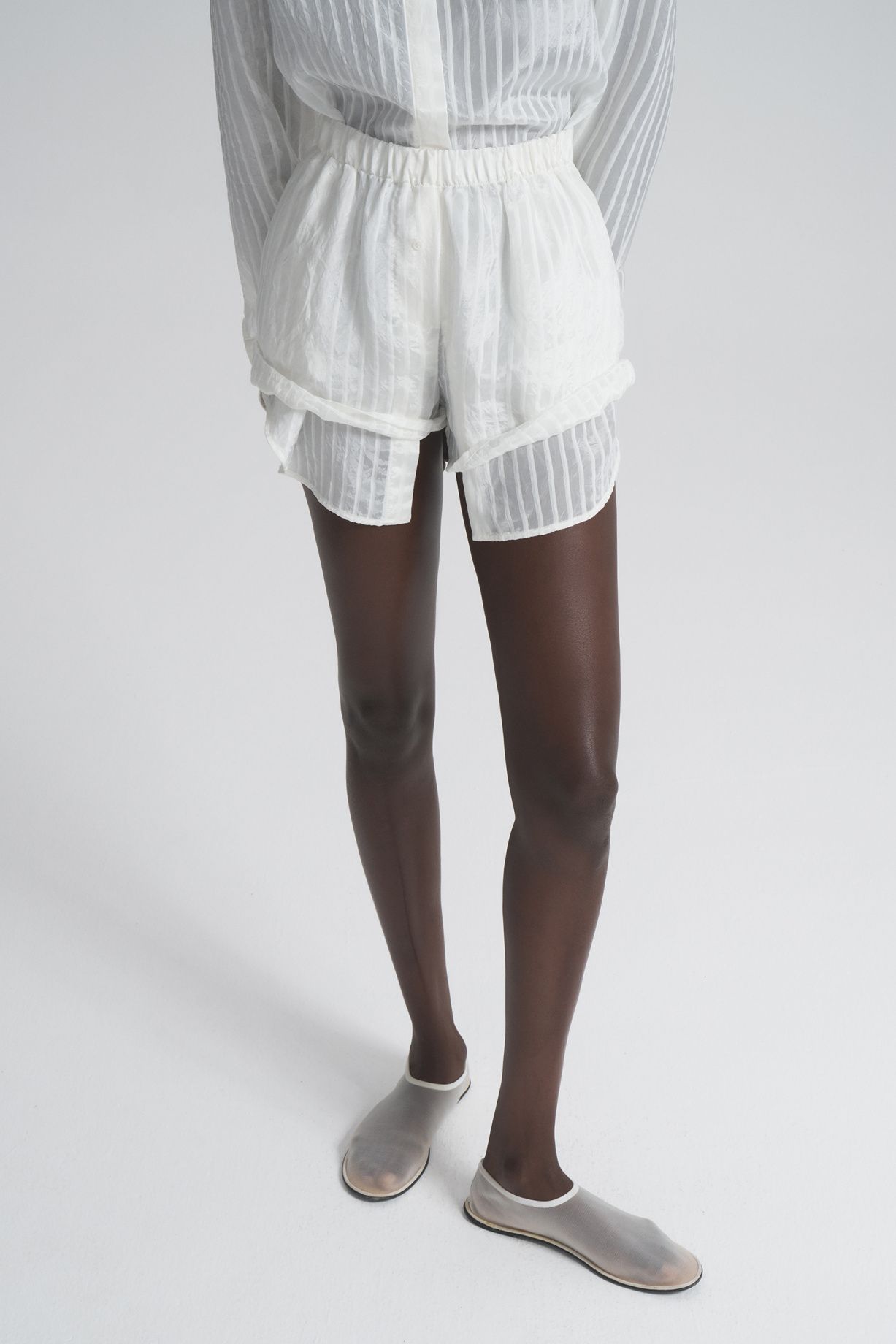 A viscose pajama suit. A classic-cut shirt with one chest pocket and mini shorts with elastic band and pockets.Composition: 81% viscose, 19% nylon