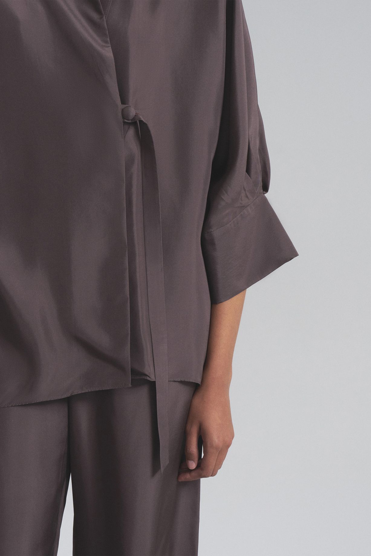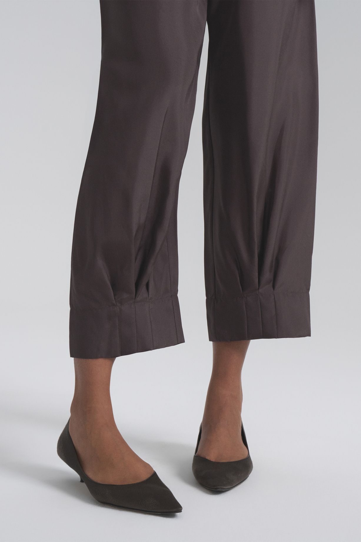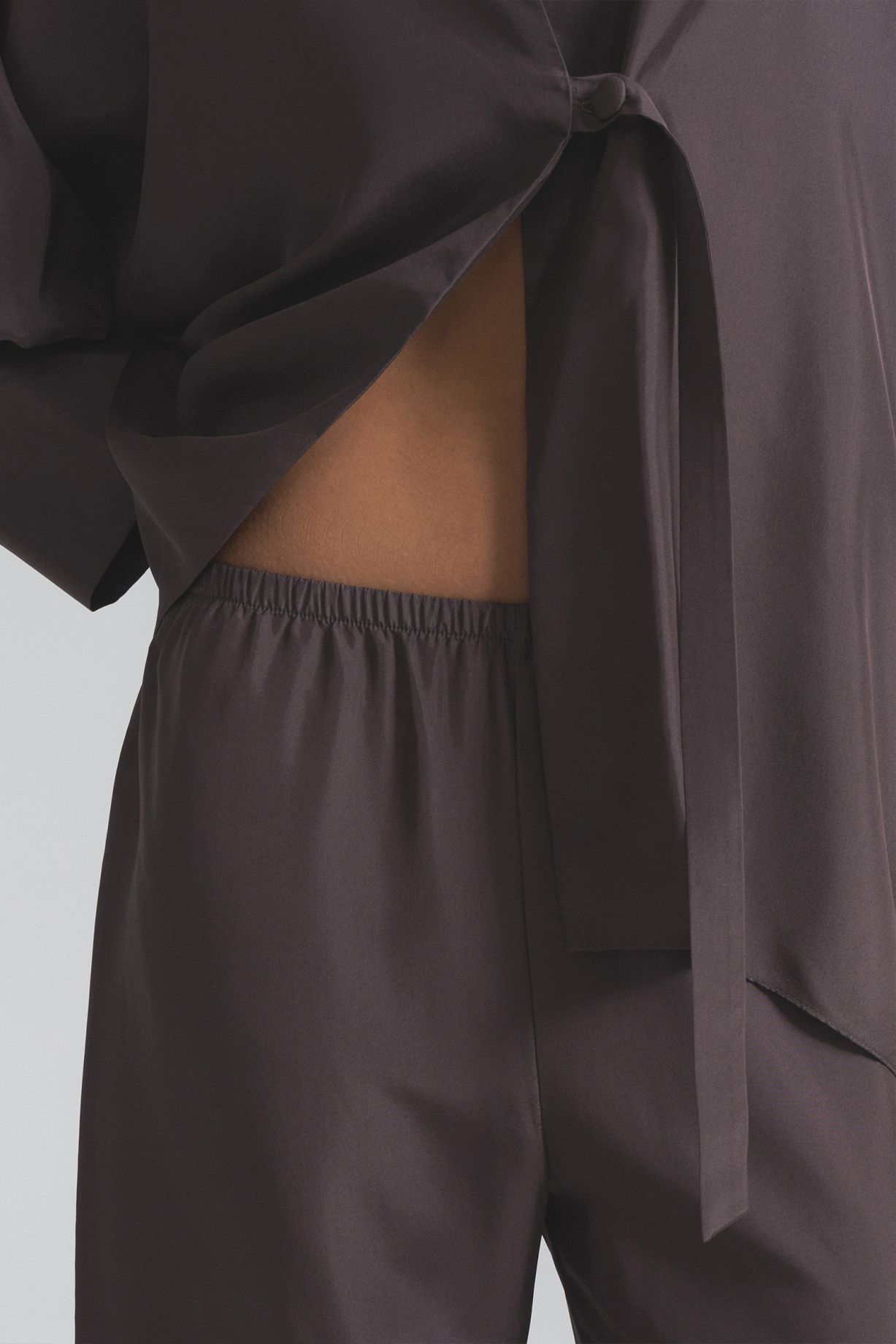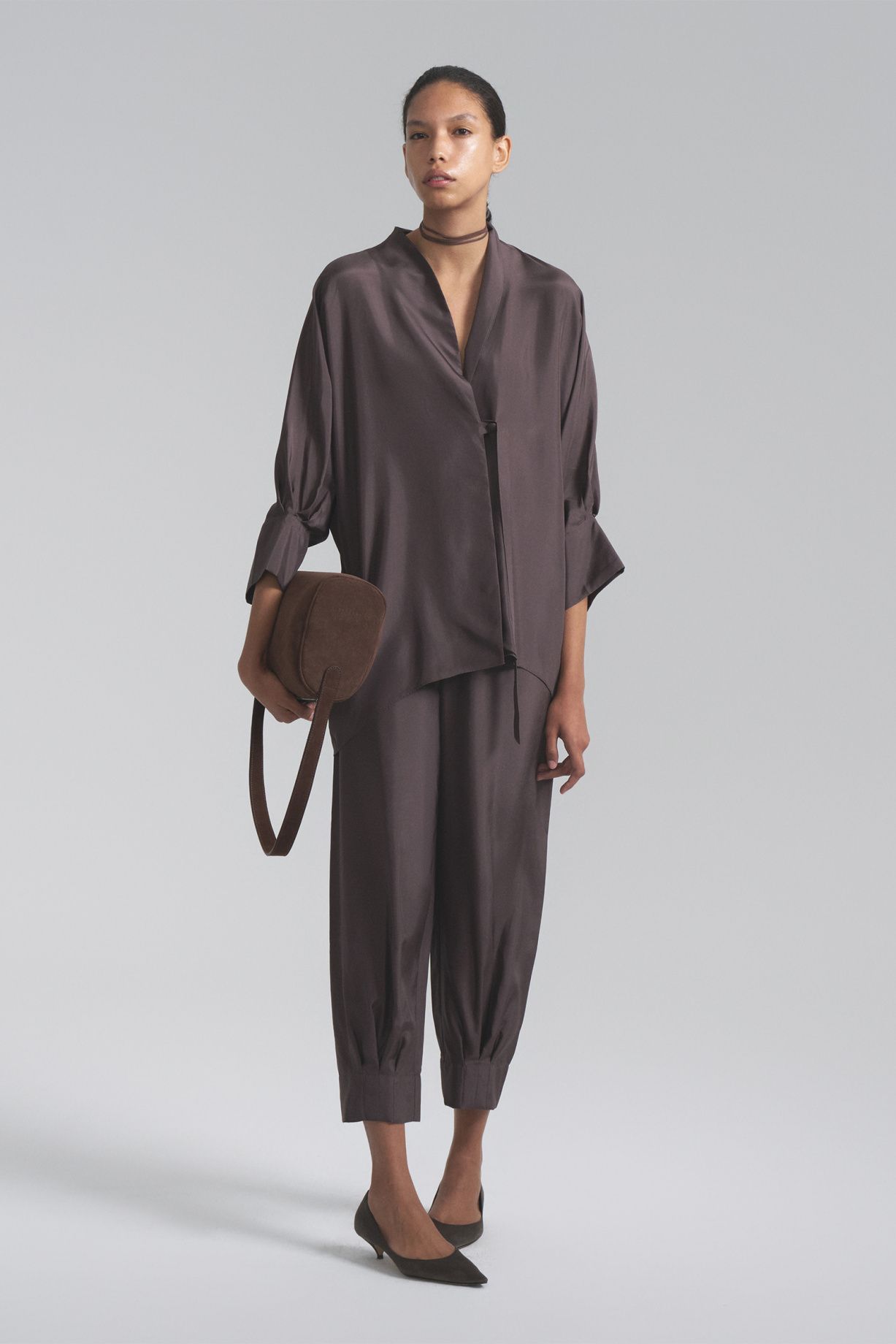 A pajama set made of natural silk, with an elongated top featuring a one-piece sleeve and collar. The sleeves are complemented by pleats and cuffs, adding a touch of light volume. The trousers have a thoughtful cut, without a side seam, with decorative pleats along the bottom of the front half. They are held up by an elastic band.Composition: 100% silk