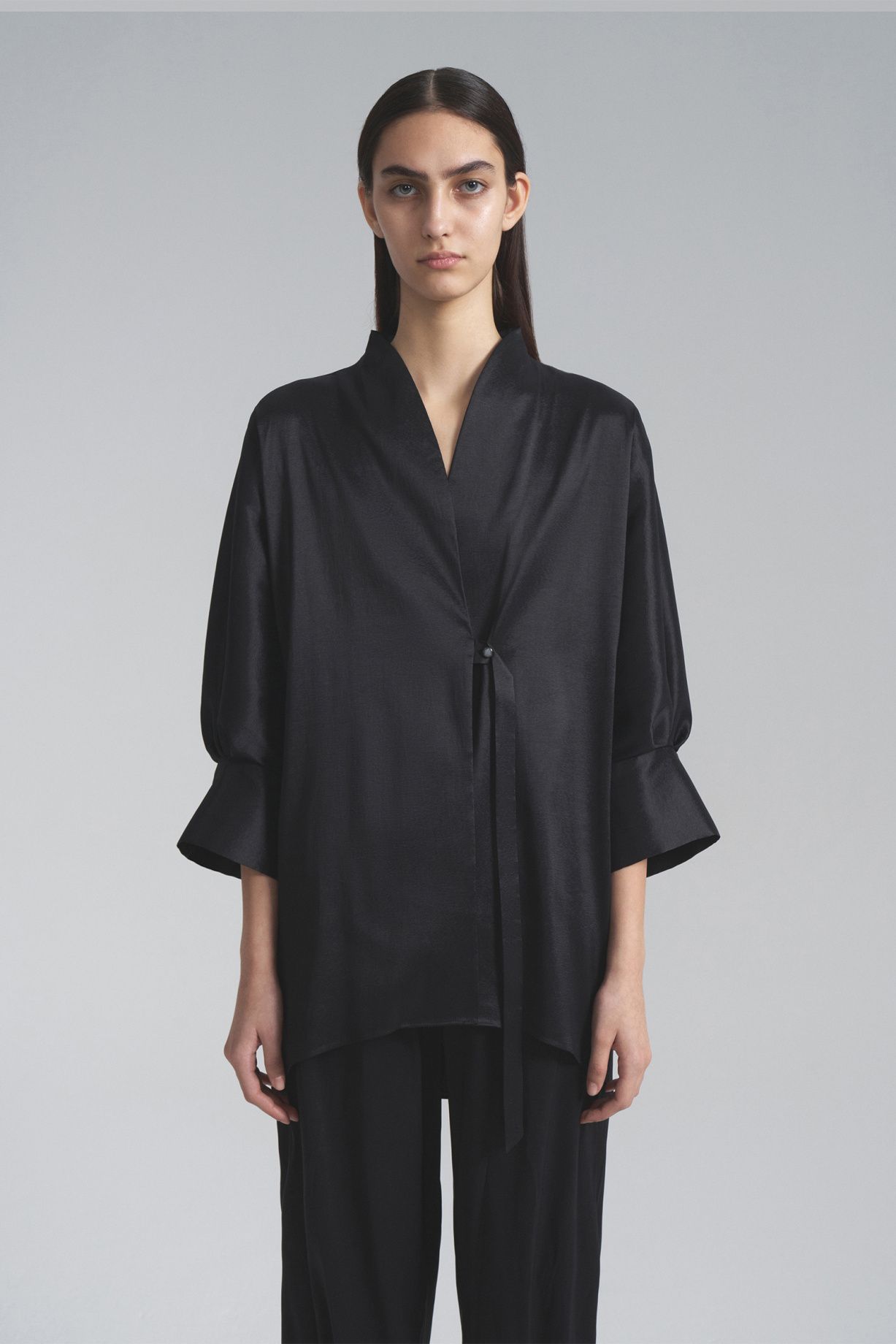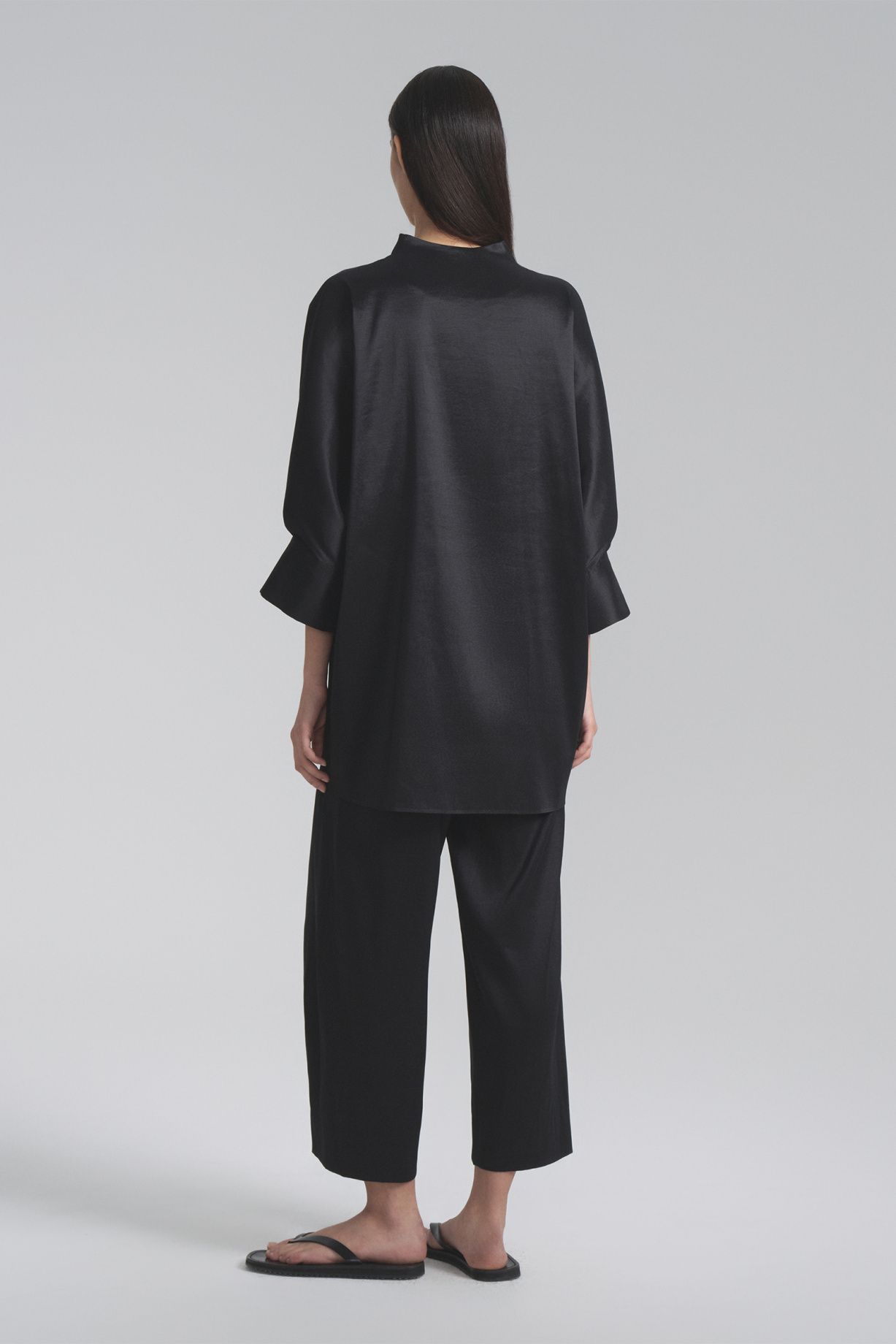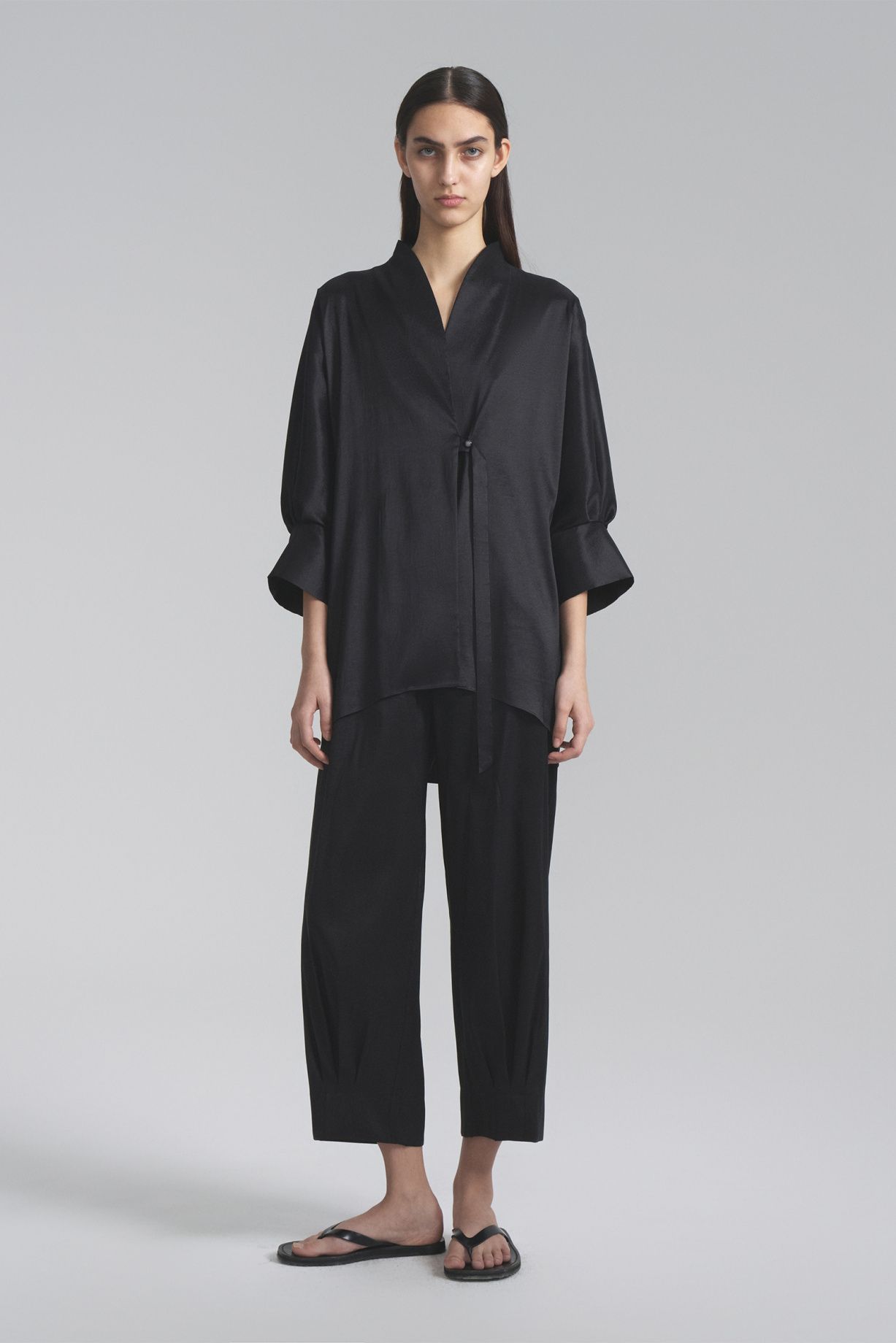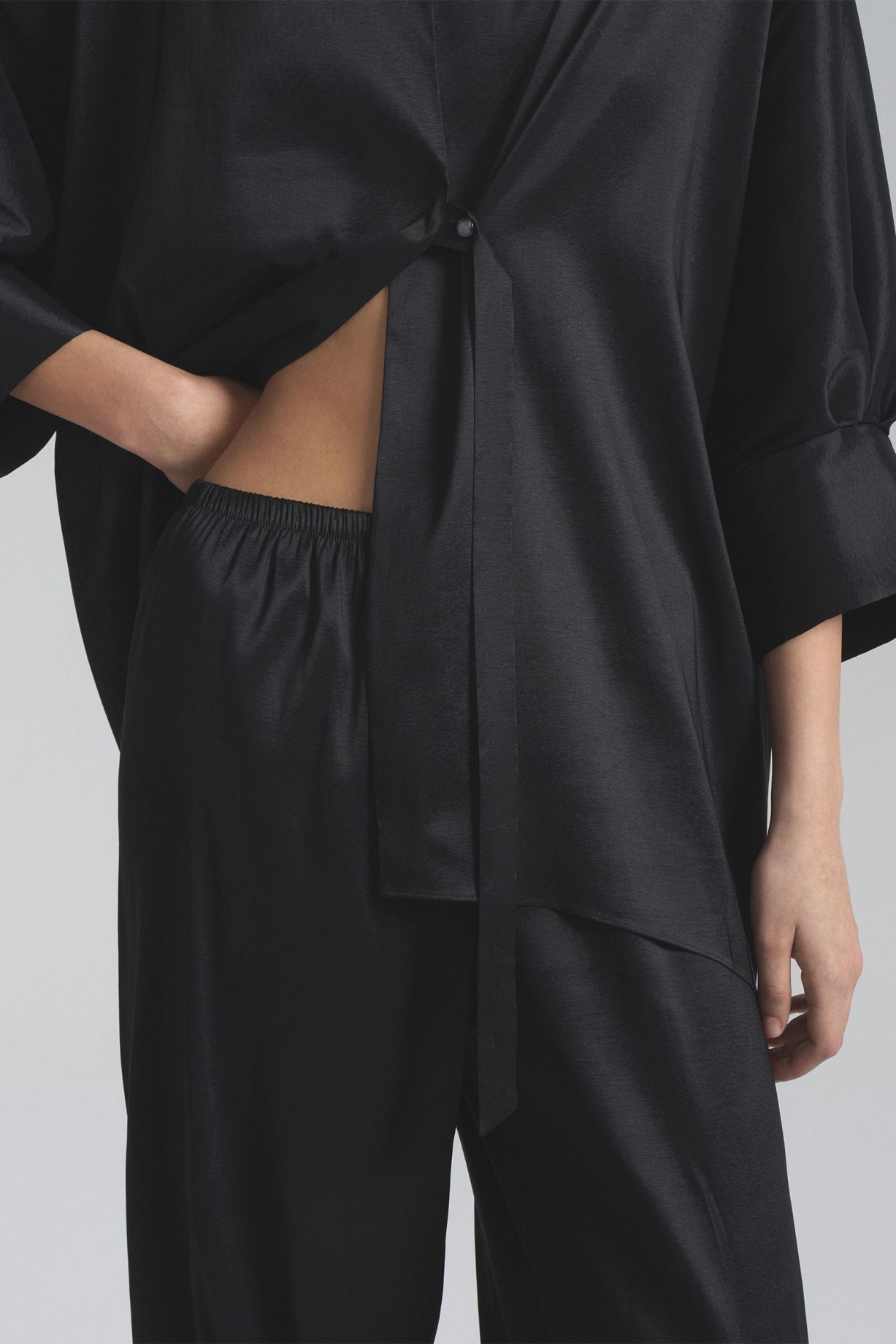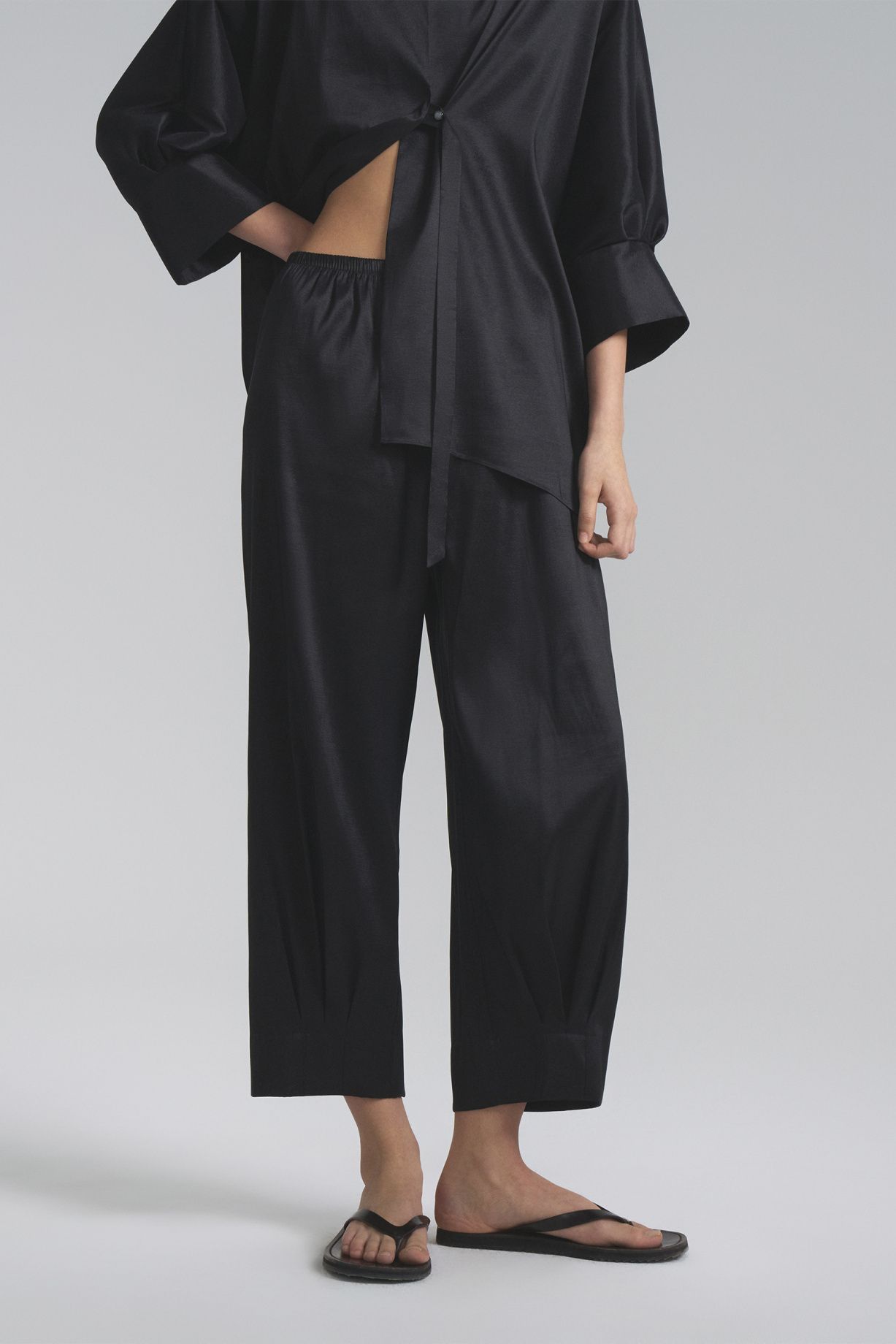 Taffeta pajama sets are a long-sleeved top with a collar and one-piece design. The sleeves are complemented by pleats and cuffs, creating a light and voluminous look. The trousers have a thoughtful cut without a side seam, with decorative pleats on the bottom front half and an elastic band.Composition: 65% viscose 23% nylon 12% lycra