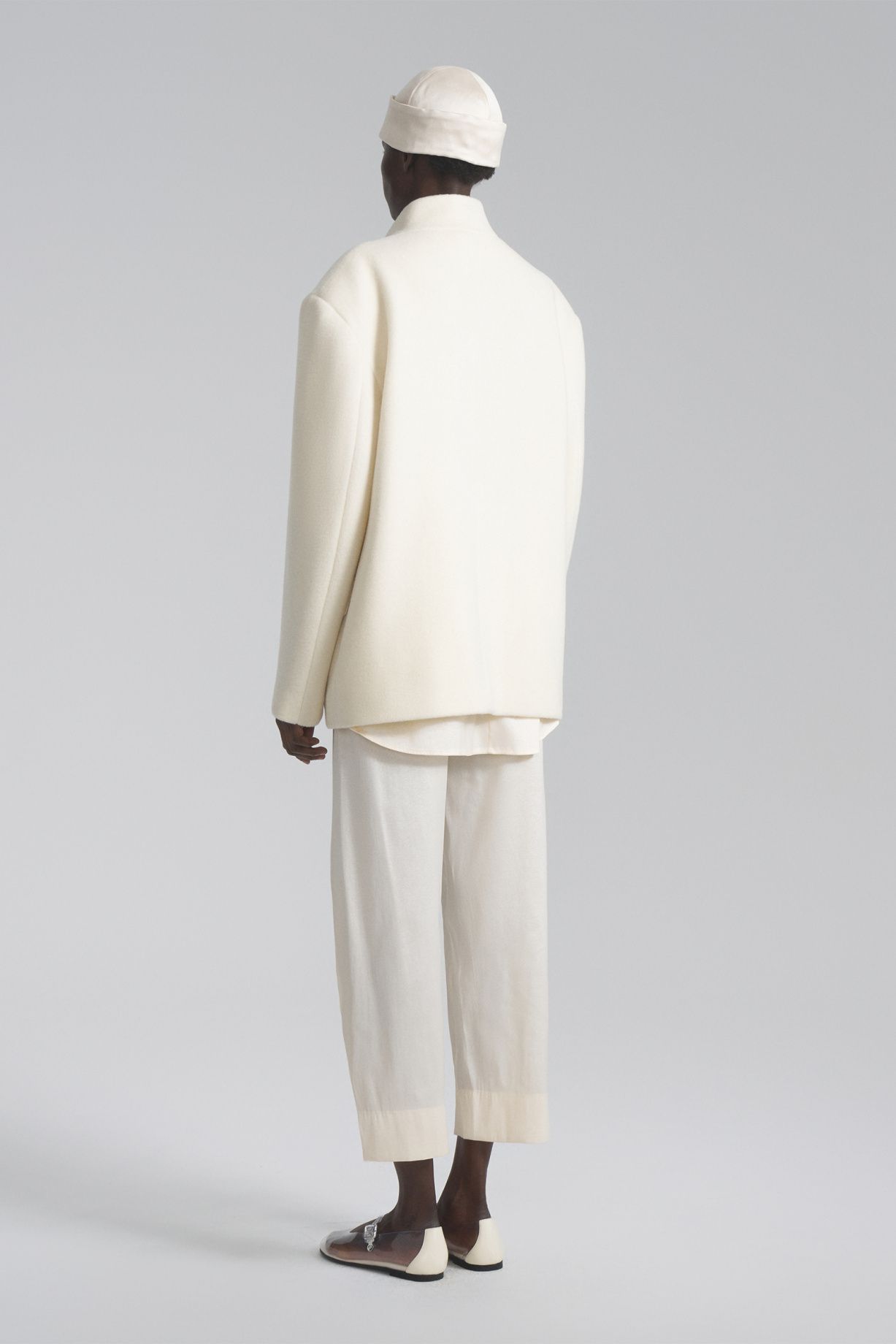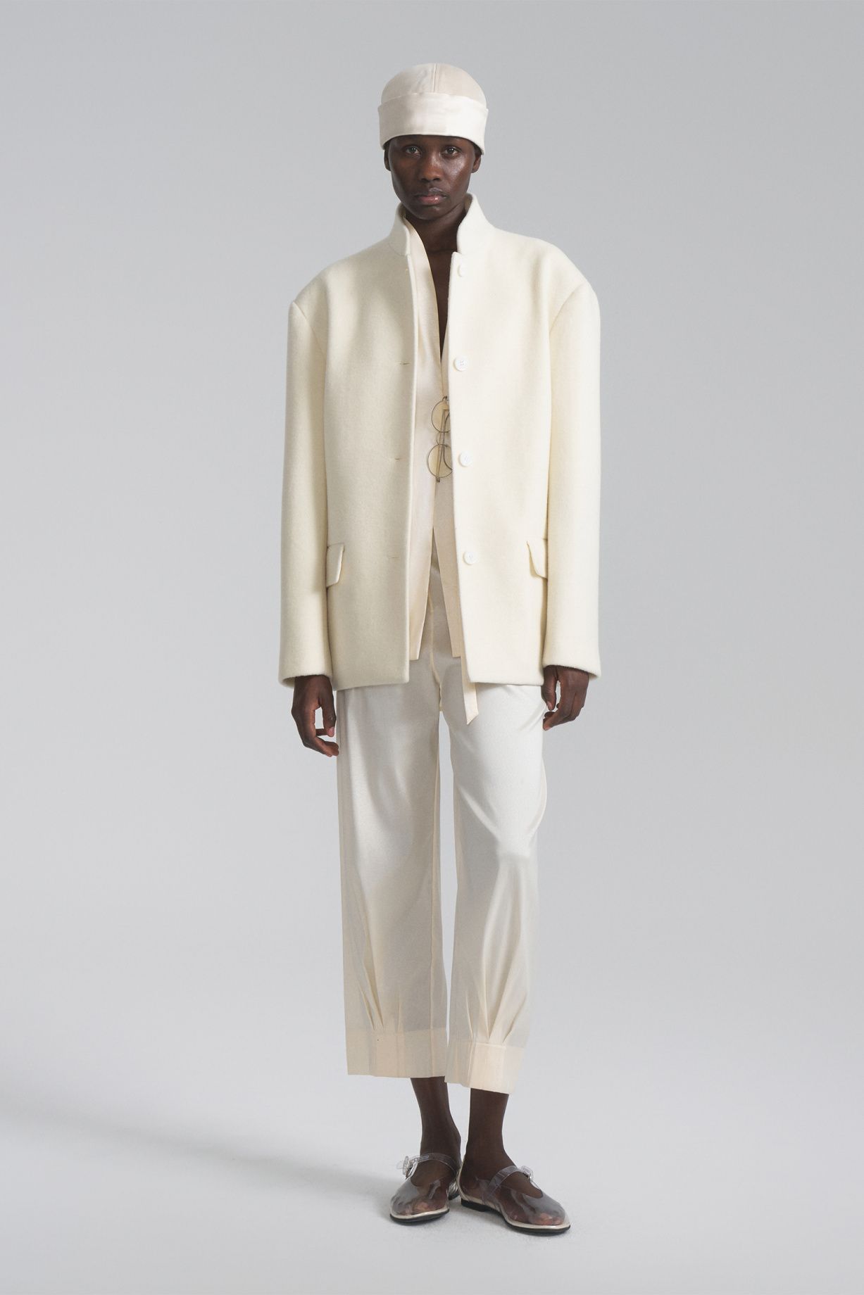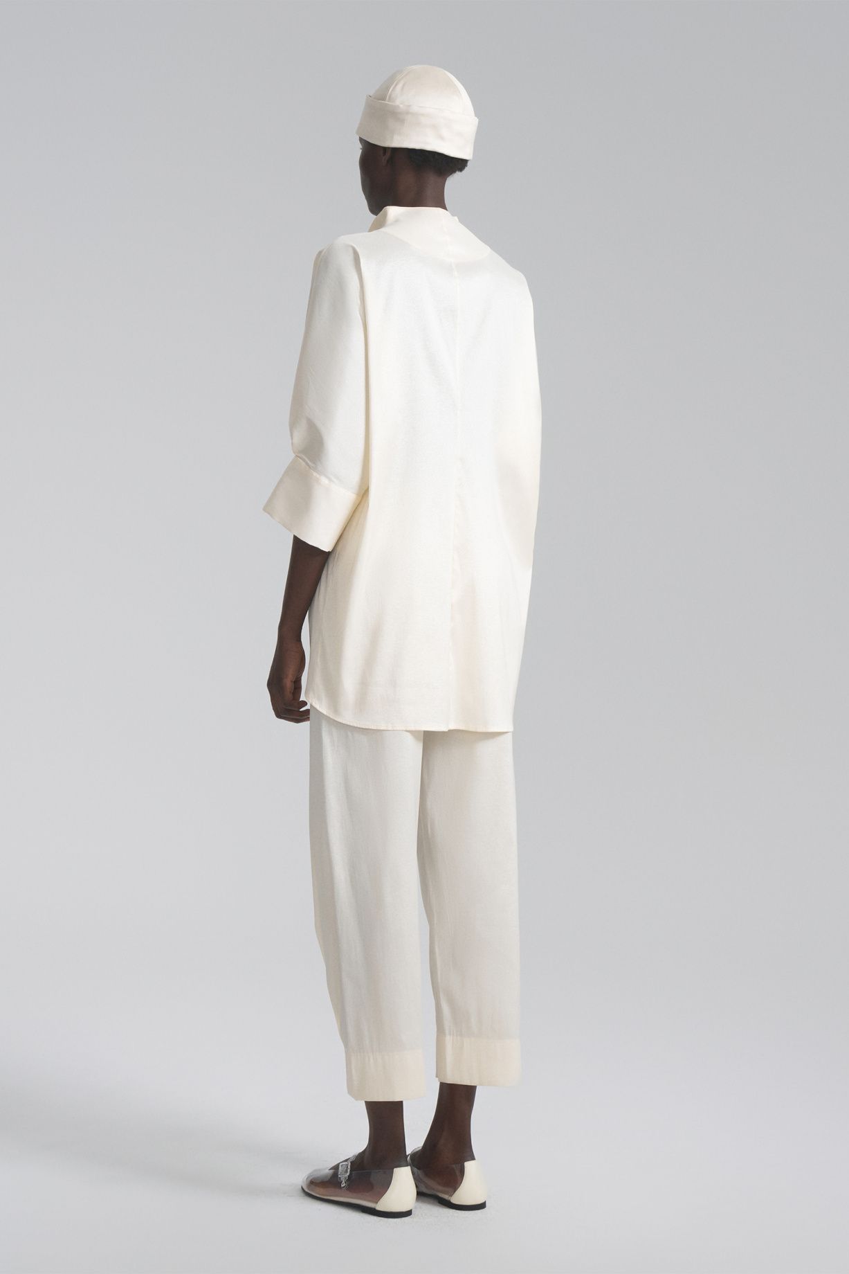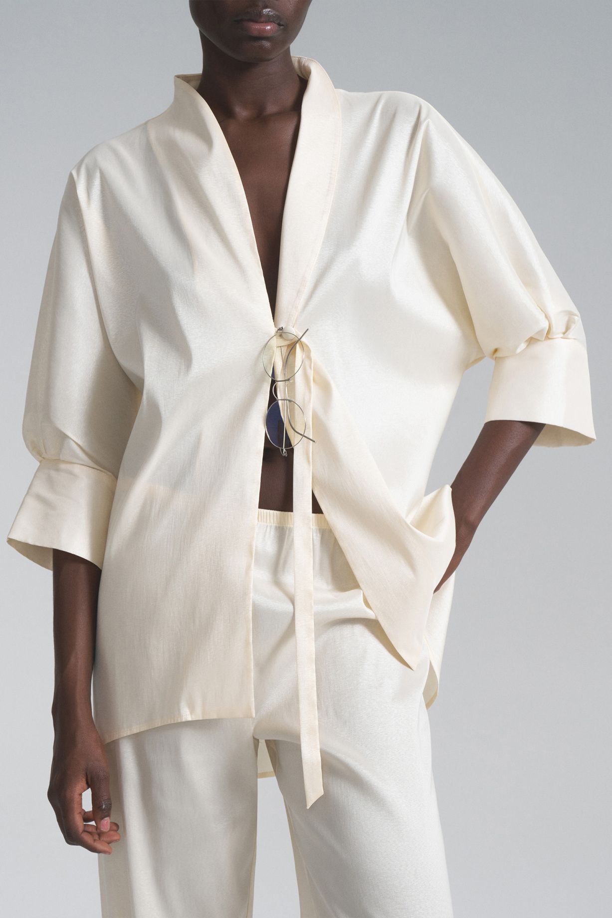 Taffeta pajamas are an elongated blouse with a one-piece sleeve and collar, the sleeve is complemented with pleats and cuffs for a light volume. Thoughtful cut of trousers without a side seam with decorative pleats at the bottom of the front half, on an elastic band.Composition: 65% viscose, 23% nylon, 12% lycra