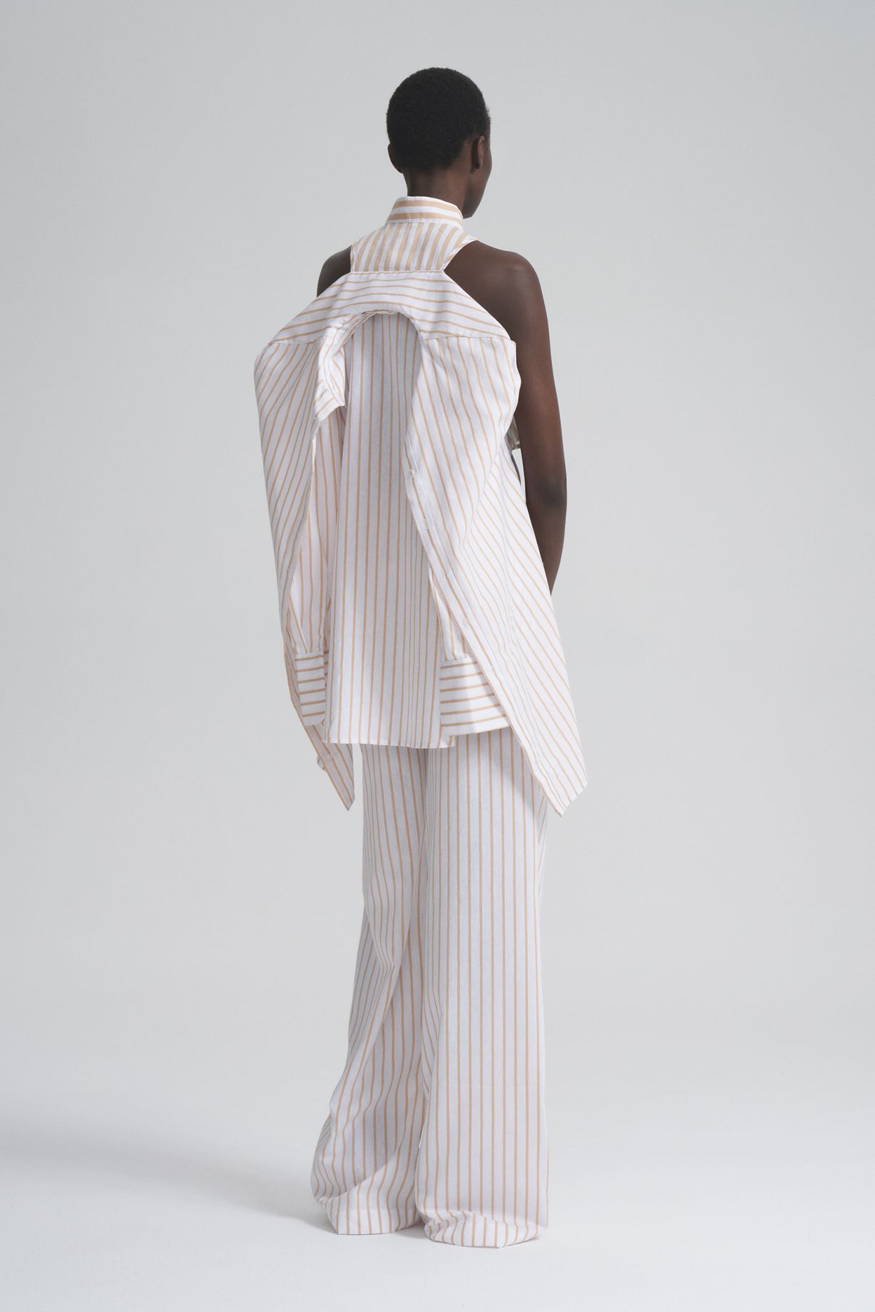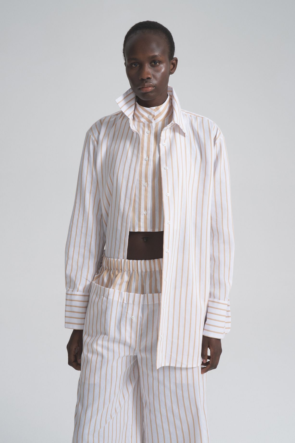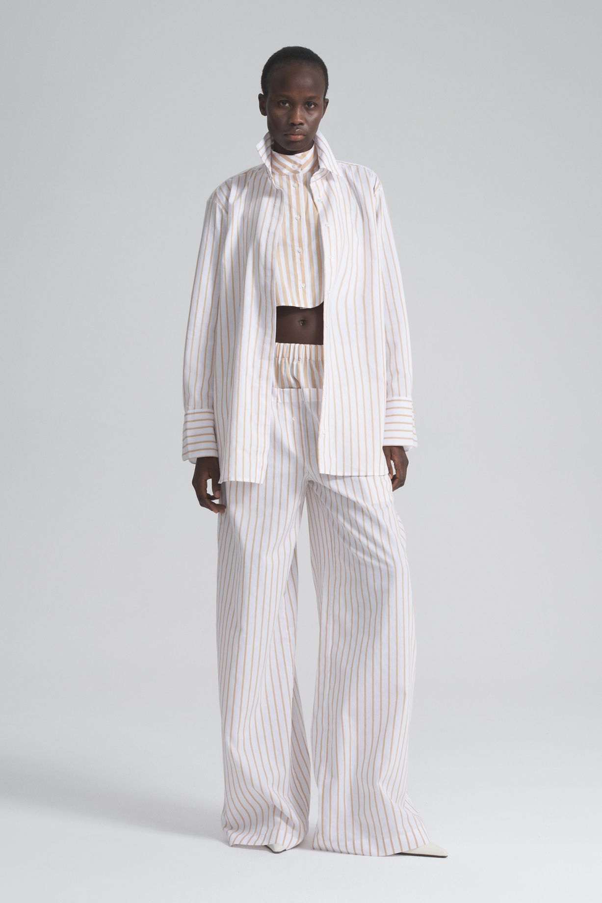 A pajama suit with a unique shirt cut - you can choose a convenient styling option, trousers with a contrasting belt.Composition: 90% cotton, 10% rayon