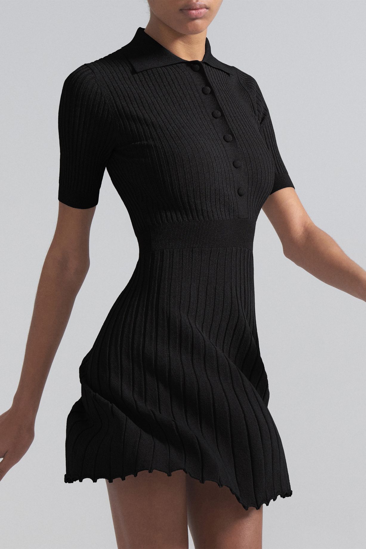 A fitted knit mini dress with a 6-button closure, polo collar, short sleeves, and a pleated skirt.Composition: 85% viscose, 15% nylon